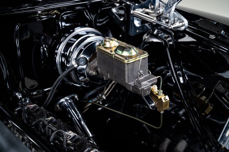 The body was taken through a ground-up restoration and finished in deep, jet-black two-stage paint that gives the truck a formal, tuxedo-like presence. Panel fit is excellent throughout, with straight body lines and clean gaps that far exceed factory standards. Restored chrome adds crisp contrast, while details like the cab visor, LED lighting, and retractable Nomad-style tailgate cable tethers sharpen the truck's finished look. The stance is dialed in on 15" steel wheels wrapped in BFGoodrich Silvertown Radials with wide whitewalls, giving the truck undeniable curb appeal. Out back, the finished oak bed floor with polished stainless slats delivers classic style with durability to match.