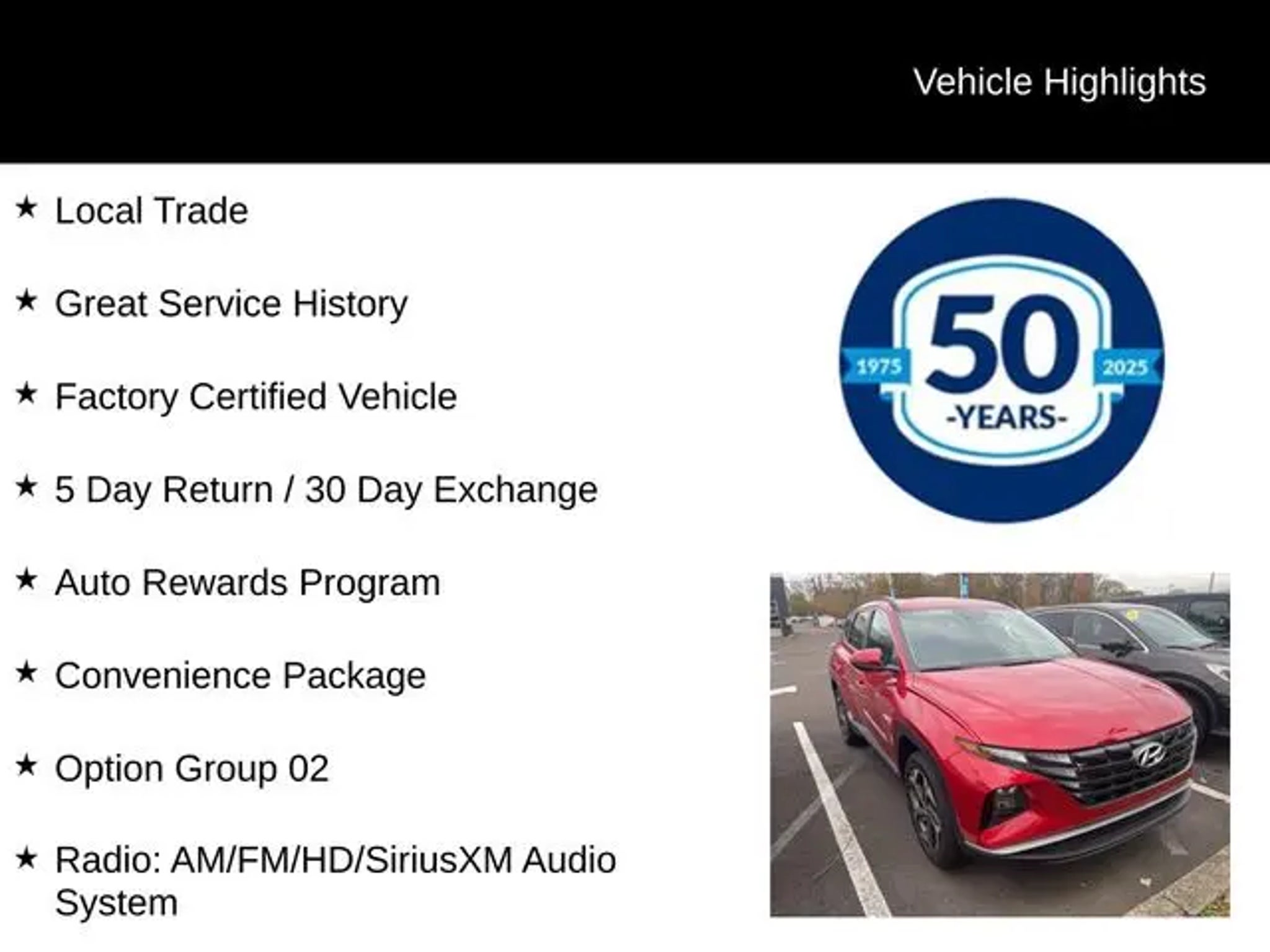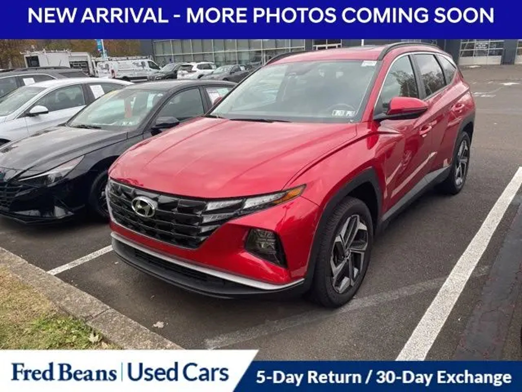 Recent Arrival! 2023 Hyundai Tucson SEL SEL 2.5L I4 DGI DOHC 16V LEV3-ULEV70 187hp 8-Speed Automatic with SHIFTRONIC AWD 4D Sport Utility Calypso Red Local Trade, Great Service History, Factory Certified Vehicle, 5 Day Return / 30 Day Exchange, Auto Rewards Program, AWD, 10.25 Digital Instrument Cluster, Apple CarPlay & Android Auto, Auto High-beam Headlights, Convenience Package, Dual Automatic Temperature Control, H-Tex Seat Trim, Heated door mirrors, Heated front seats, Illuminated entry, Leather-Wrapped Shift Knob, Leather-Wrapped Steering Wheel, Option Group 02, Power door mirrors, Power driver seat, Power Liftgate, Power Sunroof, Radio: AM/FM/HD/SiriusXM Audio System, Remote keyless entry, Steering wheel mounted audio controls, Turn signal indicator mirrors, Wheels: 19 x 7.5J Machine-Face Finish Alloy. CARFAX One-Owner. Odometer is 6725 miles below market average! Certified. Hyundai Certified Used Vehicles Details: * Includes 10-year/Unlimited Mileage Roadside Assistance with Rental Car and Trip Interruption Reimbursement; Please See Dealers for Specific Vehicle Eligibility Requirements. 10-Year/100,000 Mile Hybrid/EV Battery Warranty. 3-Months SiriusXM Trial Subscription. Complimentary 1 Year (Connected Care & Remote Pkgs). * Powertrain Limited Warranty: 120 Month/100,000 Mile (whichever comes first) from original in-service date * 173 Point Inspection * Roadside Assistance * Limited Warranty: 60 Month/60,000 Mile (whichever comes first) from original in-service date * Vehicle History * Warranty Deductible: $50 For better peace of mind all our used vehicles have a 127-point inspection and come with a 5-day return, 30-day exchange (As-Is vehicles are excluded). Our exclusive Auto Rewards Program provides better value with $50 Service Gift Certificate, Free Pa State Safety inspections, discounts for local merchants and more. Plus, you can earn up to $2000 towards your next vehicle just by servicing with Fred Beans! As Fred Beans always says, our used cars are better because our reputation depends on it. Although every reasonable effort has been made to ensure the accuracy of the information contained on this site, absolute accuracy cannot be guaranteed. This site, and all information and materials appearing on it, are presented to the user as is without warranty of any kind, either express or implied. All vehicles are subject to prior sale. Price does not include applicable tax, title, license, processing and/or documentation fees. "¡Vehicles shown at different locations are not currently in our inventory (Not in Stock) but can be made available to you at our location within a reasonable date from the time of your request, not to exceed one week. Residency restrictions may apply.