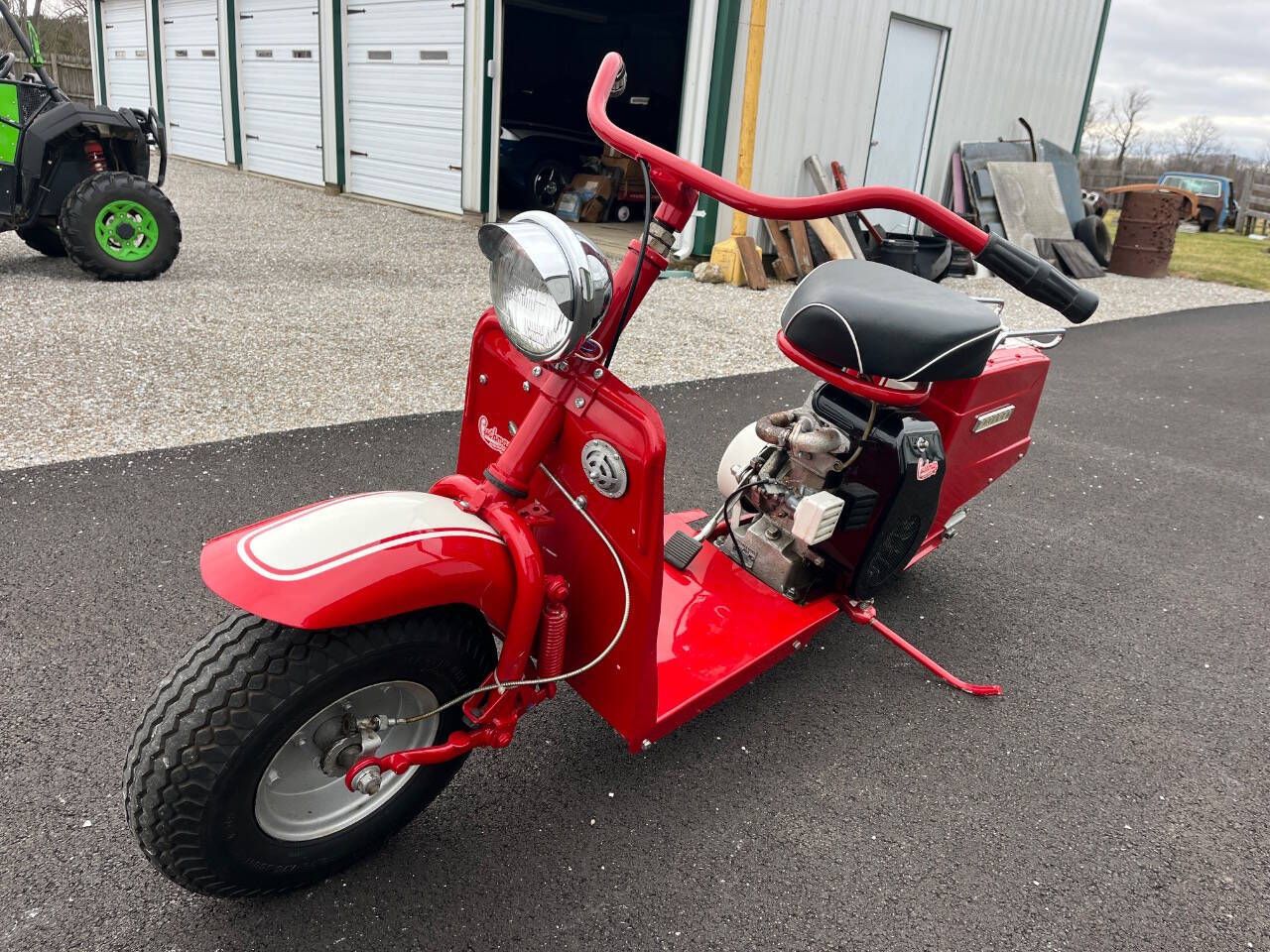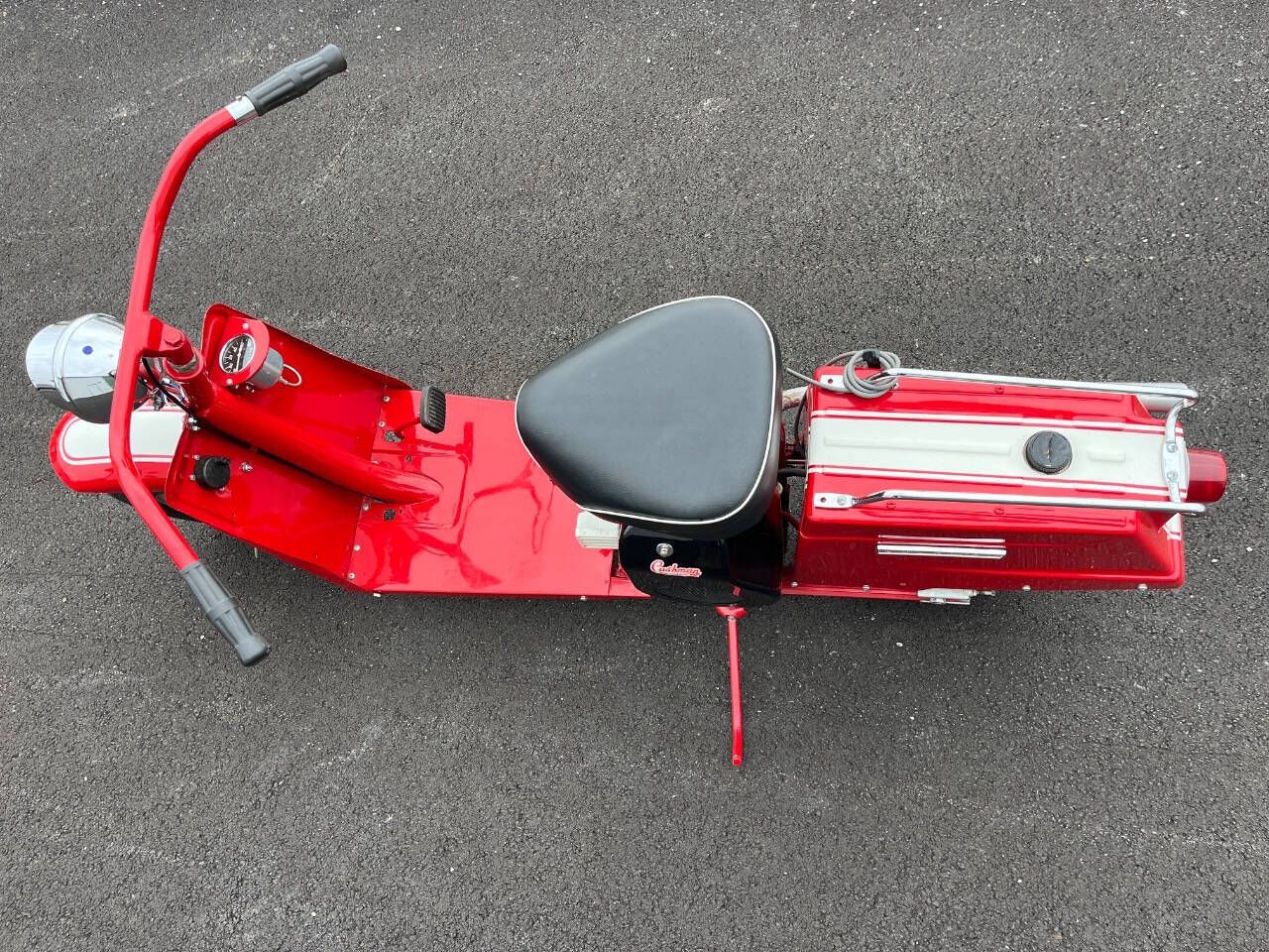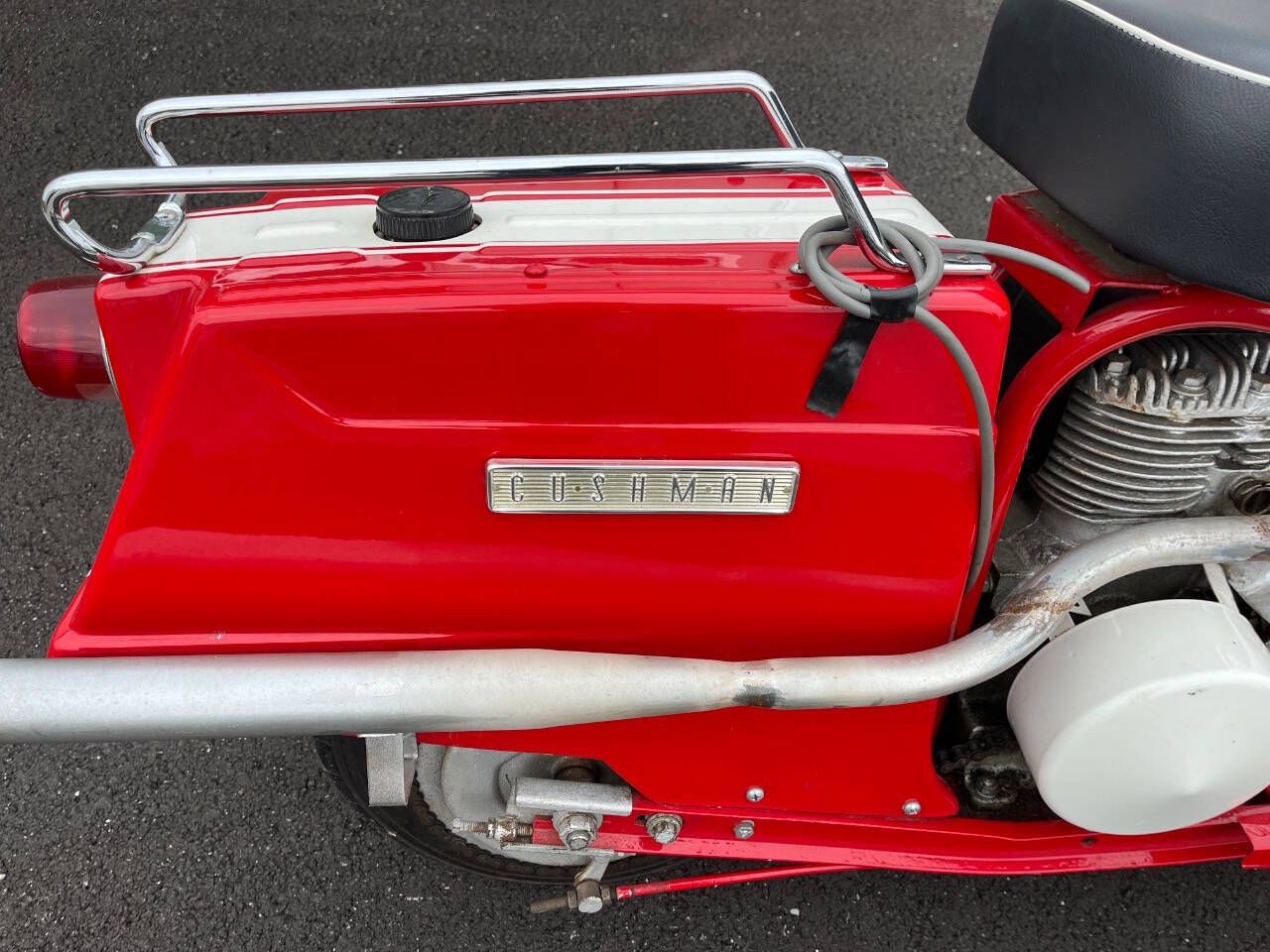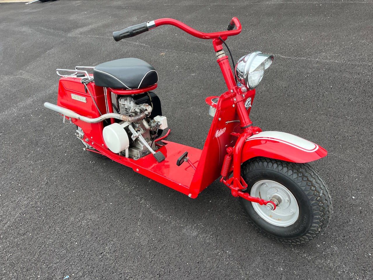 FOR SALE BY 500 CLASSIC AUTO. CALL 765-345-5211. THIS 59 CUSHMAN IS IN EXCELLENT RESTORED CONDITION. SHINNY PAINT WAS DONE VERY HIGH QUALITY. FINISHED JUST A COUPLE YEARS AGO BY SOMEONE ELSE. NO TITLE. SELLING AS IS WITH NO WARRANTY. NOTE: 27 PHOTOS AND A VIDEO AT WWW.500CLASSICAUTO.COM. YOU CAN TELL IT HAS NEW TIRES. NEW HEADLIGHT. NEW SPEEDO AND IT WORKS. NEW SEAT AND MORE. I STARTED IT IN 20 DEGREE WEATHER THE OTHER DAY AND WITH 3 KICKS SHE FIRED UP. THEN STALLED BECAUSE I DIDN'T TURN DOWN CHOKE FAST ENOUGH BUT STARTED WRIGHT BACK UP. STILL NEEDS WIRED FOR LIGHTS AND HORN. NEEDS A CHOKE CABLE TOO. WOULD LOOK NICER IF EXHAUST WAS CHROMED AND REPLACE GAS CAP. ENGINE NOT PAINTED PRETTY BUT NO SMOKE AND RUNS GREAT. THE CHAIN IS A LITTLE LOOSE AND HIT COVER SLIGHTLY. YOU CAN HERE IT IN VIDEO. DELIVERY - I CAN GET A PRICE FOR SHIPPING IN USA OR YOU CAN OR PICK UP IN PERSON.