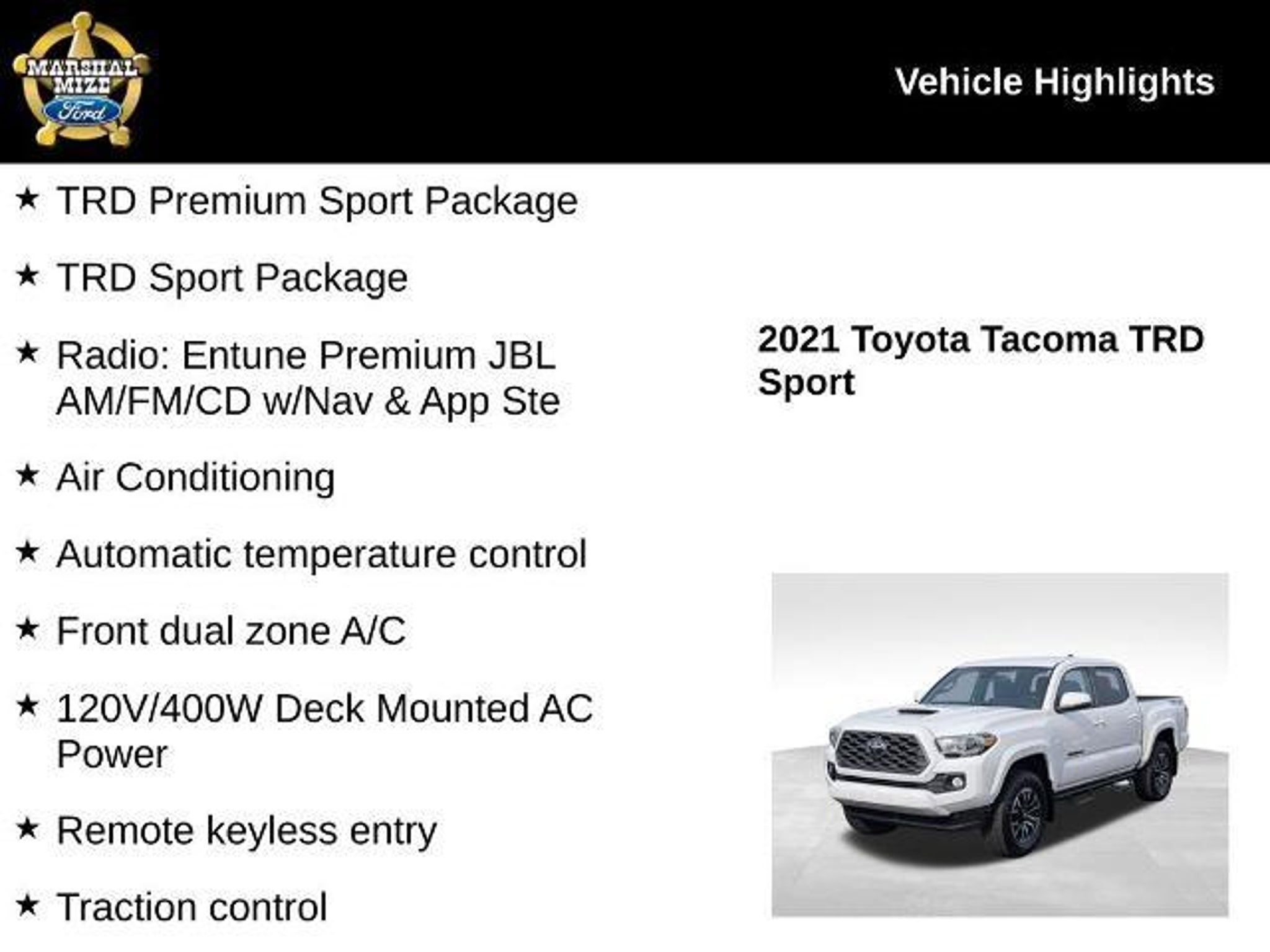 Clean CARFAX. Priced below KBB Fair Purchase Price! 4WD, 120V/400W Deck Mounted AC Power, ABS brakes, Active Cruise Control, Air Conditioning, Alloy wheels, Auto-Dimming Rearview Mirror w/HomeLink, Automatic Headlights, Automatic temperature control, Color-Keyed Overfenders, Electronic Stability Control, Engine Immobilizer, Front dual zone A/C, Heated door mirrors, Heated Front Seats, Illuminated entry, Leather Seat Trim, Low tire pressure warning, Power door mirrors, Power Sliding Rear Window w/Privacy Glass, Power Tilt/Slide Moonroof, Radio: Entune Premium JBL AM/FM/CD w/Nav & App Ste, Remote keyless entry, Smart Key w/Push Button Start, Tachometer, Telescoping steering wheel, Tilt steering wheel, Traction control, TRD Premium Sport Package, TRD Sport Package. We'll beat your best deal reeee-gardless!!! 2021 Toyota Tacoma TRD Sport V6