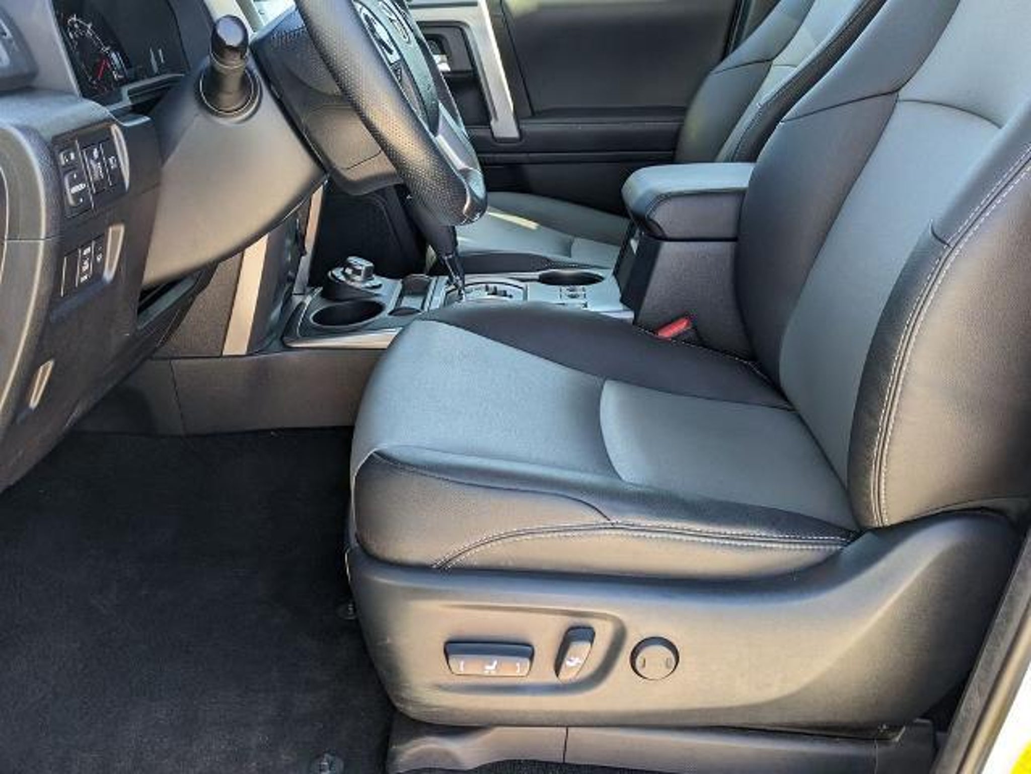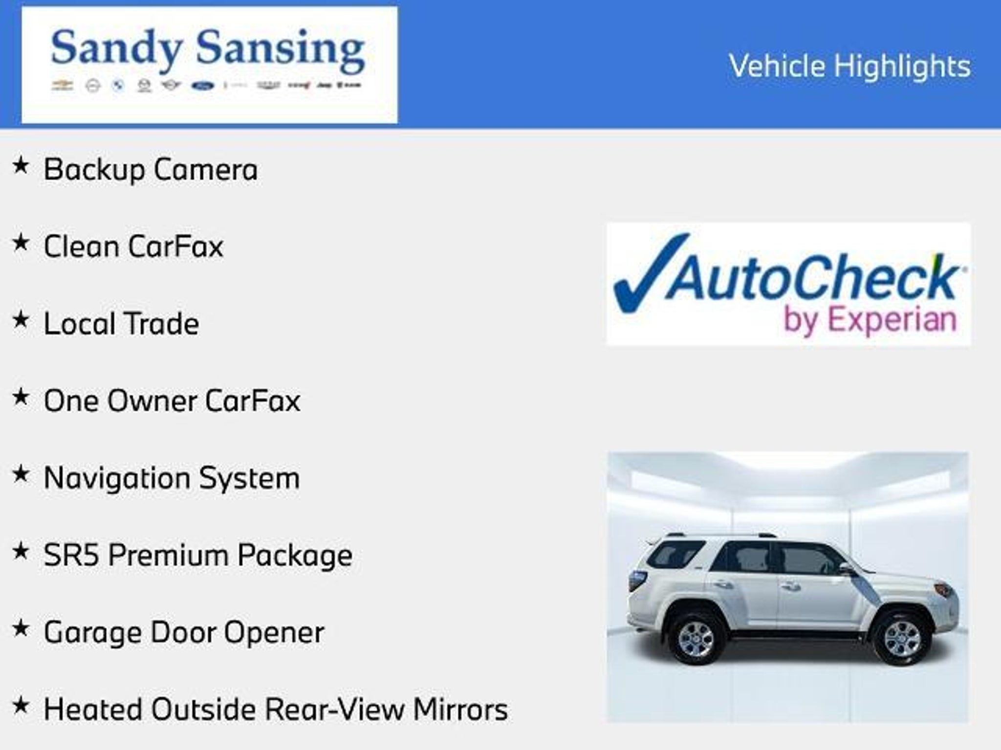 Here are more details on this White 2024 Toyota 4Runner with Black/Graphite Artificial Leather interior trim at Sandy Sansing Dealerships. Come see the largest inventory on the Gulf coast. Backup Camera, Clean CarFax, Local Trade, One Owner CarFax, 4WD, Black/Graphite Artificial Leather, Garage Door Opener, Heated Outside Rear-View Mirrors, Navigation System, SR5 Premium Package. SR5 Premium Package (Garage Door Opener and Heated Outside Rear-View Mirrors), 4WD, Black/Graphite Artificial Leather, Navigation System, 17 6-Spoke Alloy Wheels, 3.727 Axle Ratio, 4-Wheel Disc Brakes, 8 Speakers, ABS brakes, Air Conditioning, Alloy wheels, AM/FM radio: SiriusXM, Anti-whiplash front head restraints, Apple CarPlay/Android Auto, Auto High-beam Headlights, Auto-dimming Rear-View mirror, Brake assist, Bumpers: body-color, Compass, Driver door bin, Driver vanity mirror, Dual front impact airbags, Dual front side impact airbags, Electronic Stability Control, Emergency communication system: Safety Connect (1-year trial), Exterior Parking Camera Rear, Front anti-roll bar, Front Bucket Seats, Front Center Armrest, Front fog lights, Front reading lights, Front wheel independent suspension, Garage door transmitter: HomeLink, Heated door mirrors, Heated Front Bucket Seats, Heated Rear Seats, Heated steering wheel, Illuminated entry, Knee airbag, Leather Shift Knob, Leather steering wheel, Low tire pressure warning, Occupant sensing airbag, Outside temperature display, Overhead airbag, Overhead console, Panic alarm, Passenger door bin, Passenger vanity mirror, Power door mirrors, Power driver seat, Power passenger seat, Power steering, Power windows, Radio: Premium Audio, Rear anti-roll bar, Rear seat center armrest, Rear window defroster, Rear window wiper, Remote keyless entry, Security system, SofTex Seat Trim, Speed control, Speed-sensing steering, Split folding rear seat, Spoiler, Steering wheel mounted audio controls, Tachometer, Telescoping steering wheel, Tilt steering wheel, Traction control, Trip computer, Turn signal indicator mirrors, and Variably intermittent wipers.