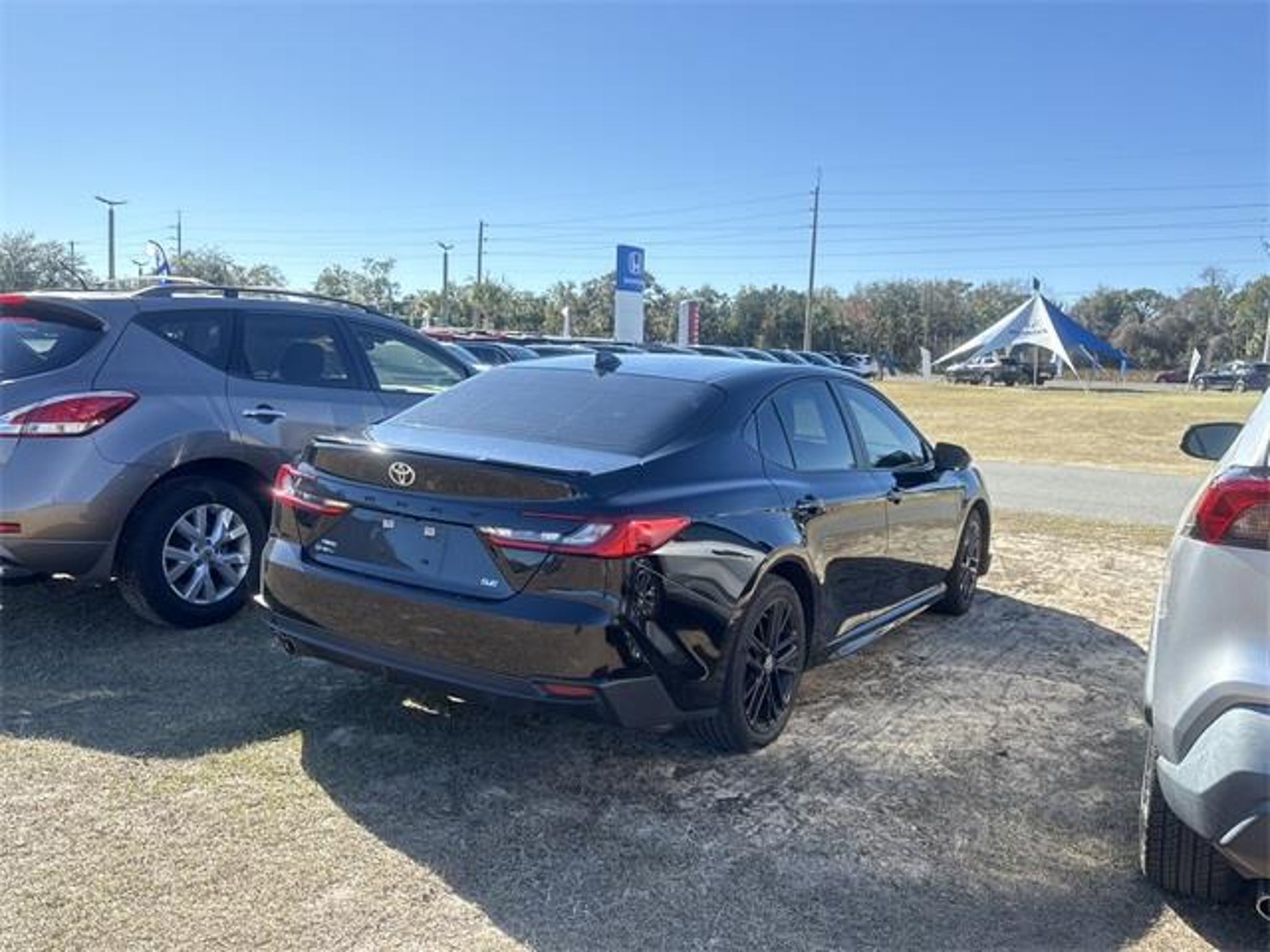 Cold Weather Package (Heated Front Seats and Leather Wrapped Heated Steering Wheel), Convenience Package (Auto-Dimming Rearview Mirror w/HomeLink and Smart Key System), 2.5L 4-Cylinder 16V DOHC, Boulder Cloth, 4-Wheel Disc Brakes, 6 Speakers, ABS brakes, Air Conditioning, Alloy wheels, AM/FM radio: SiriusXM, Apple CarPlay/Android Auto, Auto High-beam Headlights, Automatic temperature control, Brake assist, Bumpers: body-color, Cruise Control, Delay-off headlights, Driver door bin, Driver vanity mirror, Dual front impact airbags, Dual front side impact airbags, Electronic Stability Control, Emergency communication system: Safety Connect (up to 10-year trial subscription), Four wheel independent suspension, Front anti-roll bar, Front Bucket Seats, Front Center Armrest, Front dual zone A/C, Front reading lights, Fully automatic headlights, Heated door mirrors, Illuminated entry, Knee airbag, Leather Shift Knob, Leather steering wheel, Low tire pressure warning, Occupant sensing airbag, Outside temperature display, Overhead airbag, Overhead console, Panic alarm, Passenger door bin, Passenger vanity mirror, Power door mirrors, Power driver seat, Power steering, Power Tilt/Slide Moonroof, Power windows, Radio data system, Radio: Toyota Audio Multimedia w/12.3 Touchscreen, Radio: Toyota Audio Multimedia w/8 Touchscreen, Rear anti-roll bar, Rear reading lights, Rear seat center armrest, Rear side impact airbag, Rear View Camera, Rear window defroster, Remote keyless entry, Security system, SofTex & Fabric Seat Trim, Speed-sensing steering, Split folding rear seat, Spoiler, Steering wheel mounted audio controls, Telescoping steering wheel, Tilt steering wheel, Traction control, Trip computer, Turn signal indicator mirrors, Variably intermittent wipers, and Wheels: 18 Black-Finished Alloy. 2.5L 4-Cylinder 16V DOHC, Boulder Cloth, 4-Wheel Disc Brakes, 6 Speakers, ABS brakes, Air Conditioning, Alloy wheels, AM/FM radio: SiriusXM, Apple CarPlay/Android Auto, Auto High-beam Headlights, Auto-Dimming Rearview Mirror w/HomeLink, Automatic temperature control, Brake assist, Bumpers: body-color, Cold Weather Package, Convenience Package, Cruise Control, Delay-off headlights, Driver door bin, Driver vanity mirror, Dual front impact airbags, Dual front side impact airbags, Electronic Stability Control, Emergency communication system: Safety Connect (up to 10-year trial subscription), Four wheel independent suspension, Front anti-roll bar, Front Bucket Seats, Front Center Armrest, Front dual zone A/C, Front reading lights, Fully automatic headlights, Heated door mirrors, Heated Front Seats, Illuminated entry, Knee airbag, Leather Shift Knob, Leather steering wheel, Leather Wrapped Heated Steering Wheel, Low tire pressure warning, Occupant sensing airbag, Outside temperature display, Overhead airbag, Overhead console, Panic alarm, Passenger door bin, Passenger vanity mirror, Power door mirrors, Power driver seat, Power steering, Power Tilt/Slide Moonroof, Power windows, Radio data system, Radio: Toyota Audio Multimedia w/12.3 Touchscreen, Radio: Toyota Audio Multimedia w/8 Touchscreen, Rear anti-roll bar, Rear reading lights, Rear seat center armrest, Rear side impact airbag, Rear View Camera, Rear window defroster, Remote keyless entry, Security system, Smart Key System, SofTex & Fabric Seat Trim, Speed-sensing steering, Split folding rear seat, Spoiler, Steering wheel mounted audio controls, Telescoping steering wheel, Tilt steering wheel, Traction control, Trip computer, Turn signal indicator mirrors, Variably intermittent wipers, Wheels: 18 Black-Finished Alloy, 2.5L 4-Cylinder 16V DOHC, Boulder Cloth. Recent Arrival! 2025 Toyota Camry SE Black 46/46 City/Highway MPG All vehicles have the Red Alert rear end deterrent third brake light safety system installed for $499. Dealer Document Processing Fee of 899 -- this charge represents cost and profit to the dealer for items such as inspections, cleaning, and adjusting vehicles and preparing do