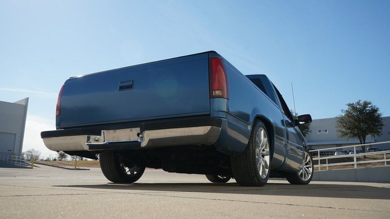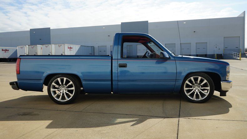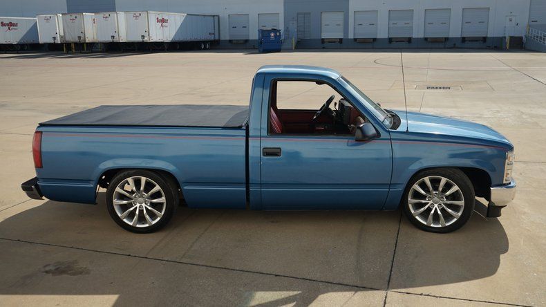 Exterior & Presence Finished in a striking Ice Blue paint, this C1500 catches the light beautifully and is accented by a subtle red pinstripe that runs the length of the body, adding a touch of custom flair. The truck sits low and lean thanks to a lowered suspension, giving it that unmistakable ""Street Truck"" silhouette. Filling out the wheel wells is a set of modern, oversized multi-spoke alloy wheels that provide a perfect contrast to the classic square-body lines. The chrome front bumper and grille remain bright, framing the iconic red Chevy bowtie. Custom TriFold Bed Cover conceals a bedlined truck bed!