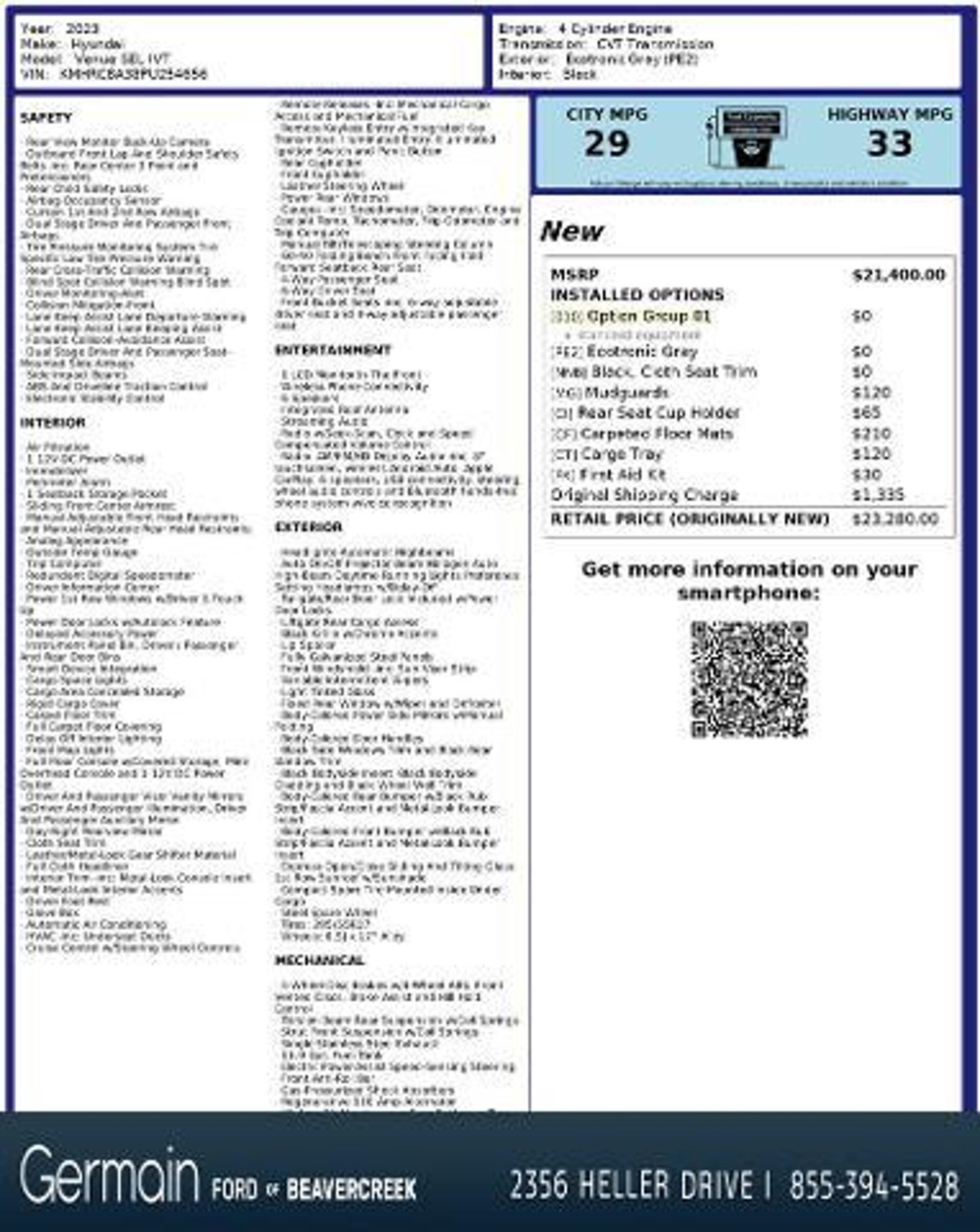 Details > 2023 Hyundai Venue SEL 4DR Crossover For Sale in Dayton, OH Private Party Sellers Click here to place your ad now! You auta tell them you saw the ad in AutaBuy when you call or email. 1/30 2/30 3/30 4/30 5/30 6/30 7/30 8/30 9/30 10/30 11/30 12/30 13/30 14/30 15/30 16/30 17/30 18/30 19/30 20/30 21/30 22/30 23/30 24/30 25/30 26/30 27/30 28/30 29/30 30/30 View 30 Photos View All Add to My Garage Parked in Your Garage! Germain Ford of Beavercreek Contact Seller: I would like to: Make Offer Check Availability Ask A Question Request More Photos Check Financing Options Send a copy of this message to me Add this listing to my garage Send to Mobile Mileage 7,714 Exterior Color Ecotronic Gray Interior Color Black Doors 4 Engine 1.6L I4 Stock # P8165 VIN KMHRC8A38PU254656 Estimated Monthly Payment $330 mo Apply Now J.J. Best Banc & Co. 2023 Hyundai Venue SEL 4DR Crossover Description: CARFAX One-Owner. Clean CARFAX. Odometer is 24731 miles below market average! 29/33 City/Highway MPG The Right car, The Right price, The Right way. https://www.kbb.com/kbbreport/5if9e · Mileage: 7,714 · Color: Ecotronic Gray Price: $18,977. Price: $18,954. Mileage 7,714 Exterior Color Ecotronic Gray Interior Color Black Doors 4 Engine 1.6L I4 Stock # P8165 VIN KMHRC8A38PU254656 Estimated Monthly Payment $330 mo Apply Now J.J. Best Banc & Co. Add to My Garage Parked in Your Garage! Message Seller Germain Ford of Beavercreek Contact Seller: I would like to: Make Offer Check Availability Ask A Question Request More Photos Check Financing Options Send a copy of this message to me Add this listing to my garage Offered for sale by Germain Ford of Beavercreek DAYTON, OH Price: $18,977. Price: $18,954. Offered for sale by Germain Ford of Beavercreek DAYTON, OH [entire inventory] Ask Auta Intelligence Can you show me more suvs for a similar price? Where is this located? What colors did these come in? What trim levels were available for this model? What transmission options did these offer? How many passengers can this seat comfortably? How far is this from me? What factory options were available on this model? What kind of mileage do these get? What engine options did these come with? How many Venues were produced in Gray? Tell me the history on this model How easy are parts to find for this model? What does this VIN number tell me? How many of these were produced? What safety features does this model offer? When was this model first introduced? Do you have a similar car to sell? List It Now! Questions about this car? Ask Auta Intelligence for production numbers, available options, etc. · Subscribe to AutaBuy! · Send a Gift Subscription Notice to a Friend