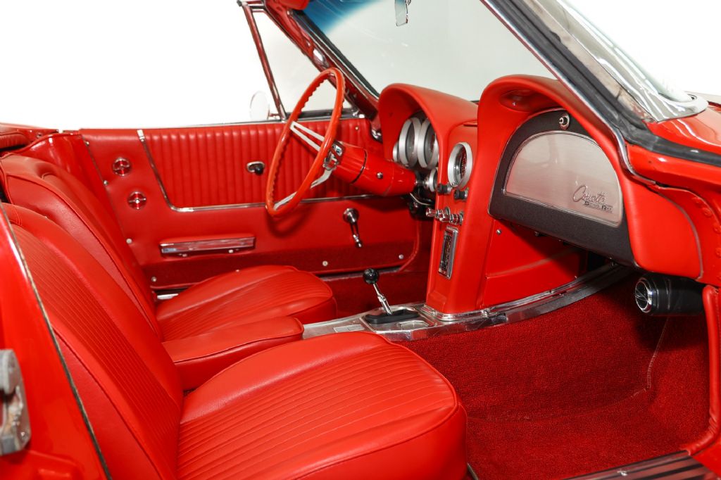Stunning Riverside Red 1963 Corvette Stingray roadster with white soft top and painted to match hardtop. This Corvette has had and extensive restoration and has some very desirable upgrades. The stingray body is has great lines and panel fitment and was professionally painted in correct code-923 Riverside Red jeweled in lots of newer and polished chrome and stainless all the way around. The lush red interior is stunning, with newer red seat covers and features rare tilt steering column for a little more leg room and exceptional dash with restored instrumentation and clock, a new glove box door, lots of newer stainless trim, correct Corvette matching red 3 spoke aluminum steering wheel and newer Corvette stereo with a 10 disc cd changer in the back. Under the hood appears factory correct and show cases an upgraded GM 350 cubic inch crate engine with a little more horsepower, topped off with correct Corvette polished aluminum valve covers, correct Winters intake and chrome ignition shielding and correct factory chrome air cleaner for a factory correct, original appearance. Other desirable upgrades include newer Vintage A/C and a newer aluminum radiator to keep you and the car cool on those hot summer days. The Muncie transmission debuted in 1963 and this car retains its numbers matching 4-speed transmission to control the power and is backed by the stock rear end that has posi-traction and a heavy duty 4.11 gear. This American Dream Machine is rolling brand new Corvette full size spinner hubcaps and Coker Classic redline tires that match the car perfectly.