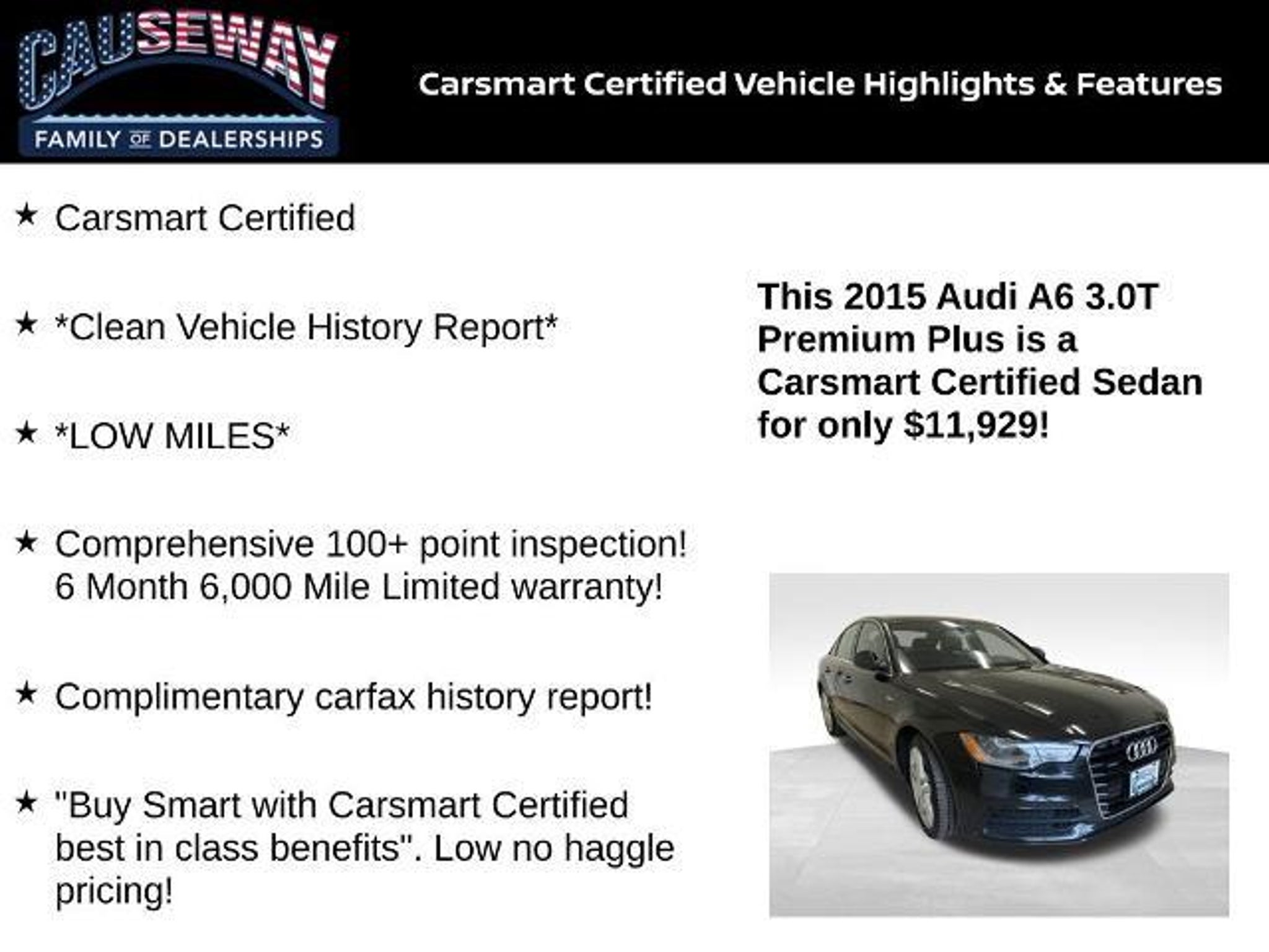 2015 Audi A6 3.0T Premium Plus quattro quattro 8-Speed Automatic with Tiptronic 3.0L V6 Turbocharged DOHC 24V ULEV II 310hp Carsmart Certified, *Clean Vehicle History Report*, *LOW MILES*, Comprehensive 100 point inspection! 6 Month 6,000 Mile Limited warranty!, Complimentary carfax history report!, Buy Smart with Carsmart Certified best in class benefits. Low no haggle pricing!, quattro, Leather. 18/27 City/Highway MPG Certification Program Details: 6 month/6000 mile warranty, powertrain 100 point inspection, Free Carfax history report, available Extended Protection! Ask us how you can make money using our Causeway Referral Rewards Program!