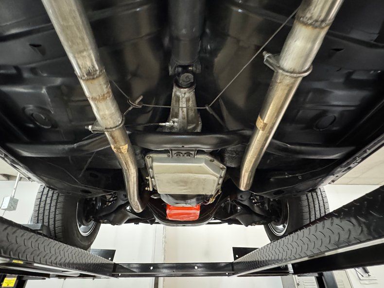 With fingers crossed, we raised this car onto the lift in hopes of a trifecta of show quality cleanliness, and our hopes were rewarded! Here, you'll find dual exhaust travelling through stock style mufflers on their way to the back. Power drum brakes are on all four wheels and coil springs are at both ends with a 4 link in back. And it's all remarkably clean.