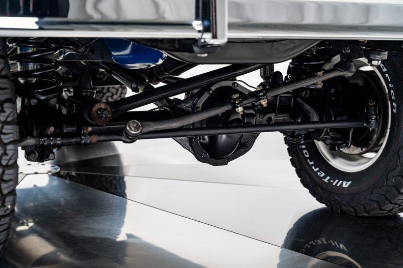 Power comes from a 302ci V8 topped with an Edelbrock 4-barrel carburetor, backed by an AOD 4-speed automatic transmission that transforms drivability compared to original gearboxes. A Dana 20 transfer case, Dana 44 front axle, and Ford 9" rear with 3.54 gearing provide proven four-wheel-drive hardware, while power steering and power-assisted brakes with front discs make the truck far more manageable in modern traffic. The lift kit, combined with refreshed suspension components, bushings, and Bilstein shocks, maintains a purposeful look while also improving ride quality.