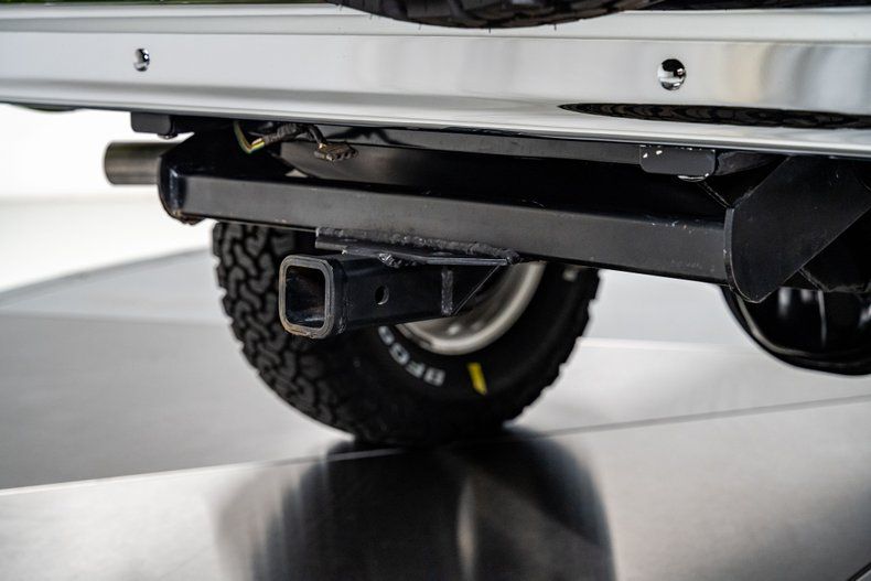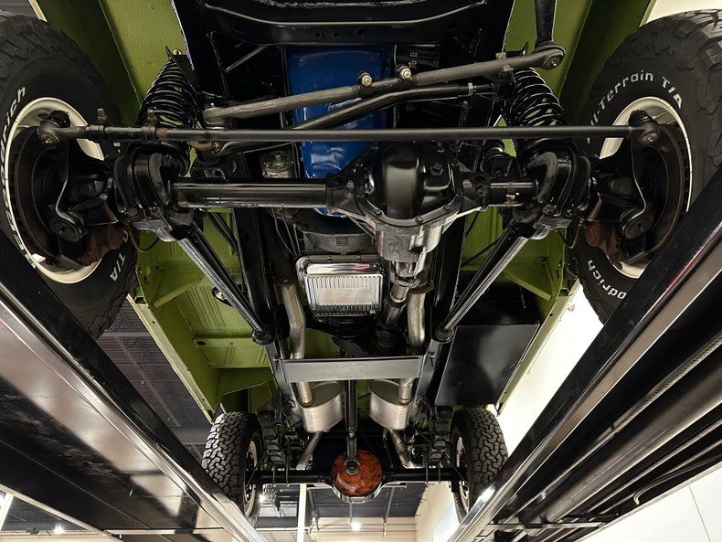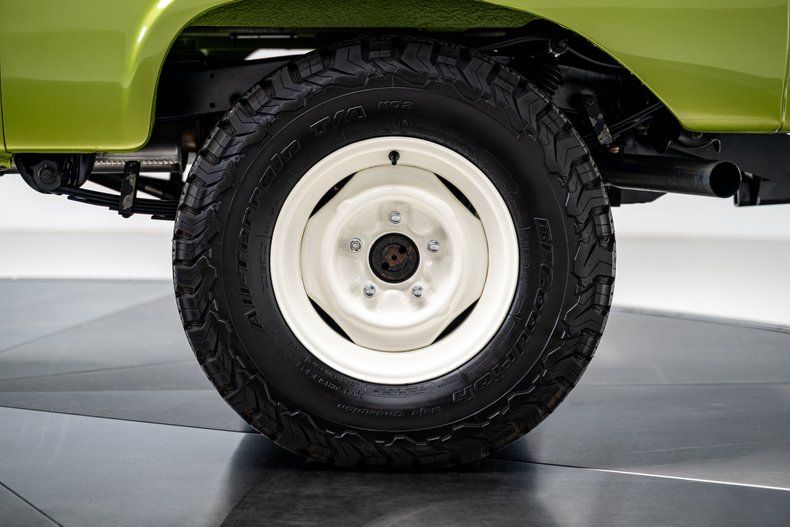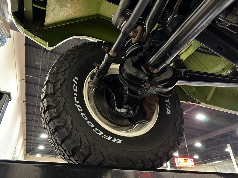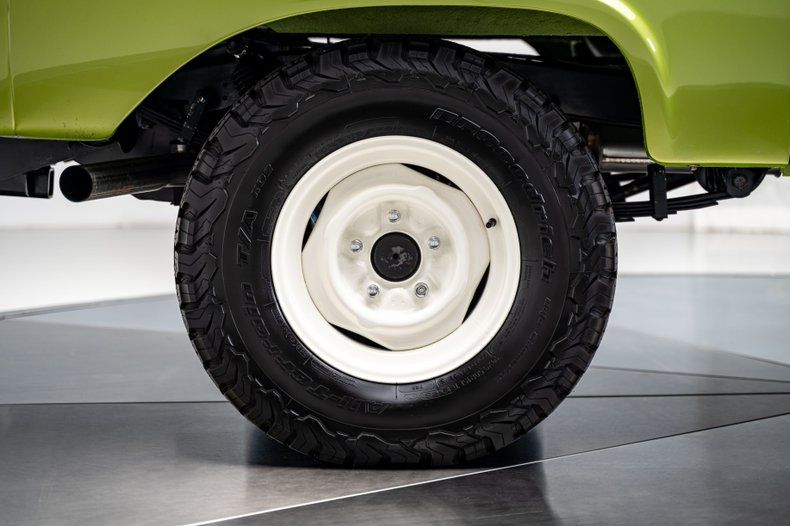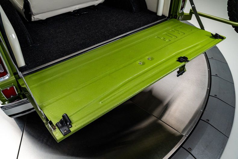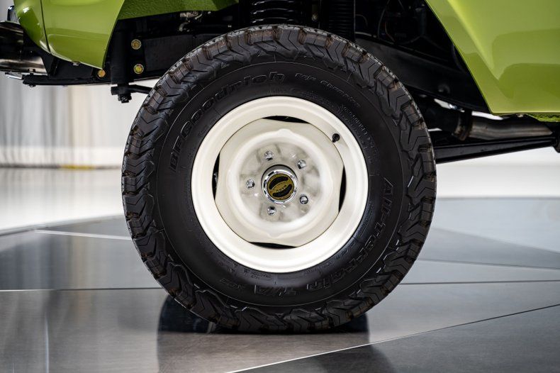 Finished in Code "U" Limestone Green with a contrasting white hardtop, this Bronco presents with crisp, era-correct color and deep metallic finish throughout. The uncut body preserves the original compact stance, while details like the white grille, chrome bumpers, factory swing-out tire carrier, and full-size spare reinforce the truck's period-correct character. Panel fit is clean, trim and brightwork have been renewed throughout, and the truck benefits from extensive rust remediation and bare-metal preparation prior to refinishing. Riding on white powder-coated 15" steel wheels wrapped in 30x9.50 BFGoodrich All-Terrain T/A KO2s, aided by a subtle 1" body lift and 2.5" suspension lift, the stance strikes a balance between classic and competent. A chassis-mounted 2" hitch receiver adds light towing capability without detracting from the truck's original profile.
