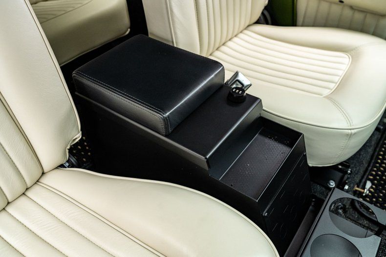 Inside, the Bronco benefits from a full custom interior executed by Pharr's Custom Trim Shop. Parchment leather upholstery, German square weave carpet, Coco mats, and sound deadening throughout give the cabin an upscale feel without abandoning its utilitarian roots. Finished in white to complement the interior, a 4-point roll cage adds a subtle structural element and maintains a cohesive look. Modern comforts like Vintage Air heat and air conditioning, a Flaming River tilt steering column, upgraded gauges, three-point front seatbelts, a lockable center console with integrated cup holders and ample storage, and a RetroSound audio system with Bluetooth make the truck genuinely usable year-round. Attention to detail extends to the hardware, seals, glass, wiring, and weatherstripping, all of which have been comprehensively renewed.