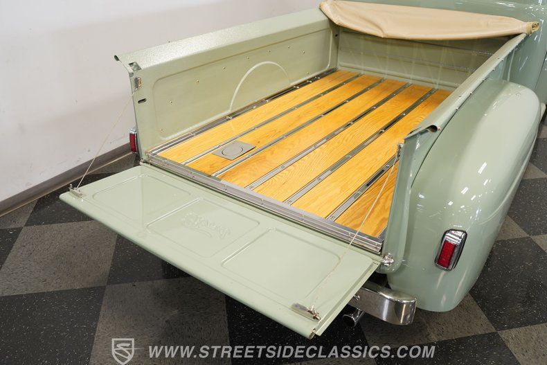 The interior is just as impressive, and blends retro styling with an OEM-inspired finish. The custom door panels are solid, the bench seat is in excellent shape, and the aftermarket steering wheel still delivers that old-school feel. The OEM-style gauge cluster and Boxwood Green dashboard, accented in Tan, tie everything together beautifully. Retro A/C controls pair nicely with the Lokar shifter, while a JVC Bluetooth head unit and Pioneer speakers handle the tunes. Clean carpets, bedliner-coated side steps, and a wooden plank-style bed flooring just keep the restomod look flowing.