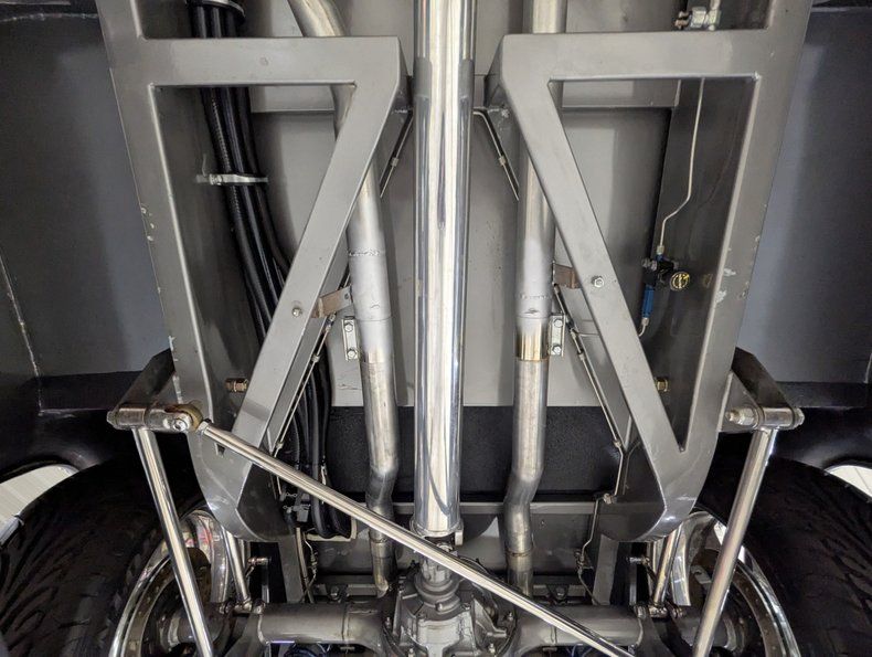 UNDERSIDE: This is sitting on a complete aftermarket custom chassis. The new frame is boxed, smoothed and painted body color. The front end is full of polished parts including tubular upper and lower control arms, drop spindles, tierod ends and swaybar. It has Ridetech coilover adjustable gas shocks, rack and pinion steering. Similar deal in back: a four link system with polished tubular control arms, pan hard bar and Ridetech coilover adjustable gas shocks. The custom made exhaust is sounding great with Flowmaster mufflers. The brake system has a polished master and power booster, Wilwood drilled and slotted discs at all 4 wheels and polished calipers. The fuel tank is polished. Looking up at the motor it has an aluminum oil pan and high torque starter. The trans is a 4L80E overdrive automatic and a polished aluminum driveshaft connects to the 9 inch rear with 3.73 posi gears. There is zero rust under this truck, all the metal was replaced and painted.