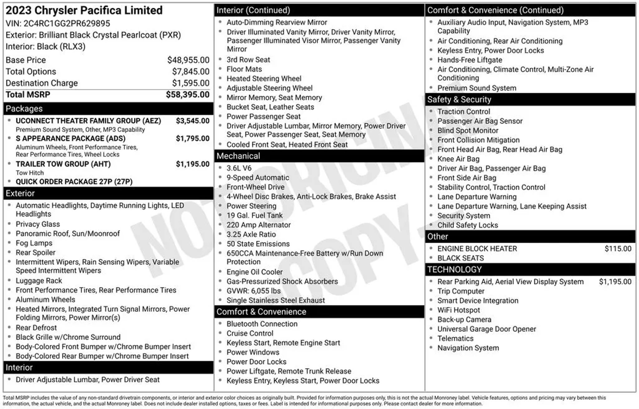 2023 Chrysler Pacifica 4D Passenger Van Brilliant Black Crystal Pearlcoat 9-Speed 948TE Automatic Limited Recent Arrival! CARFAX One-Owner. Priced below KBB Fair Purchase Price! Odometer is 41510 miles below market average! Pacifica Limited, Anodized Ink Badging, Black Day Light Opening Moldings, Body Color Door Handles, Gloss Black Exterior Mirrors, Nappa Leather Bucket Seats w/S Logo, Piano Black Interior Accents, Premium Fascia Upper/Lower Grille w/Black Surround, Premium Rear Fascia Black, S Appearance Package, S Badge, Wheels: 20" x 7.5" S-Model Aluminum Design 1. FWD 3.6L V6 24V VVT 19/28 City/Highway MPG All prices plus tax, tag, and fees. New prices cannot be combined with special interest rates. Must finance through manufacturer's or dealer's preferred lender for certain rebates and some offers may not be combined. See Dealer for details. Important recall information: so you know, any used vehicle you may be considering may have unrepaired manufacturer's safety recalls. To check the recall status (repaired or unrepaired) of the specific used vehicle you're interested in purchasing visit www.safercar.gov. Thanks for shopping with us.