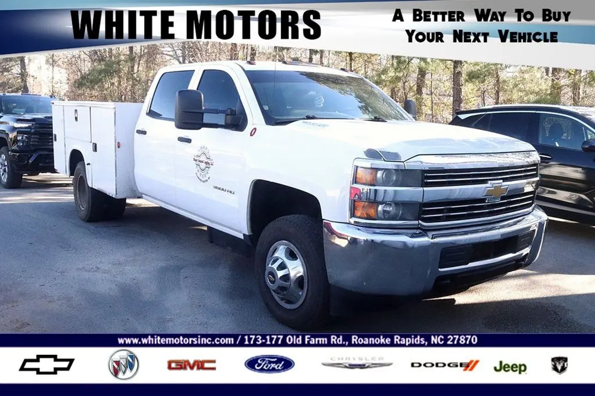 All Routine Maintenance Up To Date, Compare this Chevy for sale to Capital Chevorlet or Sir Walter or Don Bullock Chevy, Compare this Chevy for sale to Carmax or Carvana, we are always Cheaper. 2015 Chevrolet Silverado 3500HD Work Truck Diesel Service Body Summit White Equipped with Preferred Equipment Group 1WT (Steering Wheel), 150 Amp Alternator, 17 Painted Steel Wheels, 3-Passenger Front 40/20/40 Split-Bench Seat, 4-Wheel Disc Brakes, 6 Speakers, ABS brakes, Air Conditioning, AM/FM radio, Brake assist, Bumpers: chrome, Chrome Grille Surround, Cloth Seat Trim, Delay-off headlights, Driver door bin, Dual front impact airbags, Dual rear wheels, Electronic Stability Control, Engine Block Heater, Exhaust Brake, Front anti-roll bar, Front Center Armrest w/Storage, Front License Plate Kit, Front reading lights, Front wheel independent suspension, Fuel Fill Kit, Fully automatic headlights, Integrated Trailer Brake Controller, Manual Tilt-Wheel Steering Column, Occupant sensing airbag, Overhead console, Passenger door bin, Passenger vanity mirror, Power steering, Power Take Off Engine Control Provisions, Power windows, Power Windows w/Driver Express Up & Down, Radio: AM/FM Stereo w/4.2 Diagonal Color Display, Rear reading lights, Rear seat center armrest, Single-Zone Air Conditioning, Solar Absorbing Tinted Glass, Speed control, Split folding rear seat, Tachometer, Tilt steering wheel, Traction control, Trip computer, Variably intermittent wipers, and Voltmeter. Family owned and operated since 1938. BUY ONLINE-TEXT-EMAIL-CHAT-PHONE. A better way to buy your next vehicle. Where a handshake still means something. Serving Roanoke Rapids, Weldon, Halifax, Scotland Neck, Emporia, South Hill, Franklin, Henderson, Louisburg, Murfreesboro, Littleton, Lake Gaston. We sale nationwide!