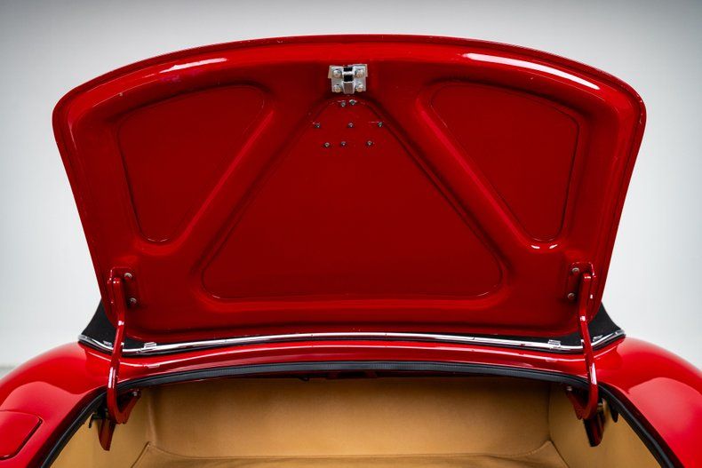 Inside, the cabin was restored to reflect the same level of care seen throughout the car. The black leather interior was reupholstered during the restoration process, with attention given to materials, fit, and overall presentation consistent with a Series I E-Type. Interior trim, gauges, and switchgear were refurbished to preserve the correct look and tactile feel of the cockpit. The center console includes custom speaker panels, allowing for future audio installation if desired. The convertible top bows were restored and fitted with a black Hartz canvas top, installed to original specifications, while the trunk area was finished to a high standard in keeping with the quality of the restoration throughout.