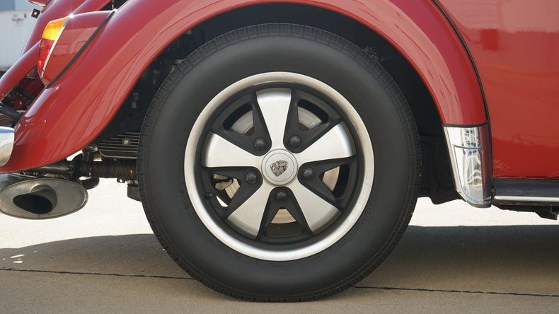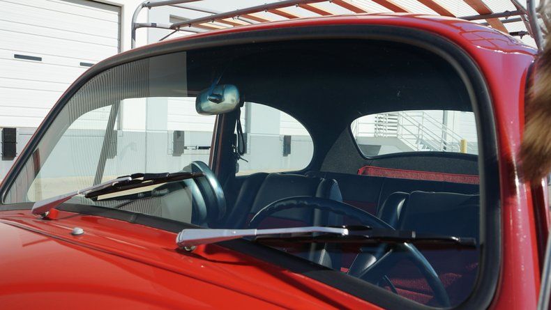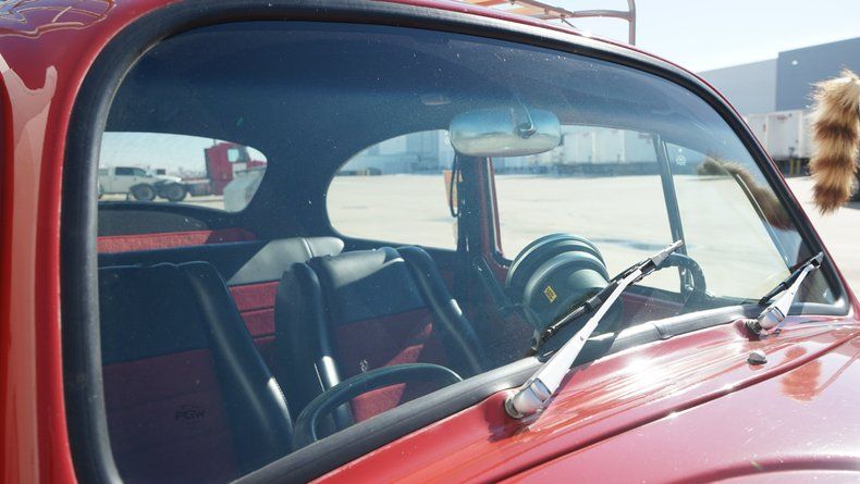 Inside, the Beetle features a custom interior that is both stylish and comfortable. The cabin is finished in a red interior color scheme, nicely coordinated with the exterior paint. Custom high-back bucket seats provide improved comfort and support while maintaining a clean, classic appearance. The dashboard retains its vintage charm and is finished to match the overall aesthetic, with a clean layout and period-correct details. Interior panels, carpeting, and trim are all in very clean condition, reflecting the quality of the build.