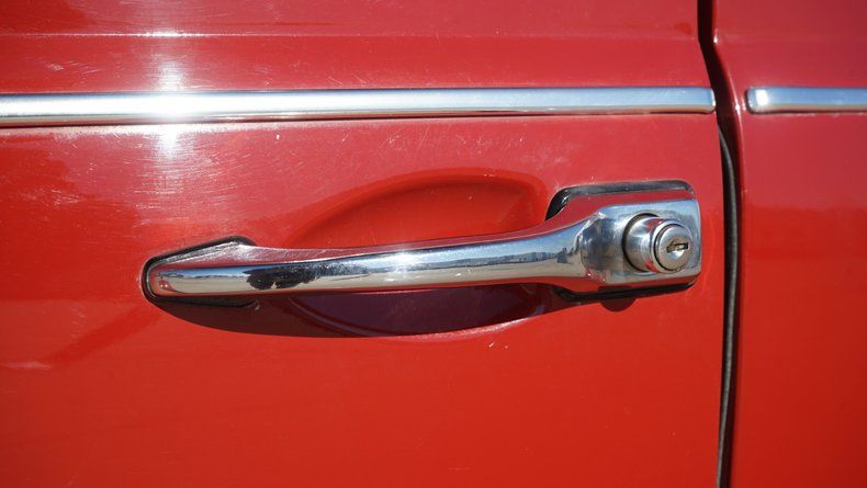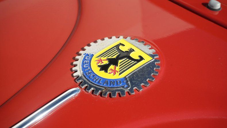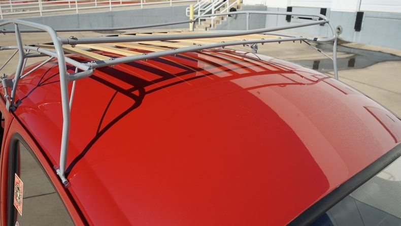 The exterior features clean body lines with a lowered stance that perfectly captures the Cal Look aesthetic. Chrome trim and bumpers are in excellent condition, complementing the deep red paint nicely. A roof rack adds both visual character and practicality, enhancing the vintage appeal while remaining period-correct. The car sits on black-centered wheels with polished lips, giving it a timeless performance look that contrasts sharply against the red paint. The wheels are wrapped in low-profile performance tires, providing a confident stance and improved road handling.