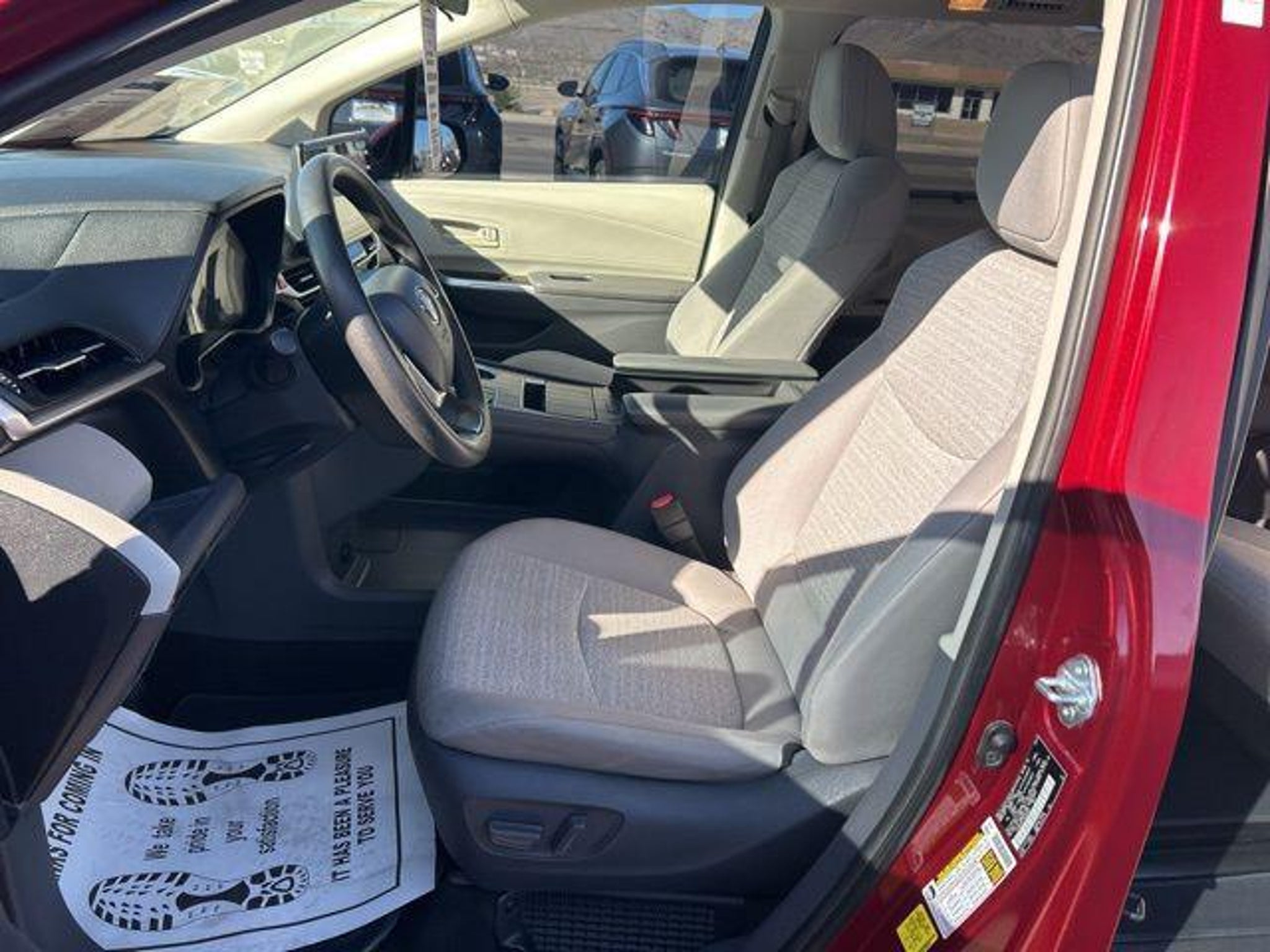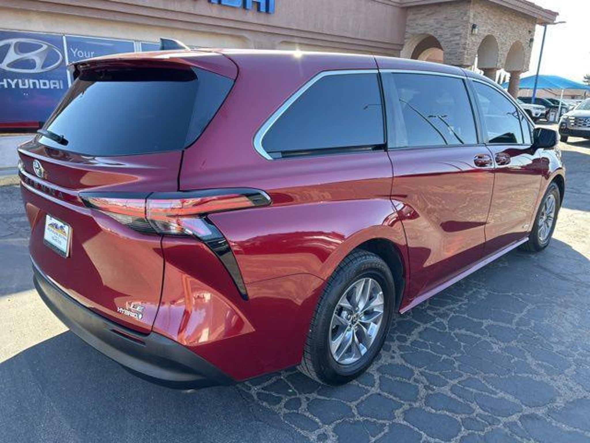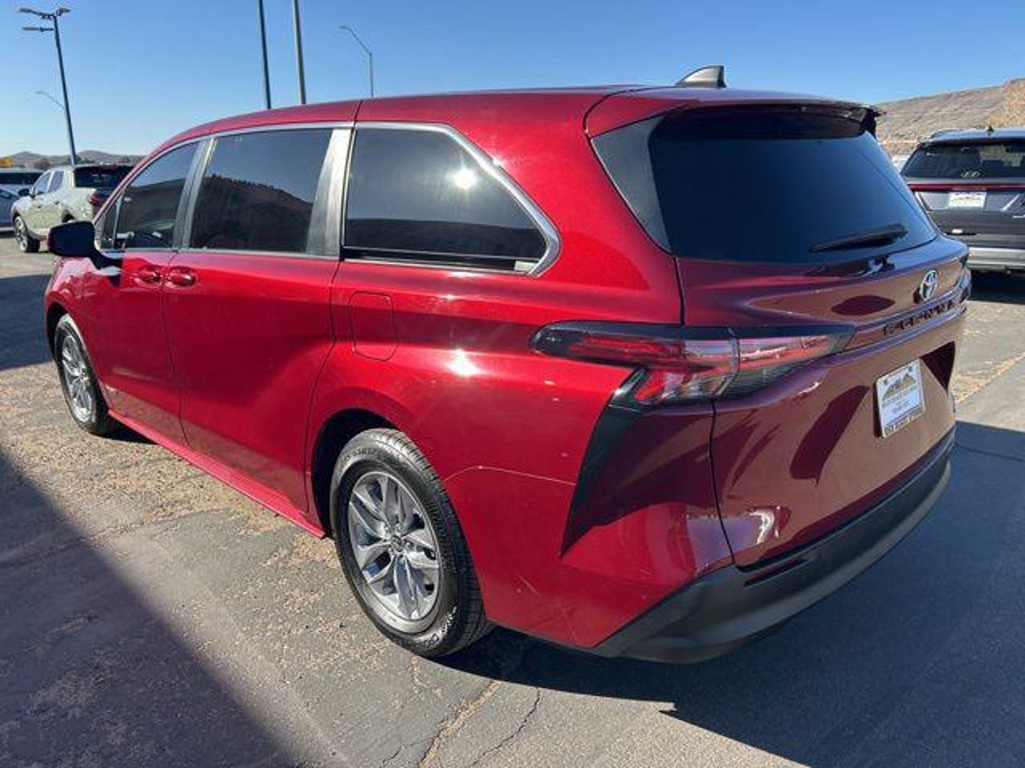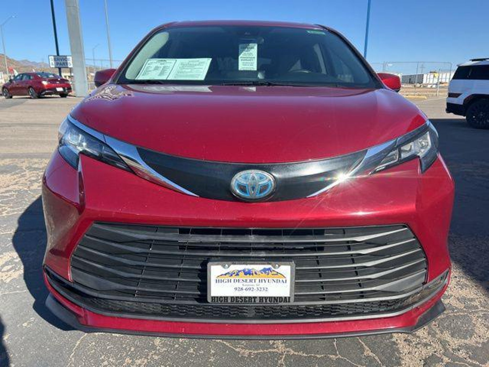 2.5L I4 Red 2021 Toyota Sienna LE FWD Awards: * JD Power Automotive Performance, Execution and Layout (APEAL) Study At High Desert Hyundai, we pride ourselves on offering a stellar automotive experience for drivers in Kingman, Henderson NV, and Prescott AZ. Our dedicated team of sales advisors, service technicians, and financing experts are here to address all your needs with the utmost respect, care, and attention to detail. Whether you're interested in the sleek Hyundai Santa Fe Sport, the stylish Sonata, the efficient Elantra, the versatile Tucson, or the compact Accent, our knowledgeable team will guide you through all the features and benefits of each model. If you're in the market for a reliable used car, our team is ready to help you explore our extensive inventory of pre-owned vehicles. Each car undergoes a thorough inspection to ensure it meets our high standards of quality and reliability. Our auto finance team is here to provide personalized solutions that fit your individual needs. Whether you're looking to lease a new Hyundai or finance a pre-owned vehicle, we offer a range of options to make the process stress-free. Start with our online appraisal form and credit application to get a head start. Our commitment to excellence doesn't end with the sale. Our onsite auto service and repair department is staffed with skilled technicians who use cutting-edge tools and technologies to keep your vehicle running smoothly. For those who prefer to perform their own maintenance, we offer a vast collection of authentic Hyundai parts and accessories. High Desert Hyundai has all your automotive needs covered. Whether you're stopping by for a test drive or need an oil change, our team is ready to assist you. Visit us at 4180 N Stockton Hill Rd, Kingman, Arizona, or contact us today to learn more about our services and inventory. This 2021 Toyota Sienna is equipped with the following options: 17 Alloy Wheels, 3rd row seats: split-bench, 4-Wheel Disc Brakes, 6 Speakers, ABS brakes, Air Conditioning, Alloy wheels, AM/FM radio: SiriusXM, Apple CarPlay/Android Auto, Auto High-beam Headlights, Auto-dimming door mirrors, Automatic temperature control, Axle Ratio: TBA, Brake assist, Bumpers: body-color, Compass, Delay-off headlights, Door auto-latch, Driver door bin, Driver vanity mirror, Driver's Seat Mounted Armrest, Dual front impact airbags, Dual front side impact airbags, Electronic Stability Control, Emergency communication system: Safety Connect with 1-year trial, Exterior Parking Camera Rear, Fabric Seat Material, Four wheel independent suspension, Front anti-roll bar, Front Bucket Seats, Front dual zone A/C, Front reading lights, Fully automatic headlights, Heated door mirrors, Illuminated entry, Knee airbag, Lane Departure Warning System, Low tire pressure warning, Occupant sensing airbag, Outside temperature display, Overhead airbag, Overhead console, Panic alarm, Passenger door bin, Passenger seat mounted armrest, Passenger vanity mirror, Power door mirrors, Power driver seat, Power steering, Power windows, Radio data system, Radio: Audio, Rear air conditioning, Rear anti-roll bar, Rear reading lights, Rear seat center armrest, Rear side impact airbag, Rear window defroster, Rear window wiper, Reclining 3rd row seat, Remote keyless entry, Speed control, Speed-sensing steering, Split folding rear seat, Spoiler, Steering wheel mounted audio controls, Tachometer, Telescoping steering wheel, Tilt steering wheel, Traction control, Trip computer, Turn signal indicator mirrors, and Variably intermittent wipers.