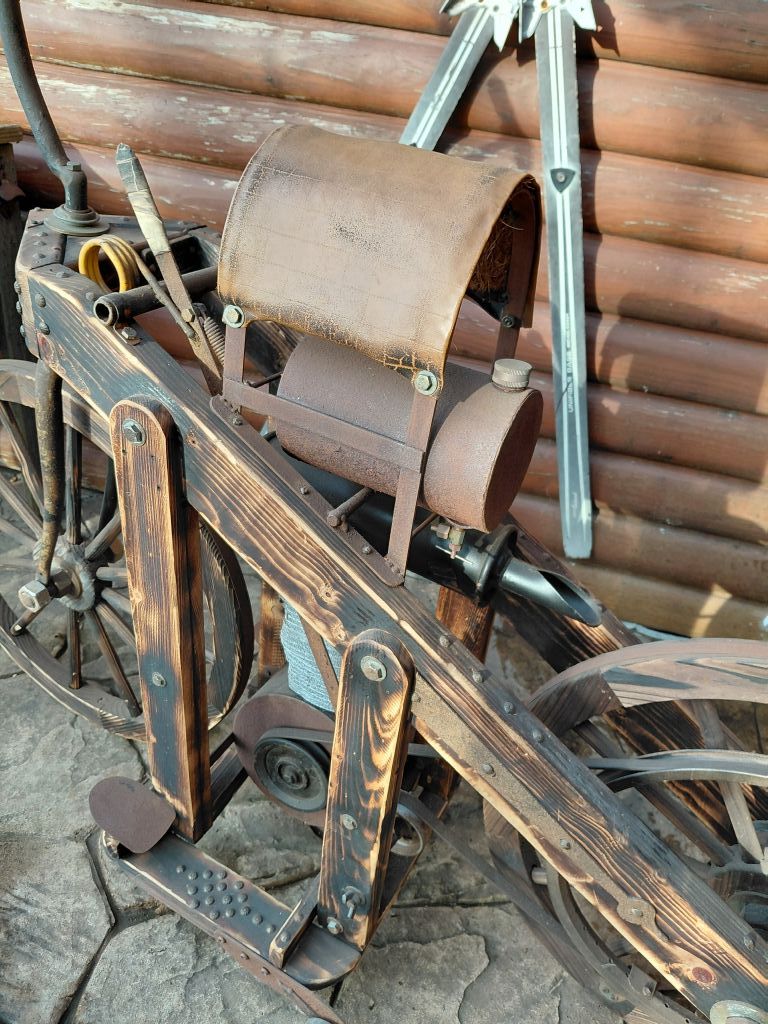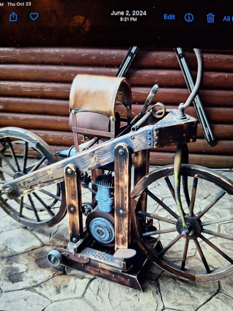 1885 Daimler Reitwagen Mercedes static display. The bike is one of 3, one in Hamburg, Germany (Mercedes museum) 2 here in the states. Full size example, all steel and wood construction with barn find patina. Last pic original bike.