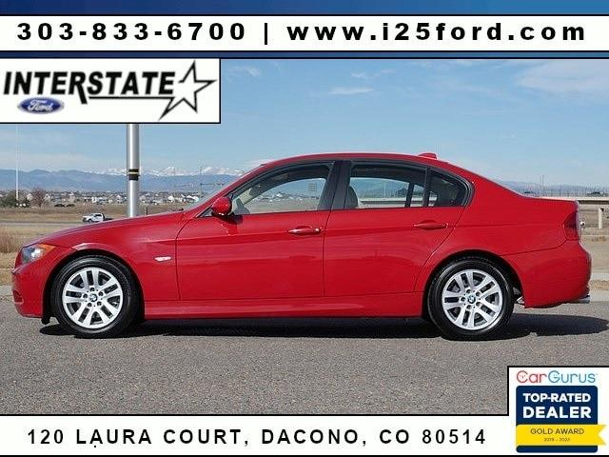 3.0L V6, POWER LOCKS/WINDOWS/MIRRORS, TILT/TELESCOPE LEATHER-WRAPPED STEERING WHEEL W/CRUISE & AUDIO CONTROLS, AM/FM STEREO W/SINGLE CD, PUSH BUTTON START, DUAL-ZONE ELECTRONIC CLIMATE CONTROL, AUXILIARY AUDIO INPUT JACK, POWER MOONROOF, REMOTE KEYLESS ENTRY, 16 ALLOY WHEELS. 2007 BMW 3 Series 328i RWD, 6-Speed Automatic, Steptronic 3.0L 6-Cylinder DOHC, 4D Sedan, Crimson Red, Beige w/Leatherette Upholstery, 16 x 7.0 Dbl Spk Light-Alloy (Style 156) Wheels, ABS brakes, Brake assist, Electronic Stability Control, Four wheel independent suspension, Rain sensing wipers, Speed control, Speed-sensing steering, Traction control. Dacono, Longmont, Frederick, Firestone, Loveland, Front Range, Denver, Greeley, Ft Collins, Weld 80514. Here at Interstate Ford we try to make your buying experience as positive and hassle free as possible. All vehicles go through an inspection prior to sale and include a complimentary AutoCheck Vehicle History Report. Call our experienced Internet Sales Team today and see what sets Interstate Ford apart from the competition. Interstate Ford is located 2 blocks east of I-25 on Highway 52. We are just south of Longmont, Just north of Thornton.