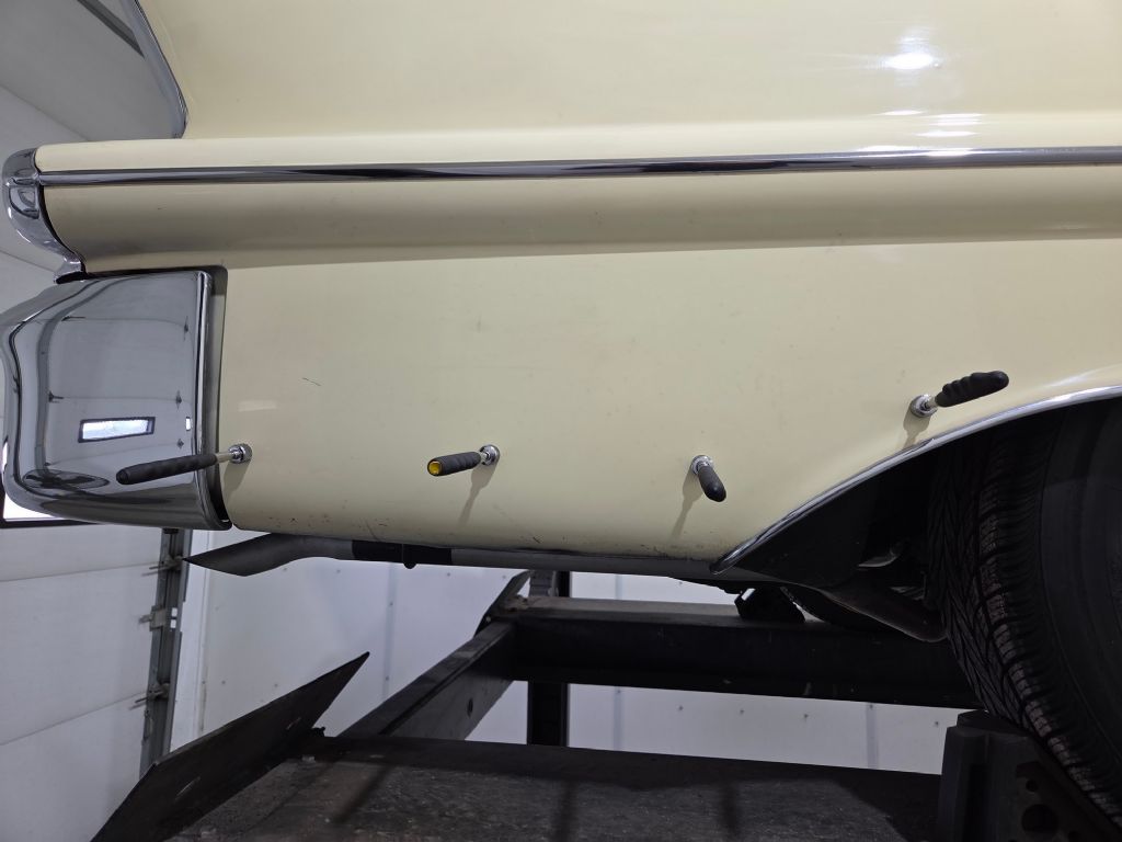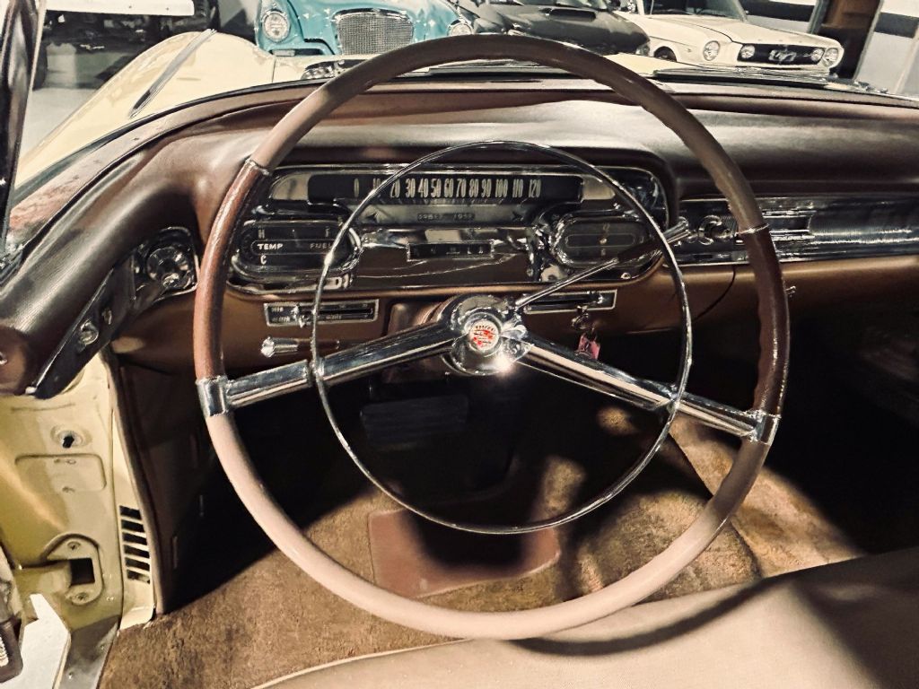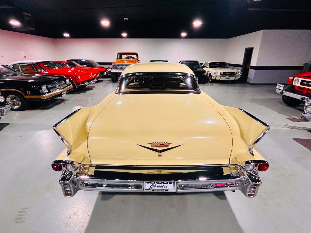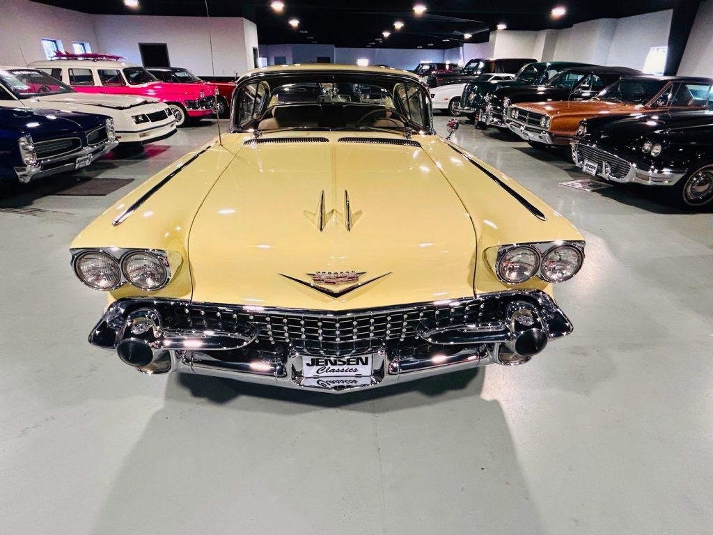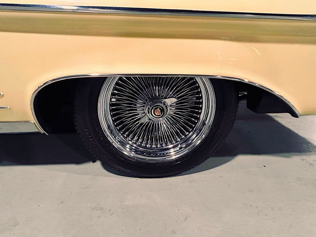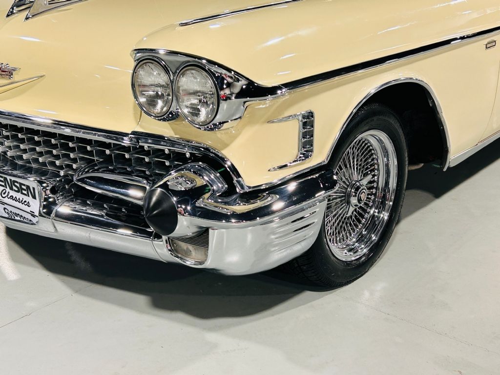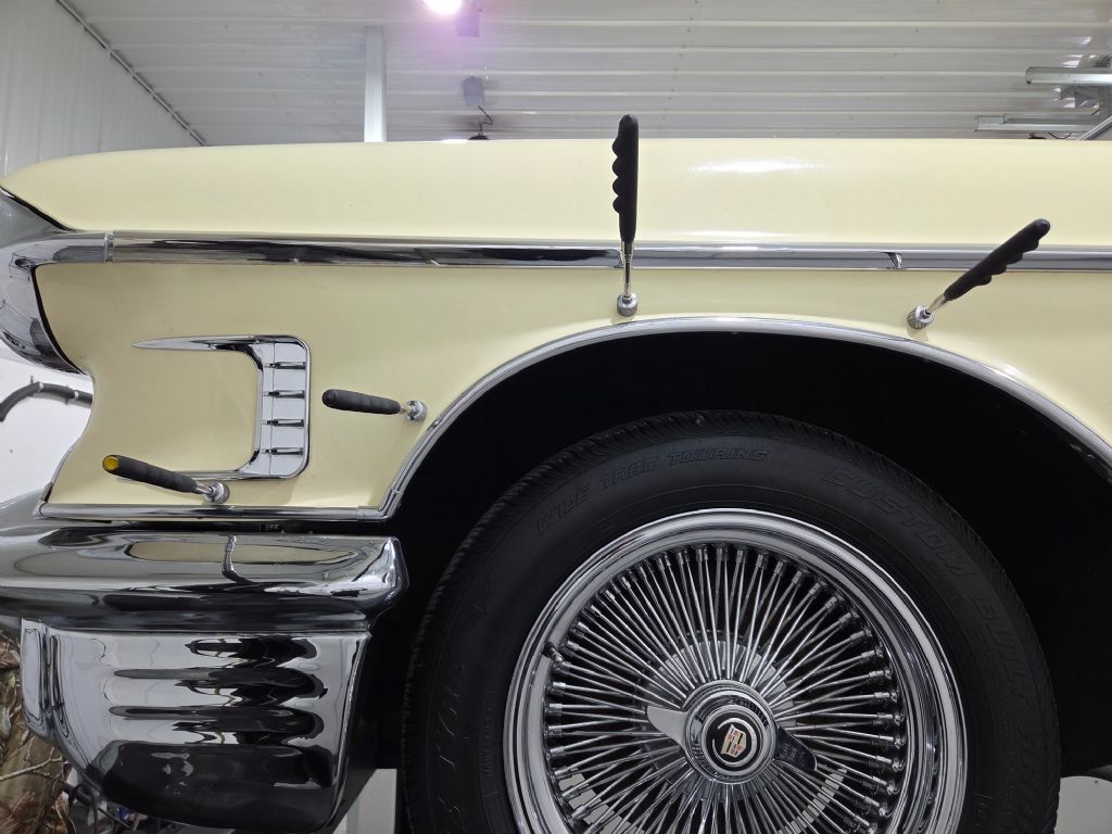 1958 Cadillac Coupe. • Laser straight and rust free • Exceptional chrome and bright work • Refinished in factory Calcutta cream • Original broadcloth interior • Power steering • Power brakes • Working factory radio • Driver side remote mirror • Wire wheels • Vogue tires • Original Cadillac identification card • New gas tank and sending unit