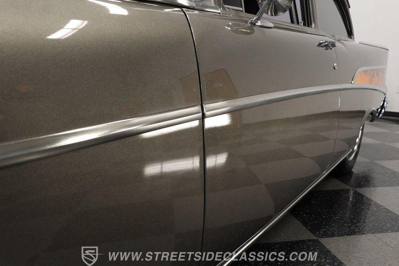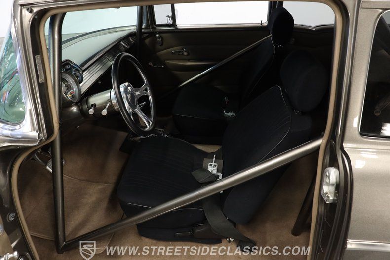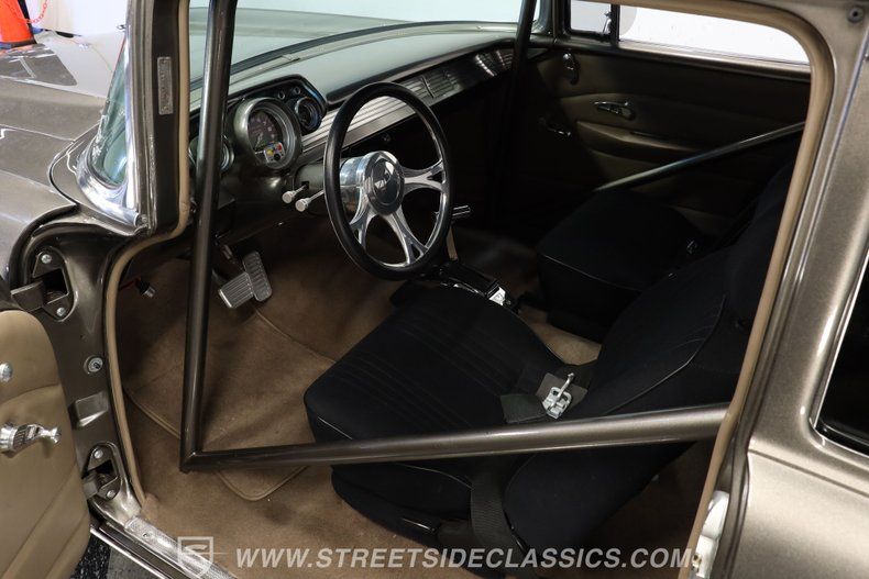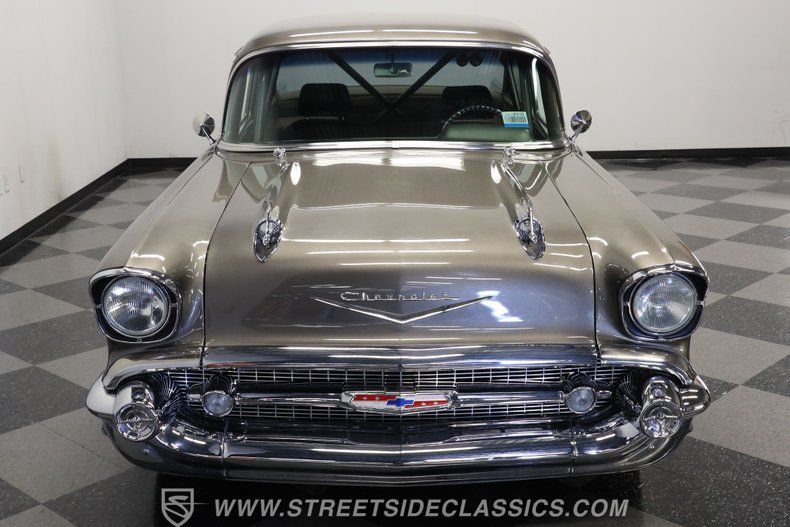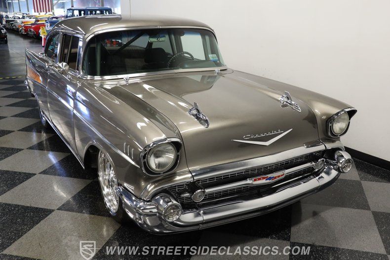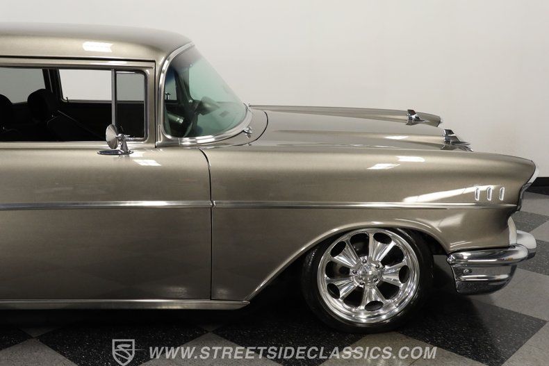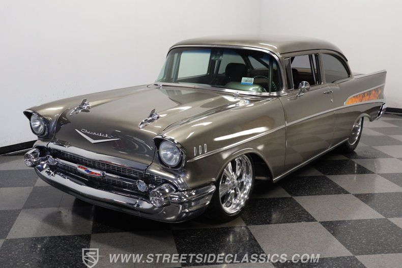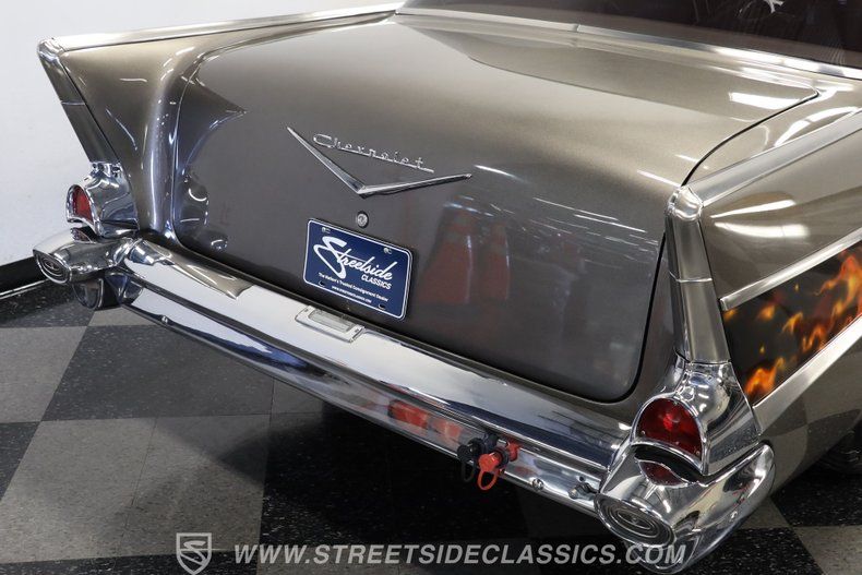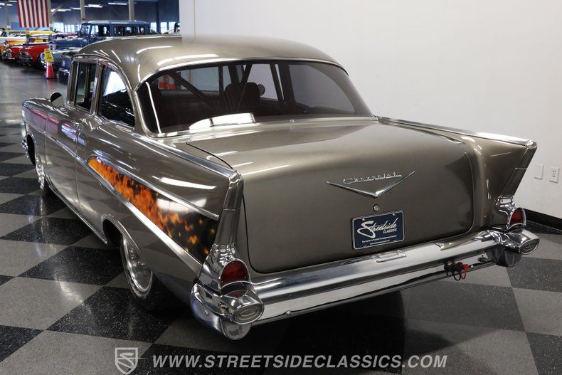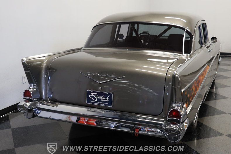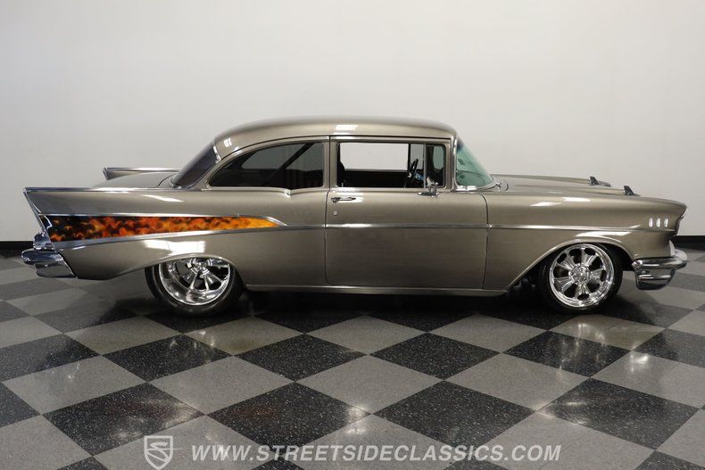 In the realm of the autoverse, few vehicles have starred in more enthusiasts' fantasies than the iconic '57 Chevy. Whether Concours show level, restomod, race-ready, or somewhere in between, there really is nothing like it. As the flaming quarter panels not-so-subtly hint, this gorgeous, fully repainted grey 1957 Chevrolet Bel Air Pro Street model we have for you is truly one of a kind. Starting with its sturdy two-door post configuration, this head-turner has undergone a show-car conversion that makes it impossible to ignore. With its painted three-piece front bumper, painted grille, H4 headlights set in custom-painted bezels, gorgeous polished Budnick wheels shod with skinny front tires, contrasted with huge Mickey Thompsons out back, in classic hot-rod style. With custom suspension, no frills interior, and full six-point roll cage, this '57 is poised to be a true boulevard bruiser.