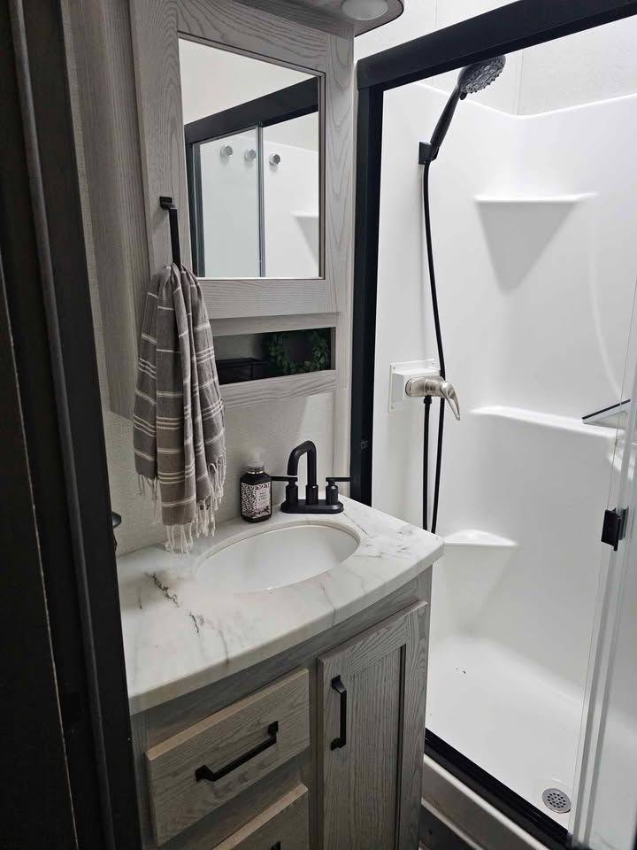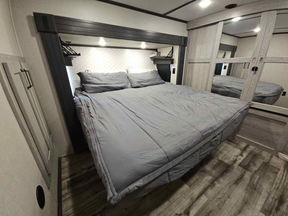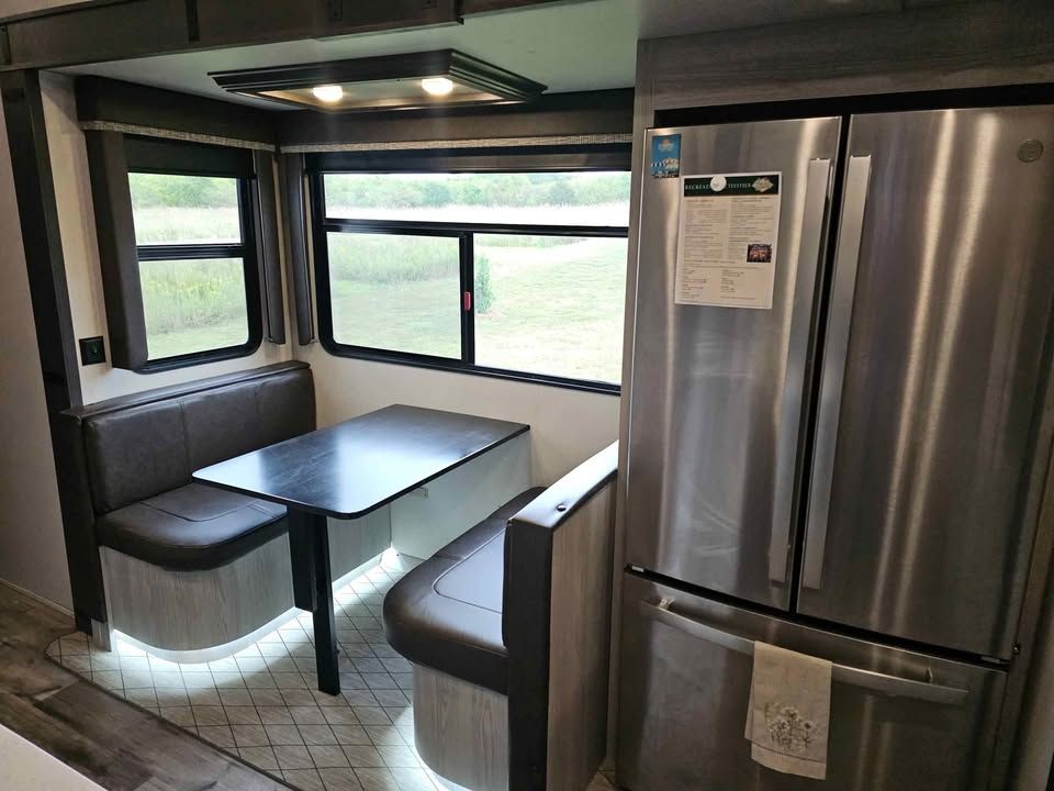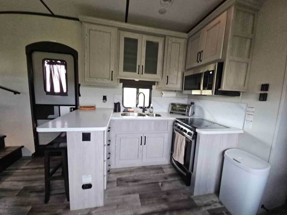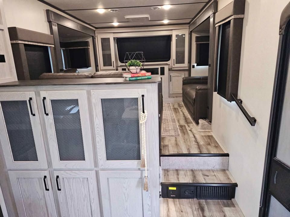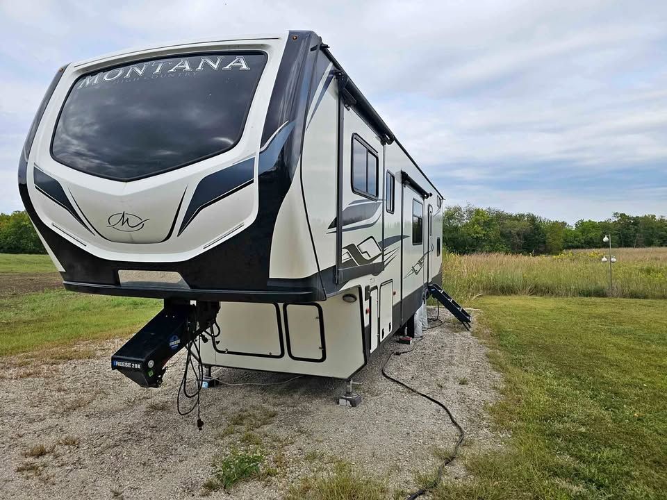 This 2022 Keystone Montana High Country 377FL is the perfect option for those seeking both adventure and comfort on the road. This fifth wheel is well-equipped with a range of features designed to enhance your travel experience. It boasts an innovative floor plan with a spacious front living area, perfect for relaxation and entertainment, complete with a large flat-screen TV, electric fireplace, and ample seating. The kitchen is fully equipped with modern appliances, including a residential refrigerator, three-burner stove, oven, and microwave, providing all the conveniences of home. The master suite includes a king-sized bed, plenty of storage, and washer/dryer prep for added convenience on extended trips. An expandable bathroom with large shower ensures comfort on the go. Additional features include a dual entry design for easy access, auto-leveling system for quick setup, and climate control for all-weather travel. The durable construction ensures reliability and longevity, making this RV an ideal choice for both short getaways and extended journeys.