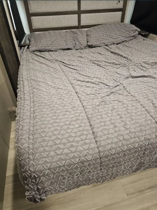 - Interior Updates: Replaced the stock dinette with four permanent gray chairs and added custom bedding and window treatments for the laundry area.