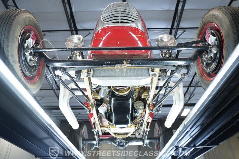 Under the hood, a robust 360 V8 commands attention, enhanced by an Edelbrock Streetmaster 318 aluminum intake manifold and a Vintage Speed adapter plate with dual two-barrel carburetors. Electronic ignition provides reliable starts and smooth idling, while long tube headers feed a dual straight-pipe exhaust for a signature hot rod growl. The 3-speed automatic transmission (A904) shifts confidently, and the 12-volt system with alternator, aluminum radiator, and electric fan ensure cool and consistent performance. This machine's lightweight chassis, solid axle front, and adjustable Ridetech coil-over rear suspension mean you're always in touch with the road.