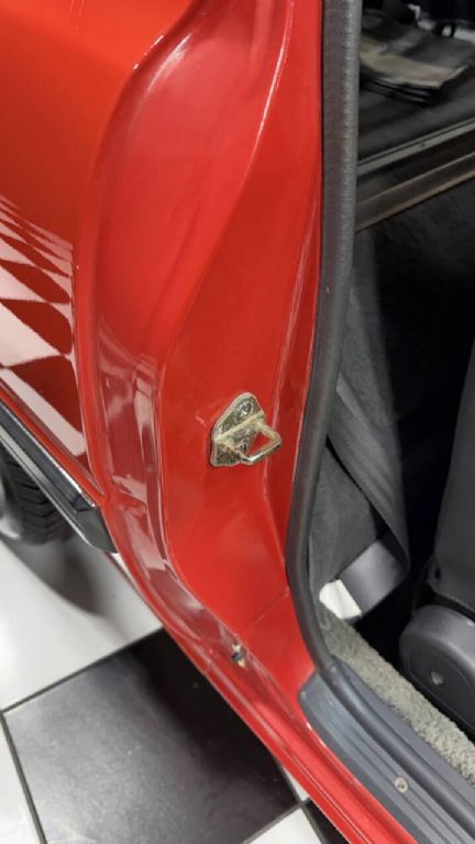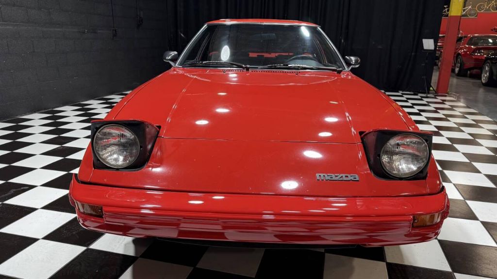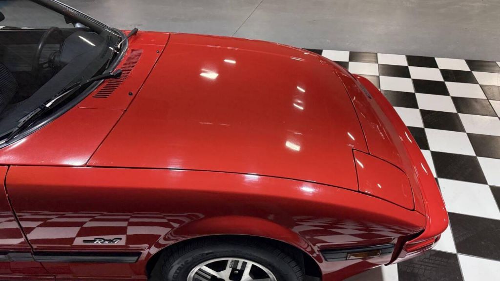 This RX-7 has a Factory-finished Sunrise Red (RH), the car features a sunroof, pop-up headlights, power-adjustable side mirrors, a rear spoiler, a rear-window wiper and louvers, with a power antenna. Four-spoke 13 alloy wheels are mounted with 185/70 Heritage Metric TR tires.