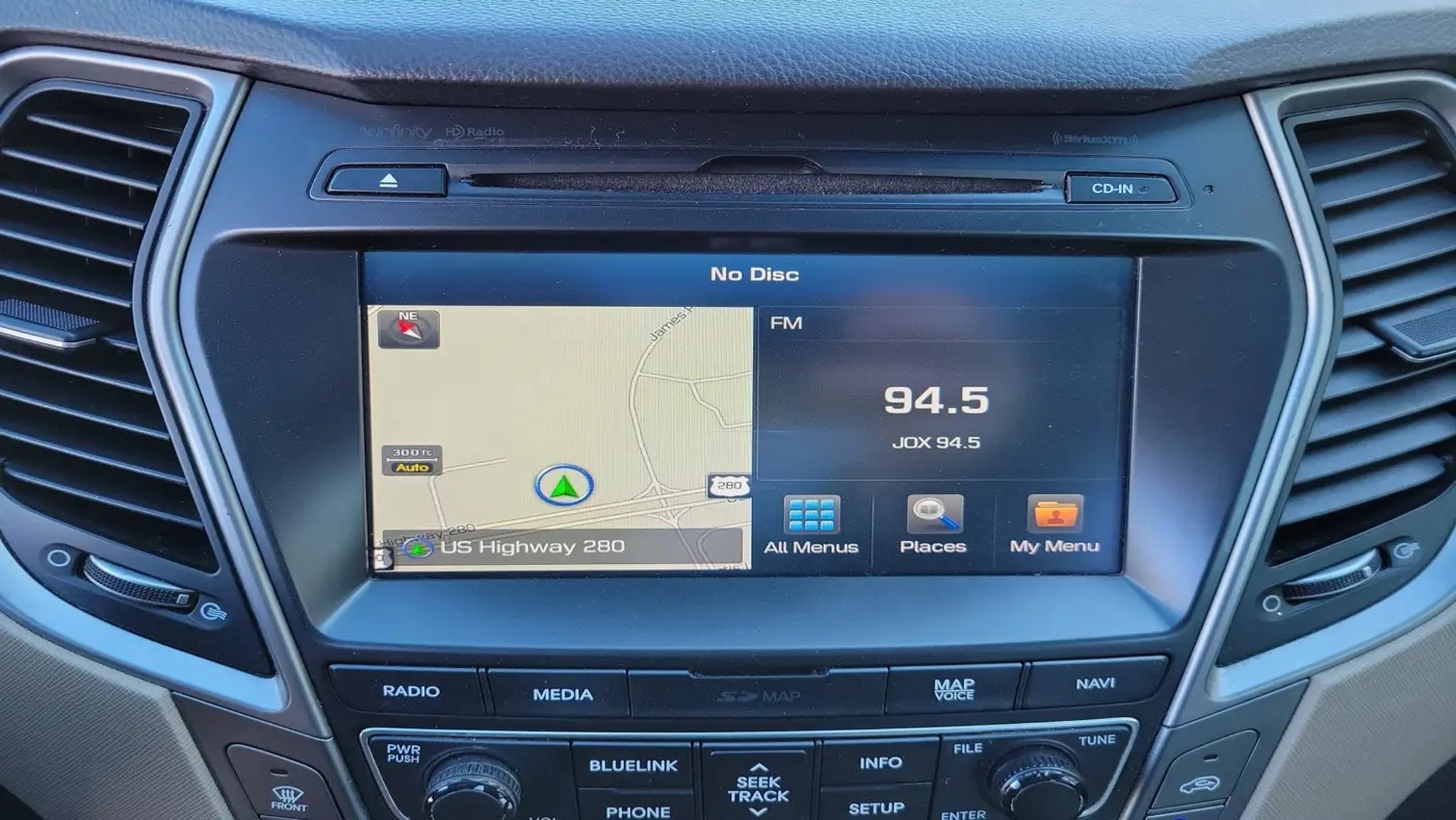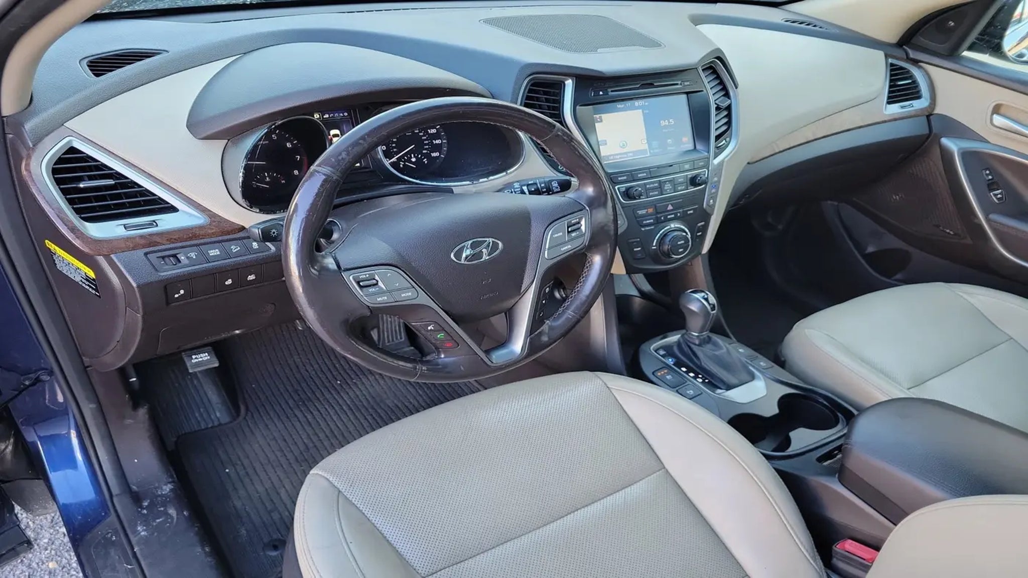 Tony Serra Ford in Sylacauga, AL - serving Chelsea, Alexander City and the Greater Birmingham Area! We can take care of all your automotive needs under one roof, from finding your next car to securing financing to keeping it maintained. Our commitment to your 100% satisfaction will help you experience the Tony Serra Ford Difference with features like our free warranty protection on every new Ford for unlimited time and miles, a 30-day low price protection guarantee, a 3-day Love It or Leave It exchange policy, and more. Tony Serra Ford 40905 Highway 280, Sylacauga, AL 35150 Sales: 256-245-5000 All new vehicles include a $1000 trade-in assistance dealer discount and a $1000 financing discount. Requirements to qualify for pricing: vehicle trade year model of 2018 or newer and less than 125,000 miles. Must use dealer provided lenders to qualify for financing assistance. Price does not include tax, tag, title, license, fees and dealer installed options. All factory rebates and incentives are applied to price; not all customers will qualify for all incentives. May require approved credit. Some restrictions may apply. Pricing and details are believed to be accurate, but we do not warrant or guarantee such accuracy. Image, prices, specifications and availability are subject to change without notice and may not apply to this specific vehicle. Specifications and availability are subject to change without notice and may not apply to this specific vehicle.Storm Blue 2017 Hyundai Santa Fe SE Ultimate FWD 6-Speed Automatic with Shiftronic 3.3L V6 DGI DOHC 24V Beige Leather.