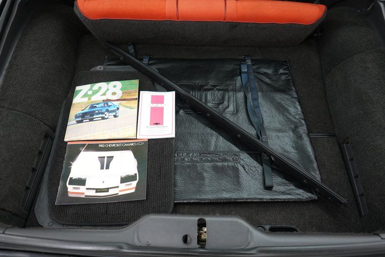 THIS VEHICLE IS LOCATED IN OUR PA. SHOWROOM !!!!! 5.0L L69 H. O. V8 Chevrolet Engine. 5-Speed Manual Transmission. Power Steering. Power Brakes. Front Disc Brakes. Rear Drum Brakes. 15 Inch Wheels. Front Tires: 215/65/15. Rear Tires: 215/65/15. GM 10 Bolt Rear End. 3.73 Gear Ratio. Stock Intake. 4 Barrel Quadrajet Carburetor. Stock Distributor. Stock Coil. Mechanical Fuel Pump. Stock Ignition. Stock Radiator. Electric Cooling Fan. Black Exterior. 13,972 Original Miles. Original Wheels Included. Color Matched Driver & Passenger Side Mirrors. Removable T-Tops. Rear Defrost. Hatch Mounted Spoiler. Black Window Trim. Fog Lights. Hood Louvers. Orange & Red Conteur Cloth Interior. Power Windows. Front Bucket Seats. Rear Bench Seat. Factory AM/FM/Cassette Radio. Manual Adjust Seats. Remote Driver Side Mirror. Factory Gauges. Tilt Steering Column. Center Console. 1 1/4" Front Sway Bar. 1" Rear Sway Bar. Black Carpeting. Black Headliner. Black & Orange Door Panels. 3" Exhaust . Transverse Muffler. Dual Exhaust Tips. Catalytic Converter. Lower Body Stripes. All Original. Real Z/28.