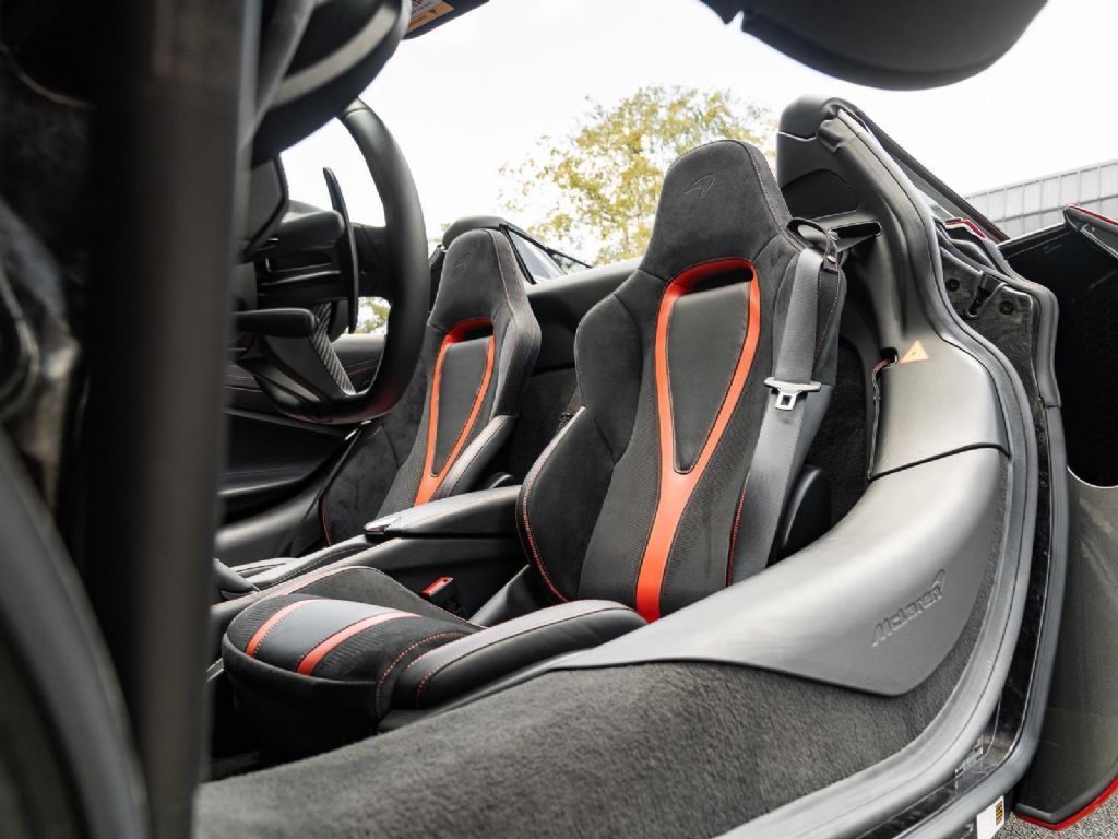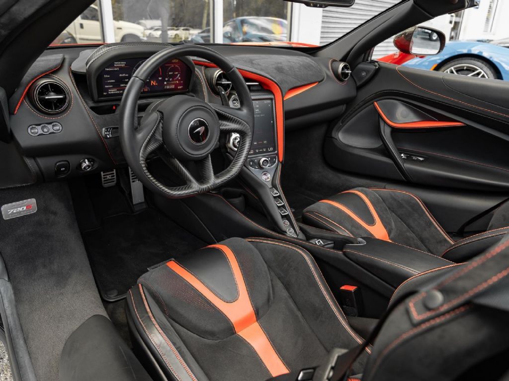 Power comes from a mid mounted 4.0 liter twin turbocharged V8 producing approximately 710 horsepower and 568 lb ft of torque, paired with a 7 speed Seamless Shift dual clutch transmission driving the rear wheels. Performance is extraordinary, with 0 to 60 mph achieved in 2.8 seconds, a top speed of 212 mph with the roof closed (around 202 mph open), and a curb weight near 3,340 pounds, contributing to an exceptional power to weight ratio. Advanced Proactive Chassis Control II suspension, carbon ceramic braking, and active aerodynamics provide both track level capability and surprising road comfort, reinforcing the 720S Spider's reputation as one of the most complete supercars of its era. With ultra low mileage, a striking color combination, and McLaren's flagship performance engineering, this example stands as a highly compelling addition to any exotic collection.