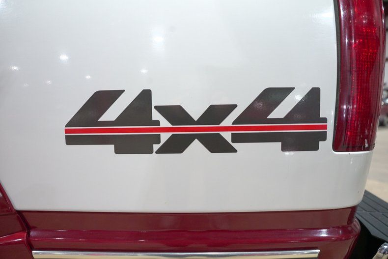 The exterior retains its original factory two-tone Cherry Red Metallic and Summit White finish. The body is straight with shining chrome and minimal wear, equipped with factory Silverado trim, 16" wheels, and a bedliner that has preserved the factory bed in excellent condition. Inside, the Red Custom Cloth interior features a 60/40 split bench seat, tilt wheel, cruise control, power windows, and power locks. It also includes the original AM/FM cassette stereo and an added CB radio for period authenticity.