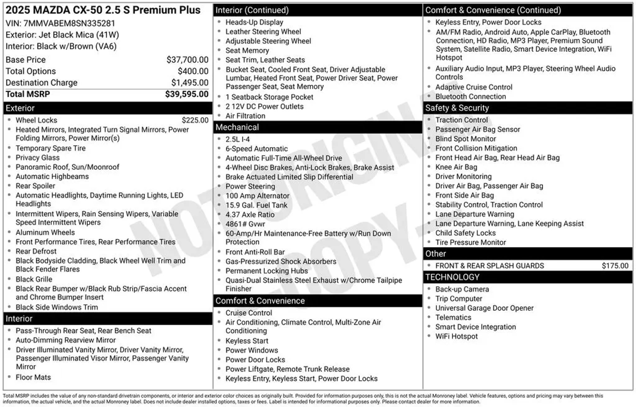 Discover the perfect blend of style, performance, and versatility with this stunning 2025 Mazda CX-50 2.5 S Premium Plus Package. This sleek and dynamic SUV is ready to elevate your driving experience and take you on unforgettable adventures. Boasting an impressive array of premium features, this CX-50 is equipped to cater to your every need. Key highlights include: - Bluetooth connectivity - Backup camera - Apple/Android CarPlay - Leather seating - Clean CARFAX history - One-owner vehicle Complementing these impressive features are the vehicle's striking black exterior and the added style of black lug nuts and wheel locks, as well as front and rear splash guards. Under the hood, this CX-50 is powered by Mazda's renowned SKYACTIV® 2.5L 4-cylinder engine, paired with a smooth-shifting 6-speed automatic transmission and all-wheel drive. With an impressive EPA-estimated 25 MPG in the city and 31 MPG on the highway, this SUV delivers exceptional efficiency without compromising performance. The interior of this CX-50 is a true sanctuary, with a wealth of premium amenities that elevate your driving experience. Enjoy the convenience of dual-zone automatic climate control, a Bose 12-speaker audio system, and a power moonroof that floods the cabin with natural light. This vehicle has been meticulously maintained and is certified to provide you with the peace of mind you deserve. With its exceptional features, efficient powertrain, and premium styling, this 2025 Mazda CX-50 2.5 S Premium Plus Package is the perfect choice for those seeking a versatile and refined SUV. All of our vehicles come standard with a professional inspection by certified technicians and most vehicles qualify for our LIFETIME WARRANTY! We also price our vehicles very aggressive to make sure we have fresh inventory for you. Our vehicles typically sell within 20-30 days upon stocked in so if you see something you like give us a call ASAP. Always ask if you qualify for our $1,500 trade in voucher!
