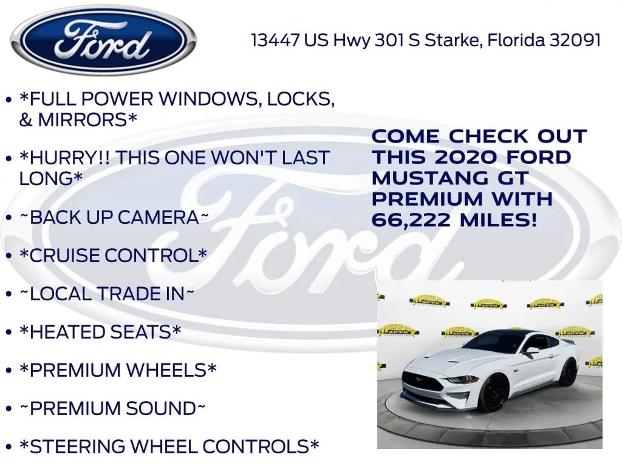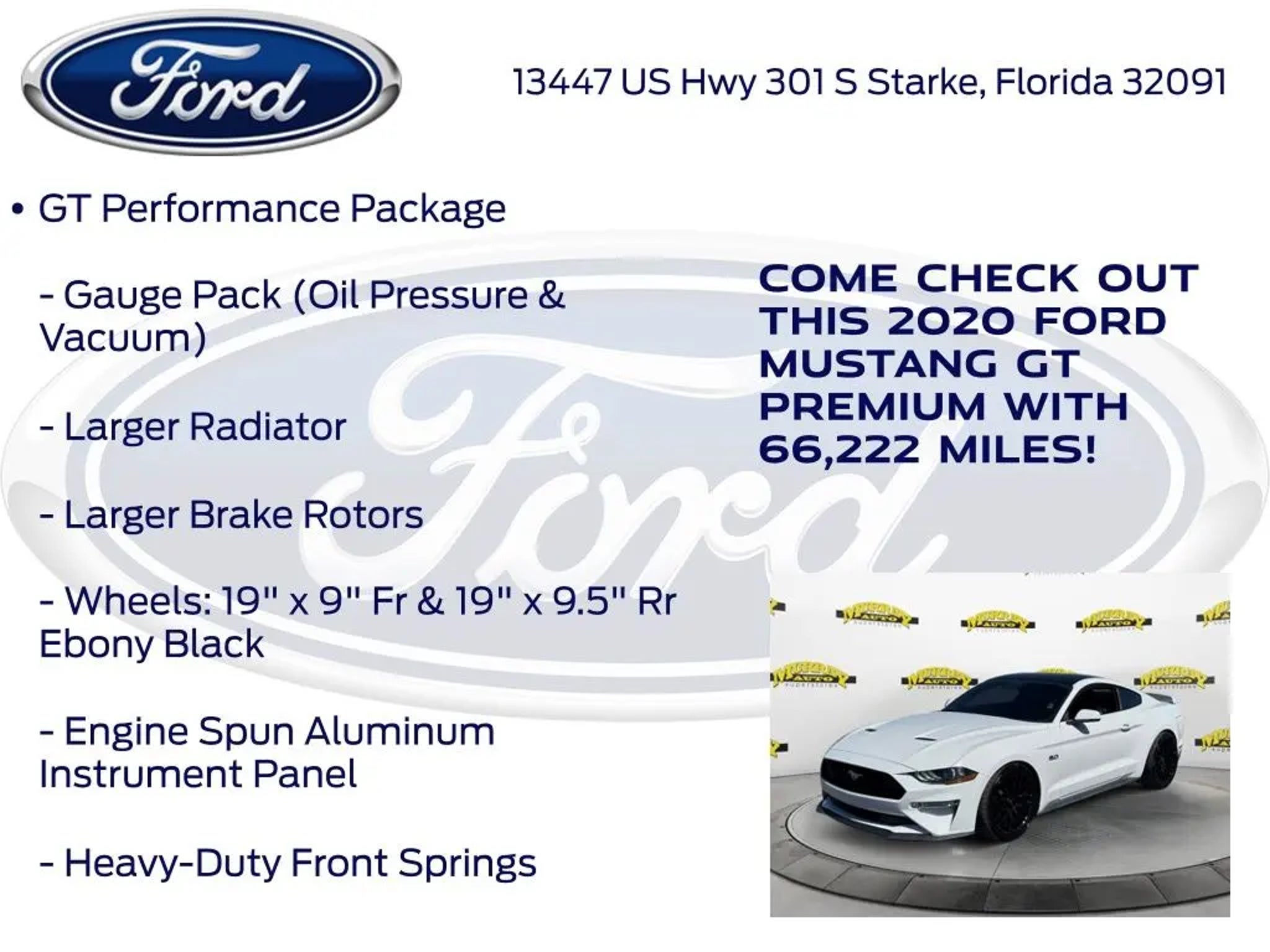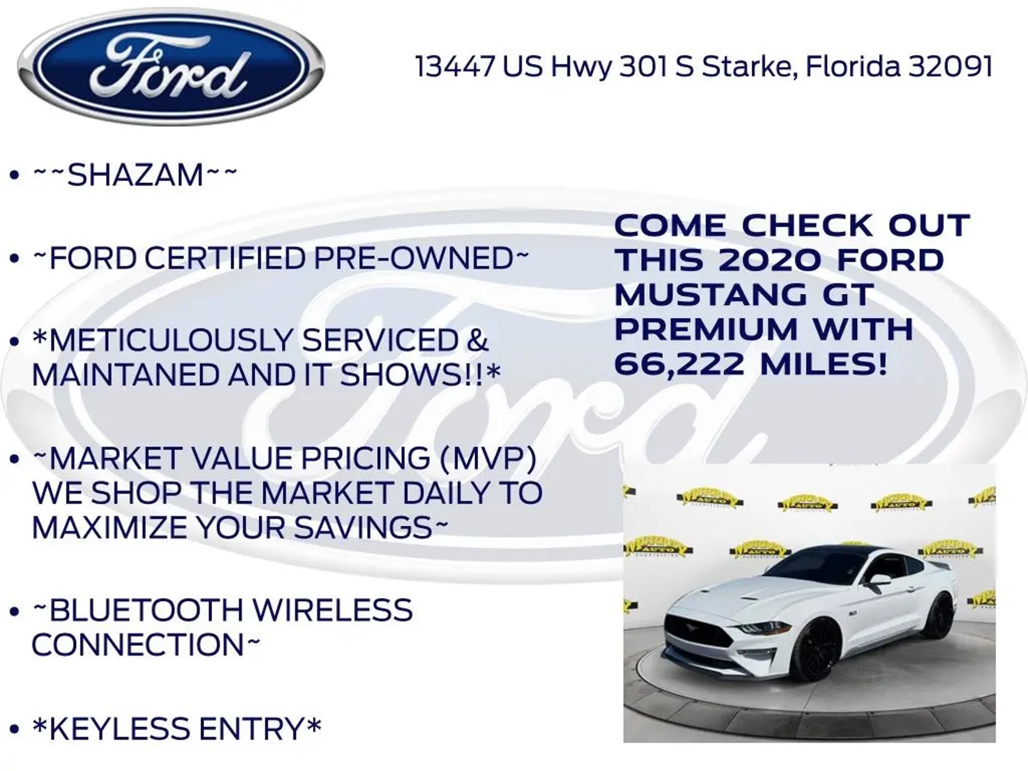 Murray Ford Superstore of Starke is proud to offer this great 2020 Ford Mustang in Oxford White This vehicle is readily available and comes with the following Equipment Group 401A (Blind Spot Info System w/Cross-Traffic Alert, Leather Bucket Seats w/Color Accents, and Memory Driver Seat, Mirrors & Ambient Lighting), Ford Safe & Smart Package (Adaptive Cruise Control, Automatic High Beam, Lane-Keeping System, Pre-Collision Assist w/Pedestrian Detection, and Rain-Sensing Windshield Wipers), GT Performance Package (Engine Spun Aluminum Instrument Panel, Gauge Pack (Oil Pressure & Vacuum), Heavy-Duty Front Springs, Larger Brake Rotors, Larger Radiator, Unique Stability Control, and Wheels: 19 x 9 Fr & 19 x 9.5 Rr Ebony Black), Premium Plus Package (12 LCD Digital Instrument Cluster w/MyColor, Heated Steering Wheel, and Voice-Activated Touch-Screen Navigation System), Ford Blue Certified Certified, 4-Wheel Disc Brakes, 9 Speakers, ABS brakes, Active Valve Performance Exhaust, Air Conditioning, Alloy wheels, AM/FM radio: SiriusXM, AM/FM Stereo, Auto-dimming Rear-View mirror, Automatic temperature control, Brake assist, Bumpers: body-color, Climate Controlled Heated/Cooled Front Seats, Compass, Delay-off headlights, Driver door bin, Driver vanity mirror, Dual front impact airbags, Dual front side impact airbags, Electronic Stability Control, Emergency communication system: 911 Assist, Exterior Parking Camera Rear, Four wheel independent suspension, Front anti-roll bar, Front Bucket Seats, Front Center Armrest, Front dual zone A/C, Front fog lights, Front reading lights, Fully automatic headlights, Garage door transmitter, HD Radio, Heated door mirrors, Heated front seats, Illuminated entry, Knee airbag, Leather Bucket Seats, Leather Shift Knob, Low tire pressure warning, Occupant sensing airbag, Outside temperature display, Overhead airbag, Overhead console, Panic alarm, Passenger door bin, Passenger vanity mirror, Power door mirrors, Power driver seat, Power passenger seat, Power steering, Power windows, Premium Floor Mats w/Accent Stitch, Radio data system, Radio: B&O Sound System by Bang & Olufsen, Rear anti-roll bar, Rear window defroster, Remote keyless entry, Security system, SiriusXM Radio, Speed control, Speed-sensing steering, Speed-Sensitive Wipers, Split folding rear seat, Spoiler, Steering wheel mounted audio controls, SYNC 3 Communications & Entertainment System, Tachometer, Telescoping steering wheel, Tilt steering wheel, Traction control, Trip computer, Turn signal indicator mirrors, Variably intermittent wipers, Ventilated front seats, Voltmeter, and Wheels: 18 x 8 Machined-Face Aluminum; Ford Blue Certified Details: * Limited Warranty: 3 Month/4,000 Mile (whichever comes first) after new car warranty expires or from certified purchase date * Transferable Warranty * 139 Point Inspection * Roadside Assistance * Vehicle History * and 11,000 FordPass Rewards Points to use toward first maintenance visit * Warranty Deductible: $100 15 Year 150,000 mile warranty at no cost applies to all vehicles excluding Transit Vans, DRW Trucks, any SVT Models, or similar vehicles. See sales for details! All vehicles will have a $999.00 dealer fee added to the total sale price (excludes A,Z,D, and X plan customers). Taxes, tag, title fees and a $125 Electronic filling fee will be added to all vehicles in accordance with state laws of customers registering address. *** We make every effort to provide you with the most accurate, up-to-the-minute information, however it is your responsibility to verify with the Dealer that all details listed and installed options are accurate for this specific vehicle. To ensure accuracy, please contact the dealership to verify the exact options, features and programs that are included and are available for this specific vehicle prior to purchase. Price Does not Include any dealer installed options or accessories. *Dealer Discount includes $1000 Finance Bonus Cash and $1000 Trade-In