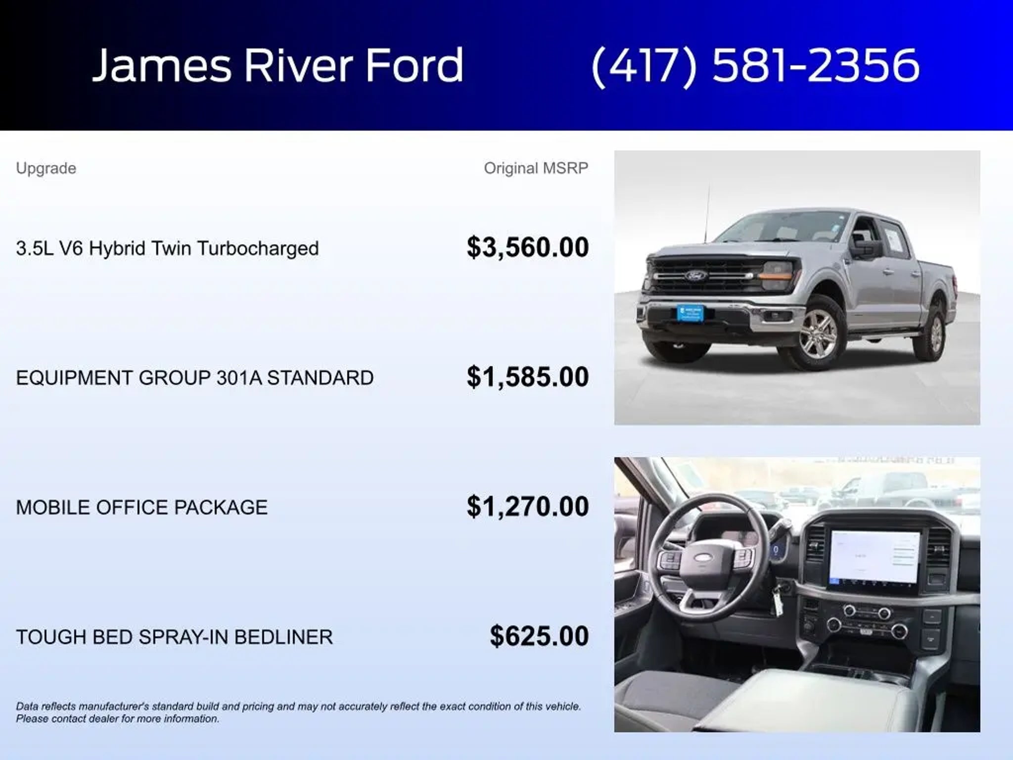 @JamesRiverFORD our local, family-owned dealership is focused on making your online experience the best yet! Just off HWY 65 and HWY CC, this 2025 Ford F-150 4X4 SuperCrew is painted in Iconic Silver Metallic and is powered by 3.5L PowerBoost Full Hybrid and is a CARFAX One-Owner vehicle. This F-150 is built with the following packages: Equipment Group 301A In addition, below are upgrades and added options: 3.5L PowerBoost Full Hybrid Mobile Office Package ToughBed Spray In Bedliner LED Fog Lamps 8 Way Power Drivers Seat Dual Zone Automatic Climate Control SYNC 4 with 12 Inch Screen and Apple CarPlay and Android Auto BLIS with Cross Traffic Alert Class IV Trailer Hitch with Smart Trailer Tow Connector Lane Keeping System Other premium features include 3.5L PowerBoost Full-Hybrid V6, 4WD, 6 Angular Bright Anodized Step Bar, ABS brakes, Alloy wheels, Black Painted Grille w/Chrome Center Bar, Chrome Door & Tailgate Handles, Chrome Single-Tip Exhaust, Cloth 40/20/40 Front Seat w/Console, Compass, Dual-Zone Electronic Automatic Temperature Control, Electronic Stability Control, Equipment Group 301A Standard, Heated door mirrors, Illuminated entry, Low tire pressure warning, Remote keyless entry, Traction control, Wrapped Steering Wheel. At James River Ford, we believe buying a car should be as fun and exciting as driving one! No stress, no boring sales talk"”just great vehicles, great deals, and a team that actually cares. Whether you're looking for a rugged F-150, a head-turning Mustang, or an SUV with room for the whole crew, we've got a huge selection of quality new and pre-owned vehicles"”all priced to move faster than a Mustang on the open road. We proudly serve Ozark, Springfield, Nixa, Branson, Republic, Rogersville, Battlefield, Marshfield, Willard, Strafford, Bolivar, Aurora, Hollister, Clever, Highlandville, Forsyth, and beyond"”bringing big-city deals with small-town service to Southwest Missouri. Why Shop with Us? Huge Inventory "“ From F-150s to Mustangs to the adventure-ready Bronco, we have the Ford you want"”or we'll track it down like a hound on a scent! ðŸ�¶ðŸš— Competitive Pricing "“ No gimmicks, no games"”just real deals on real cars. 💰💨 Top Trade-In Values "“ We'll give you top dollar for your trade"”because your ride deserves some respect! 🚗💵 Flexible Financing "“ Good credit, bad credit, no credit? No problem. Our finance team can work some serious magic. 🎩 Customer-First Service "“ We treat you like family"”the kind you actually like spending time with. ðŸ�¡ðŸš˜ Videos Available on Request! "“ Want a closer look? We'll send a personalized video of any vehicle right to your phone"”like a car commercial made just for you! 🎥📱 No pressure, no hassle"”just great cars, great deals, and a team that's here to make your car-buying experience actually enjoyable. Check out our inventory today and see why people from all over Southwest Missouri trust James River Ford! 🚗💨. Ford Gold Certified Details: * Transferable Warranty * Powertrain Limited Warranty: 84 Month/100,000 Mile (whichever comes first) from original in-service date * Vehicle History * Roadside Assistance * and 22,000 FordPass Rewards Points to use toward first two maintenance visits * Limited Warranty: 12 Month/12,000 Mile (whichever comes first) after new car warranty expires or from certified purchase date * Warranty Deductible: $100 * 172 Point Inspection