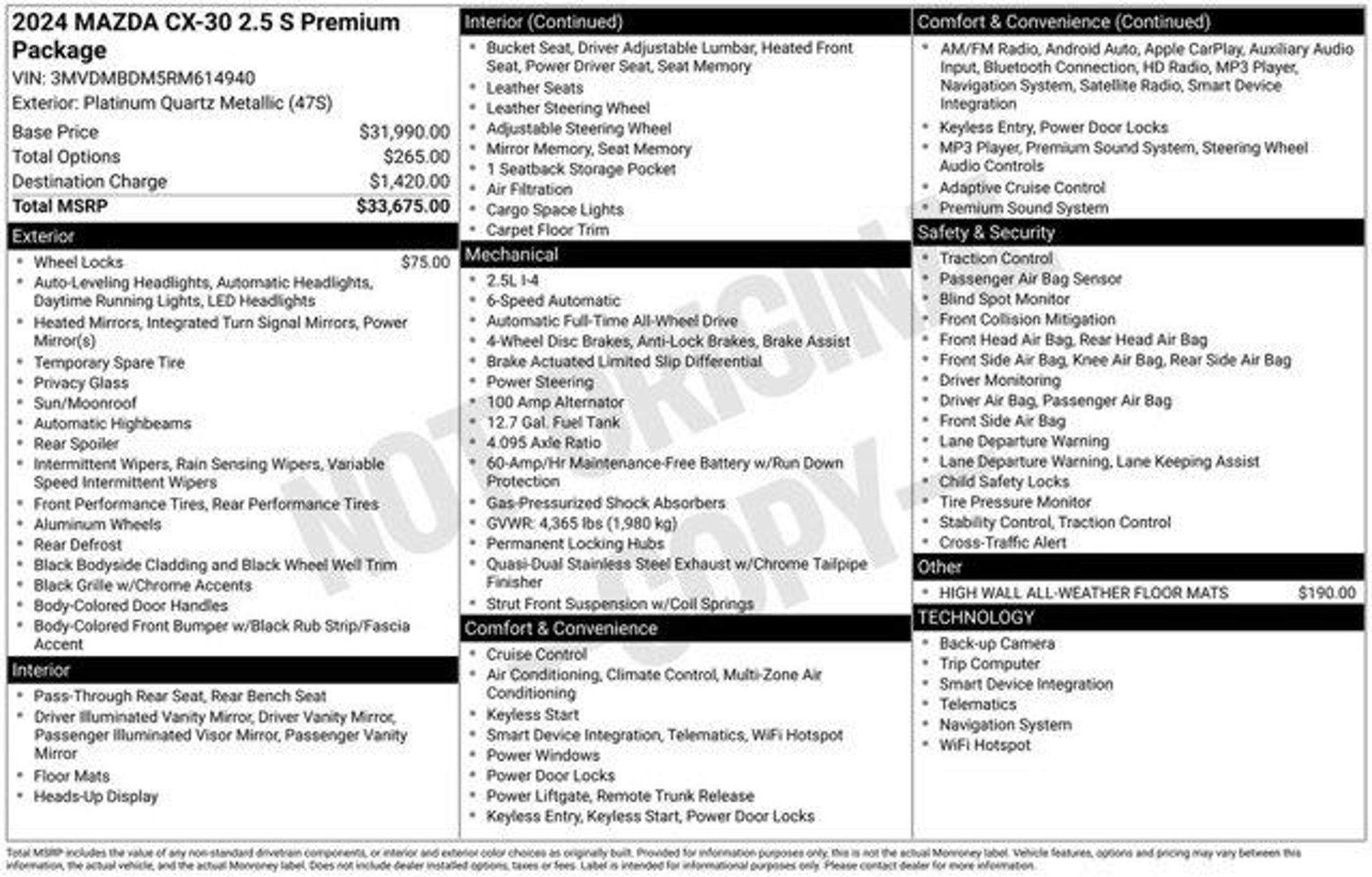 Certified. 2024 Mazda CX-30 2.5 S Premium Package Platinum Quartz Metallic AWD 6-Speed Automatic SKYACTIV? 2.5L 4-Cylinder DOHC 16VWelcome to Mel Hambelton Ford in Wichita, KS. All of our cars are hand picked and inspected for your peace of mind. This CX-30 is equipped with the following options: 12 Speakers, 4-Wheel Disc Brakes, 4.095 Axle Ratio, ABS brakes, Air Conditioning, Alloy wheels, AM/FM radio: SiriusXM, AppLink/Apple CarPlay and Android Auto, Auto High-beam Headlights, Automatic temperature control, Brake assist, Bumpers: body-color, Compass, Delay-off headlights, Driver door bin, Driver vanity mirror, Dual front impact airbags, Dual front side impact airbags, Electronic Stability Control, Emergency communication system: Mazda Connected Services (3-year complimentary trial included), Exterior Parking Camera Rear, Front anti-roll bar, Front Bucket Seats, Front Center Armrest, Front dual zone A/C, Front reading lights, Front wheel independent suspension, Fully automatic headlights, Heads-Up Display, Heated door mirrors, Heated Front Bucket Seats, Heated front seats, High Wall All-Weather Floor Mats, Illuminated entry, Knee airbag, Leather Seat Trim, Leather Shift Knob, Leather steering wheel, Low tire pressure warning, MAZDA CONNECT Infotainment System, Memory seat, Navigation system: MAZDA CONNECT, Occupant sensing airbag, Outside temperature display, Overhead airbag, Overhead console, Panic alarm, Passenger door bin, Passenger vanity mirror, Power door mirrors, Power driver seat, Power Liftgate, Power moonroof, Power steering, Power windows, Radio data system, Radio: AM/FM/HD Audio System w/Mazda Navigation, Rain sensing wipers, Rear seat center armrest, Rear side impact airbag, Rear window defroster, Rear window wiper, Remote keyless entry, Speed control, Speed-sensing steering, Split folding rear seat, Spoiler, Steering wheel mounted audio controls, Tachometer, Telescoping steering wheel, Tilt steering wheel, Traction control, Trip computer, Turn signal indicator mirrors, Variably intermittent wipers, Wheel Locks, and Wheels: 18 x 7J Aluminum Alloy.Odometer is 33745 miles below market average! 26/33 City/Highway MPGView our entire inventory at www.mhford.com. See your wait time for Quick Lane service with our NEW Online Quick Lane Check-in tool at http://www.mhford.com/online-quick-lane-check-in.htm. Visit http://www.mhford.com/featured-vehicles/pre-owned.htm so you won?t miss out on all of our great vehicle Specials!