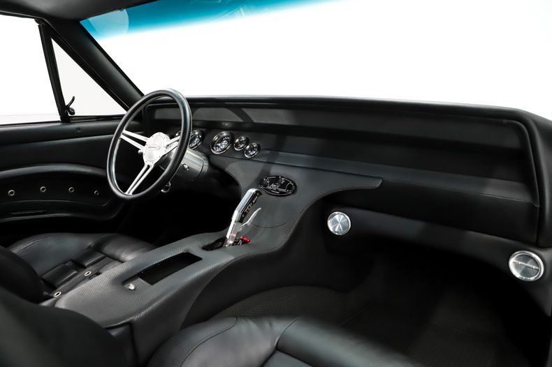 INTERIOR: The interior of this '67 Chevelle is a standout, completely custom-crafted by Riverside Custom & Classic Auto Interior, who delivered exceptional design and fit. Every surface is covered in high-quality leather, including the sculpted door panels, while four matching Procar Rally seats are split down the middle by a handcrafted center console. The console houses the TCI Outlaw shifter, along with neatly integrated ignition, power window, and headlight switches. The fully custom dash features a clean, modern set of gauges and Vintage Air controls, all complemented by a stylish steering wheel mounted on a brushed aluminum tilt column. The design theme continues seamlessly onto the rear shelf and headliner, tying the whole cabin together. Racing belts keep you securely in the contoured seats-perfect for spirited driving on curvy roads-while a unique, durable fabric covers the floor, combining style and practicality.