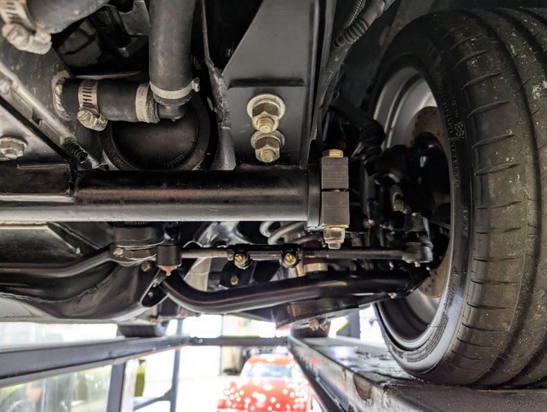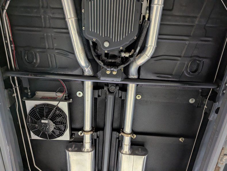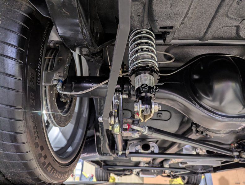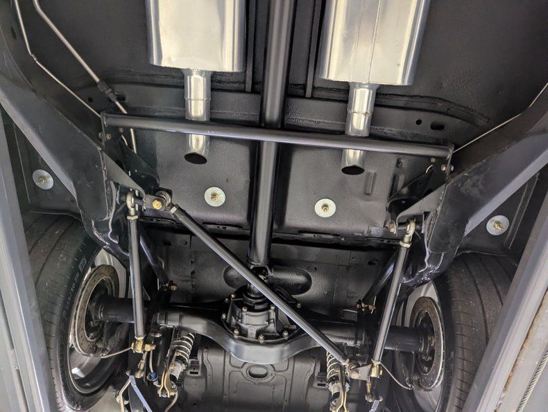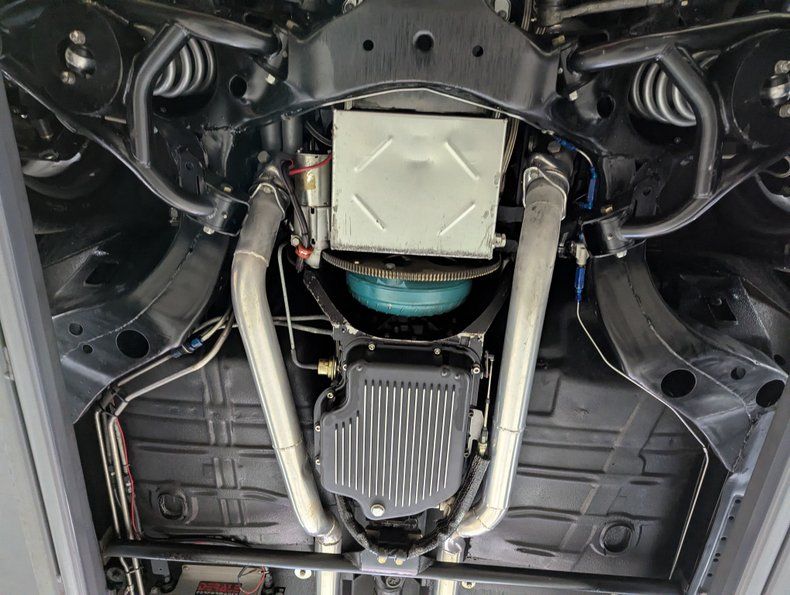 UNDERSIDE: The body was off of the frame and every item was upgraded. The front end has Heidts 2 inch drop spindles, tubular control arms, coilover adjustable gas shocks, and a splined swaybar. In back the frame was narrowed 5 inches per side, gusseted and reinforced to accommodate the wide tires. Upgraded with a 3 link system with adjustable panhard bar, adjustable control arms, coilover adjustable gas shocks, and a splined swaybar. Wilwood 4 wheel disc brakes with big drilled and slotted rotors, 6 piston calipers in front, 4 piston in back. The exhaust is custom made, ceramic coated 2.5" pipes with crossover and Flowmaster mufflers. A custom fuel tank and an Aeromotive A1000 fuel pump feeds the beast under the hood. Looking up at the motor it has an extra capacity oil pan and a high torque starter. The Turbo 400 automatic was pro built and has a 2800 stall and aluminum finned oil pan. In back is a Harrison Racing Fab 9 rear end with Detroit Locker 3.50 gears. The fabricated floors were coated in durable chip guard paint.