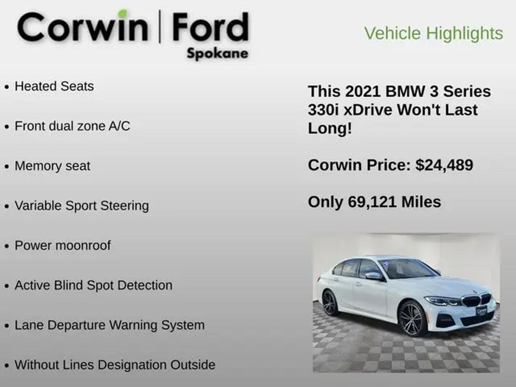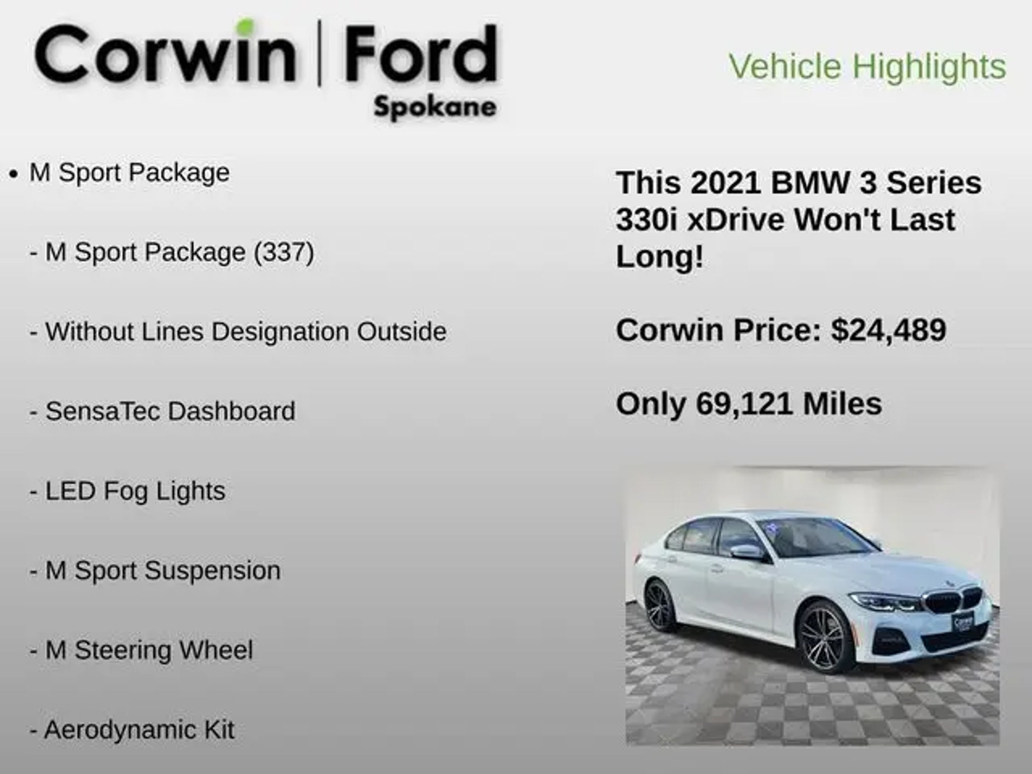 Discover the ultimate driving experience with this stunning 2021 BMW 3 Series 330i xDrive. Meticulously crafted and packed with a wealth of premium features, this vehicle is the perfect blend of performance, style, and sophistication. - M Sport Package - Heated Seats - Convenience Package - Driving Assistance Package - Front dual zone A/C - Memory seat - Variable Sport Steering - Power moonroof - Active Blind Spot Detection - Lane Departure Warning System - M Sport Suspension - Heated Steering Wheel Under the hood, this 3 Series is powered by a potent 2.0L 4-Cylinder DOHC 16V Turbocharged engine, delivering an exhilarating 8-Speed Automatic Sport transmission and the confidence of BMW's renowned All-Wheel Drive system. With an impressive 25 city / 34 highway MPG, you'll enjoy exceptional efficiency without sacrificing the thrill of the drive. Beyond its dynamic performance, this 3 Series boasts a stunning White exterior that commands attention, complemented by a wealth of premium features. The M Sport Package elevates the styling with Shadowline Exterior Trim, Aluminum Tetragon Trim, LED Fog Lights, and stylish 19-inch M Double-Spoke Bi-Color Jet Black wheels. The Convenience Package adds Ambient Lighting, Comfort Access Keyless Entry, and Lumbar Support, while the Driving Assistance Package enhances safety with Lane Departure Warning, Active Blind Spot Detection, and more. Inside, the cabin is a masterclass in luxury and technology. The Live Cockpit Pro with Navigation system keeps you connected and informed, while the Heated Front Seats and Heated Steering Wheel provide comfort in any weather. SensaTec upholstery, the M Steering Wheel, and the Sport Seats ensure a driver-focused experience that will have you eagerly anticipating every drive. This exceptional 2021 BMW 3 Series 330i xDrive is a true testament to the brand's commitment to engineering excellence. With its potent performance, premium features, and timeless style, it's the perfect choice for the discerning driver who demands the very best. We invite you to experience the thrill of the drive and schedule a test drive at our showroom today.