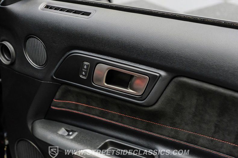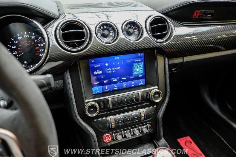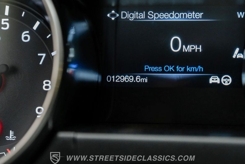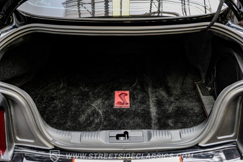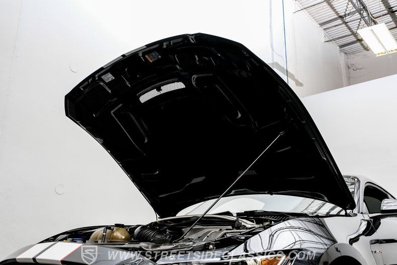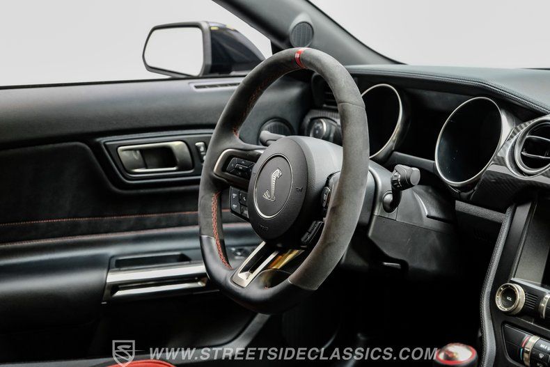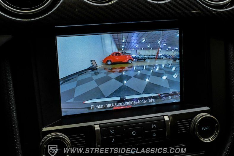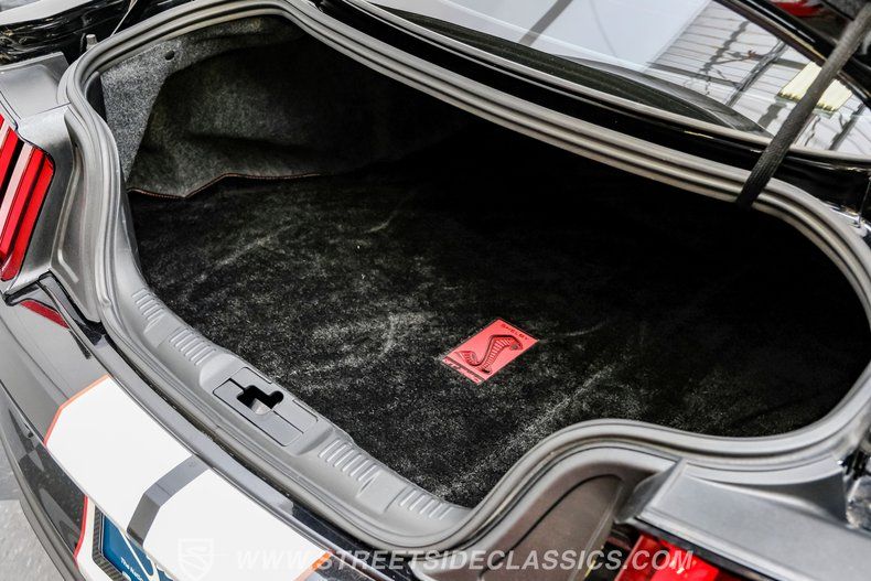 Inside, we find a well-appointed like-new stock interior. Recaro Suede Sport bucket seats hold both the driver and passenger comfortably in place, regardless of the number of G-forces at play. The rear seat has been deleted for added weight savings, while a three-spoke Alcantara-padded steering wheel features thumb controls and that unmistakable Cobra emblem center cap. This car is equipped with a Technology Package that includes features such as a Blind Spot Information System with cross-traffic alert. A voice-activated touchscreen infotainment system operates a twelve-speaker Bang and Olufsen AM/FM/Bluetooth/Satellite sound system, complete with navigation and a backup camera. Carbon fiber trim and red accents are subtle reminders that this car is race-ready whenever you are.