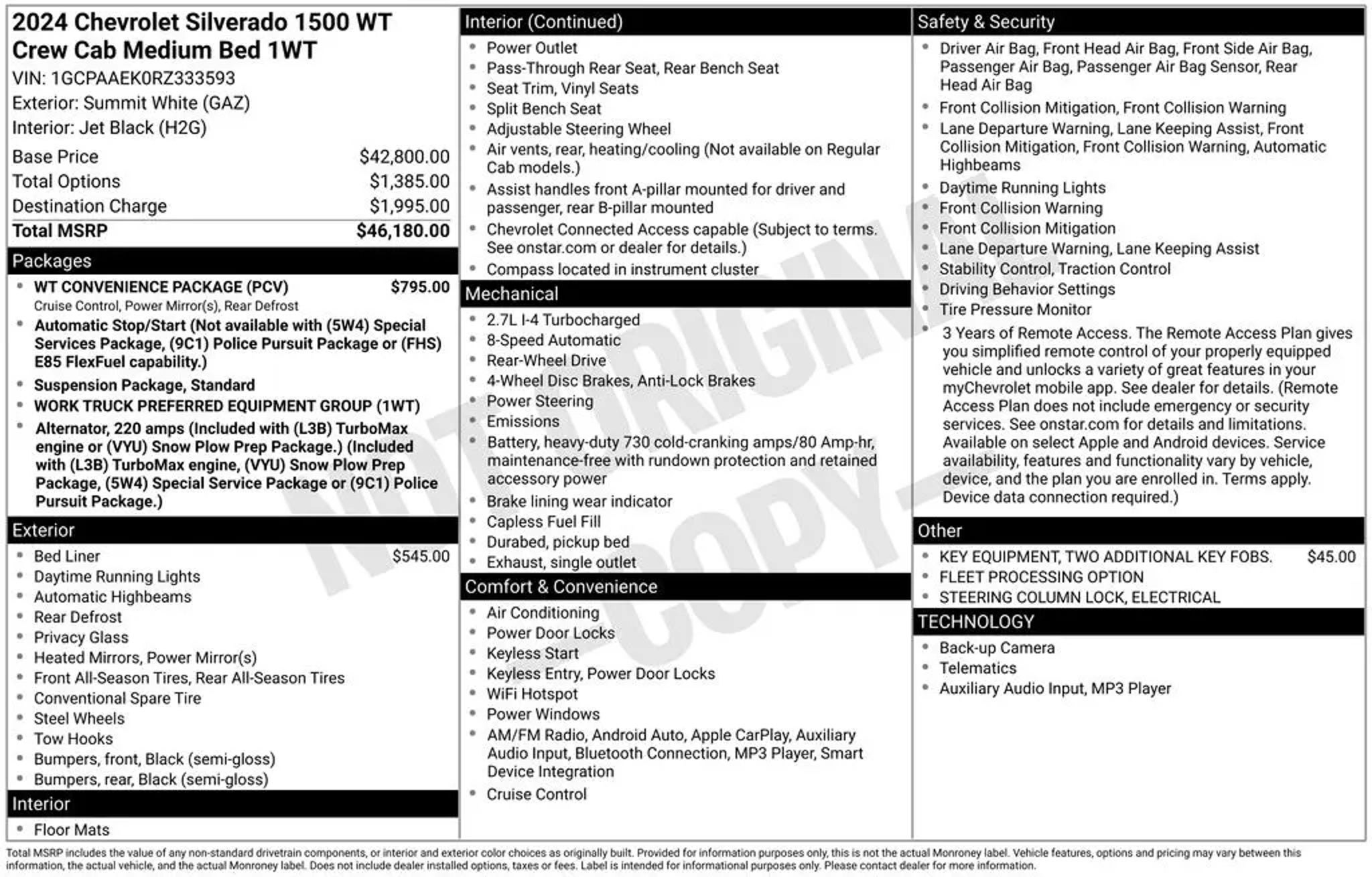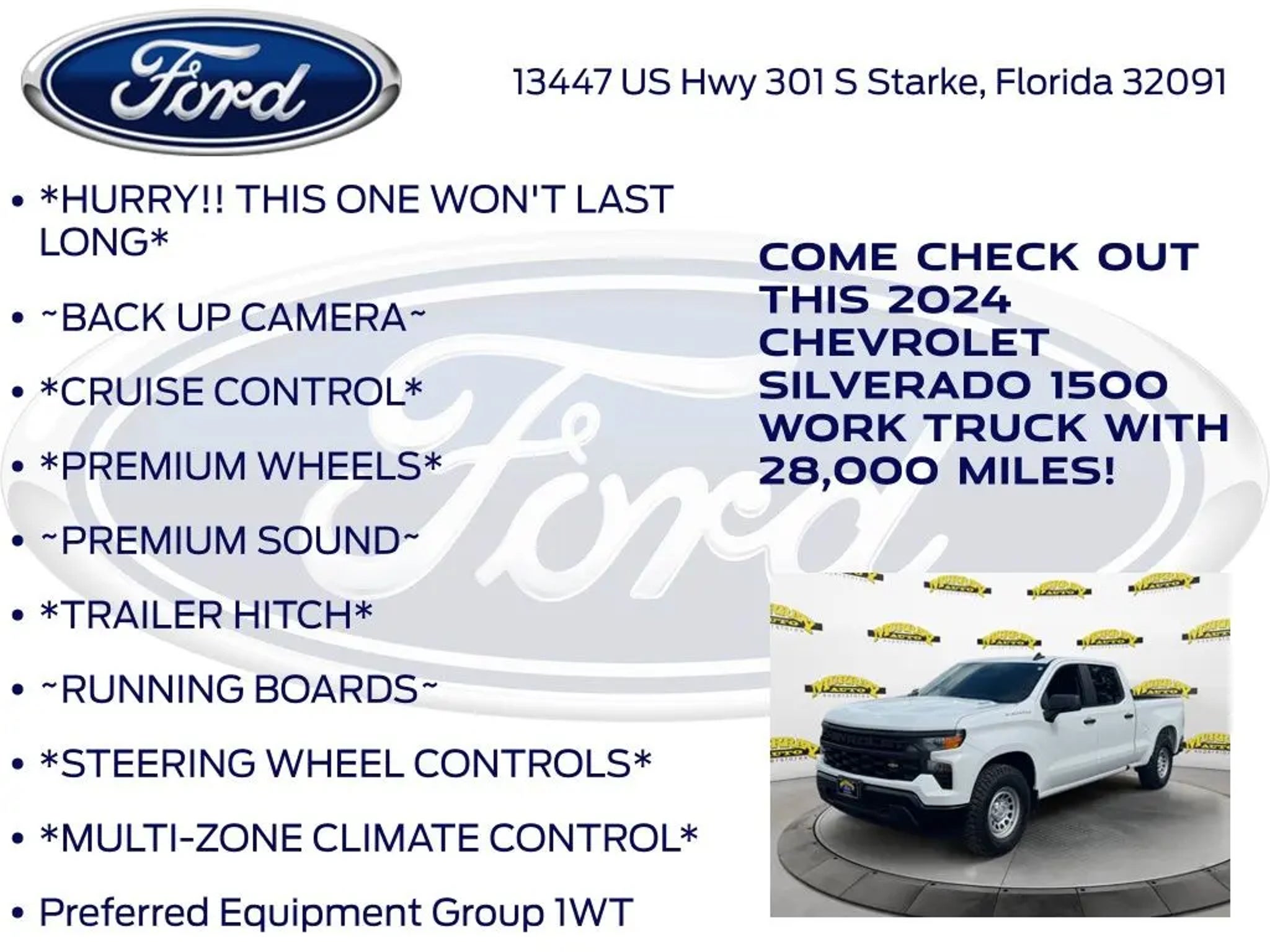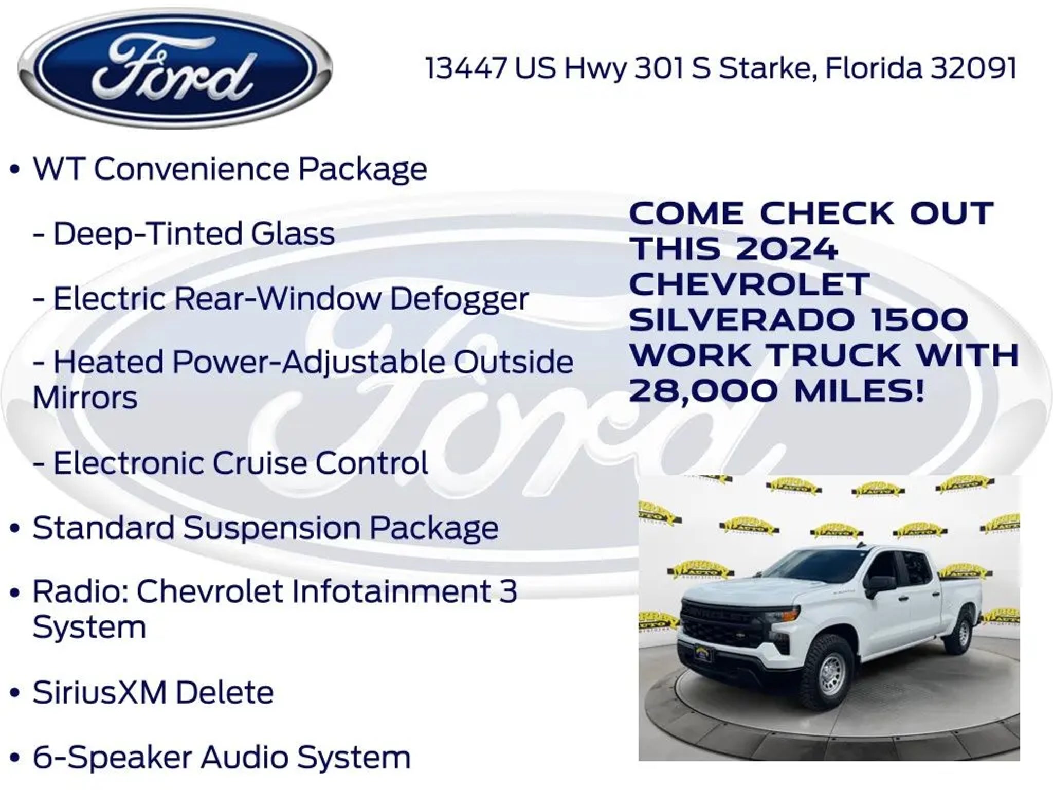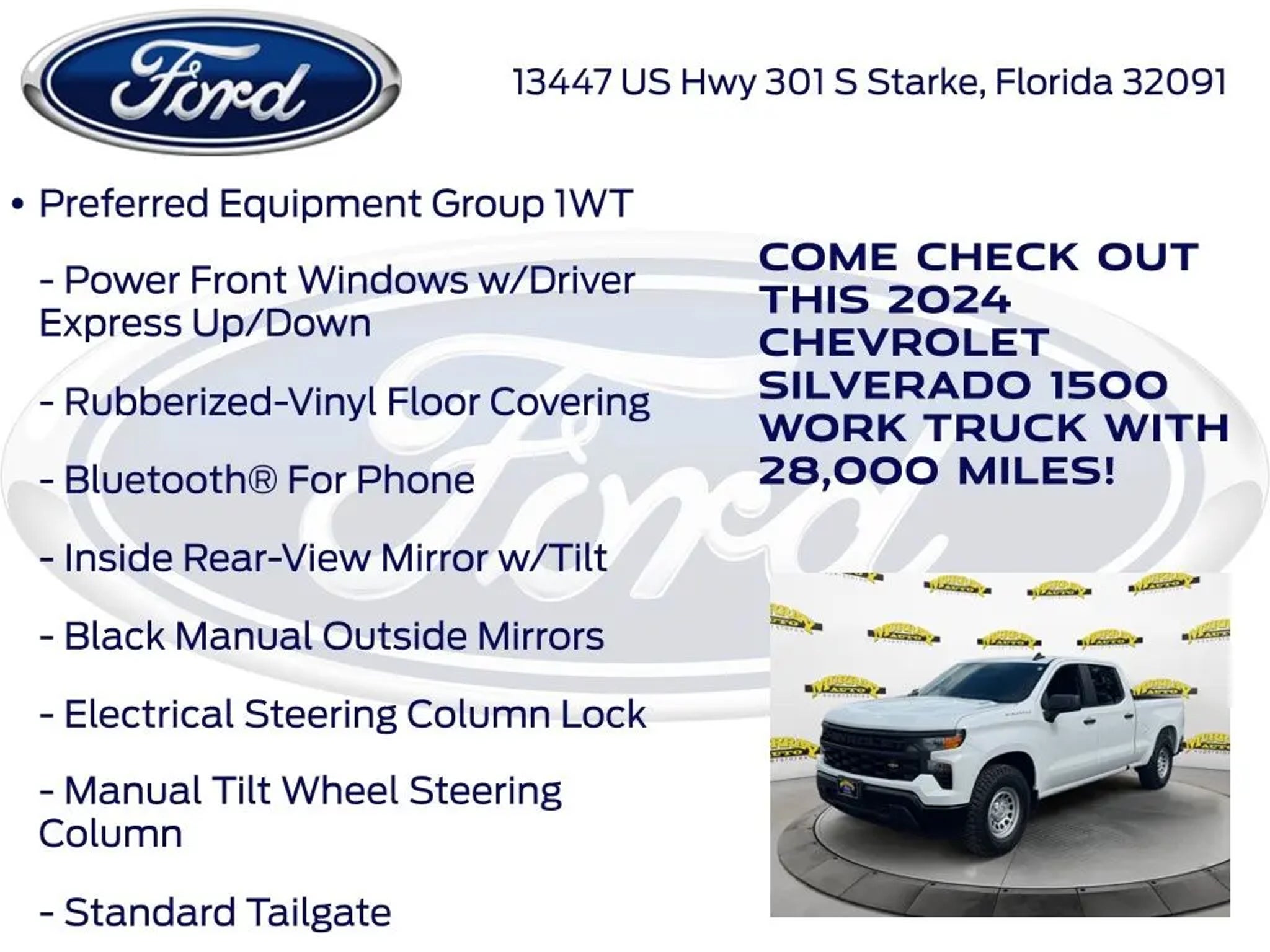 CARFAX One-Owner. Priced below KBB Fair Purchase Price! Murray Ford Superstore of Starke is excited to offer this rock solid 2024 Chevrolet Silverado 1500 in Summit White This vehicle is readily available and comes with the following Preferred Equipment Group 1WT (3.5 Monochromatic Display Driver Info Center, Black (Semi-Gloss) Front Bumper, Black (Semi-Gloss) Rear Bumper, Black Manual Outside Mirrors, Bluetooth® For Phone, Chevrolet Connected Access Capable, Electrical Steering Column Lock, Front Frame-Mounted Black Recovery Hooks, HD Rear Vision Camera, Inside Rear-View Mirror w/Tilt, Locking Tailgate, Manual Tailgate Function w/No EZ Lift, Manual Tilt Wheel Steering Column, OnStar & Chevrolet Connected Services Capable, Power Front Windows w/Driver Express Up/Down, Power Front Windows w/Passenger Express Down, Power Rear Windows w/Express Down, Rear 60/40 Folding Bench Seat (Folds Up), Remote Keyless Entry, Rubberized-Vinyl Floor Covering, SiriusXM Delete, Solar Absorbing Tinted Glass, Standard Tailgate, and Wi-Fi Hot Spot Capable), Standard Suspension Package, WT Convenience Package (Deep-Tinted Glass, Electric Rear-Window Defogger, Electronic Cruise Control, and Heated Power-Adjustable Outside Mirrors), 8-Speed Automatic, Jet Black Vinyl, 220 Amp Alternator, 3.42 Rear Axle Ratio, 4-Wheel Disc Brakes, 40/20/40 Front Split-Bench Seat, 6 Speakers, 6-Speaker Audio System, ABS brakes, Air Conditioning, Auto High-beam Headlights, Automatic Emergency Braking, Brake assist, Chevytec Spray-On Black Bedliner, Compass, Delay-off headlights, Driver door bin, Dual front impact airbags, Dual front side impact airbags, Electronic Stability Control, Following Distance Indicator, Forward Collision Alert, Front anti-roll bar, Front Center Armrest w/Storage, Front Pedestrian Braking, Front reading lights, Front wheel independent suspension, Fully automatic headlights, Illuminated entry, IntelliBeam Automatic High Beam On/Off, Lane Keep Assist w/Lane Departure Warning, Low tire pressure warning, Occupant sensing airbag, Outside temperature display, Overhead airbag, Overhead console, Panic alarm, Passenger door bin, Passenger vanity mirror, Power steering, Power windows, Premium audio system: Chevrolet Infotainment 3, Radio data system, Radio: Chevrolet Infotainment 3 System, Rear reading lights, Rear step bumper, Remote keyless entry, Speed-sensing steering, Split folding rear seat, Tachometer, Tilt steering wheel, Traction control, Trip computer, Variably intermittent wipers, Vinyl Seat Trim, Voltmeter, and Wheels: 17 x 8 Ultra Silver Painted Steel; 15 Year 150,000 mile warranty at no cost applies to all vehicles excluding Transit Vans, DRW Trucks, any SVT Models, or similar vehicles. See sales for details! All vehicles will have a $999.00 dealer fee added to the total sale price (excludes A,Z,D, and X plan customers). Taxes, tag, title fees and a $125 Electronic filling fee will be added to all vehicles in accordance with state laws of customers registering address. *** We make every effort to provide you with the most accurate, up-to-the-minute information, however it is your responsibility to verify with the Dealer that all details listed and installed options are accurate for this specific vehicle. To ensure accuracy, please contact the dealership to verify the exact options, features and programs that are included and are available for this specific vehicle prior to purchase. Price Does not Include any dealer installed options or accessories. *Dealer Discount includes $1000 Finance Bonus Cash and $1000 Trade-In Bonus Cash*