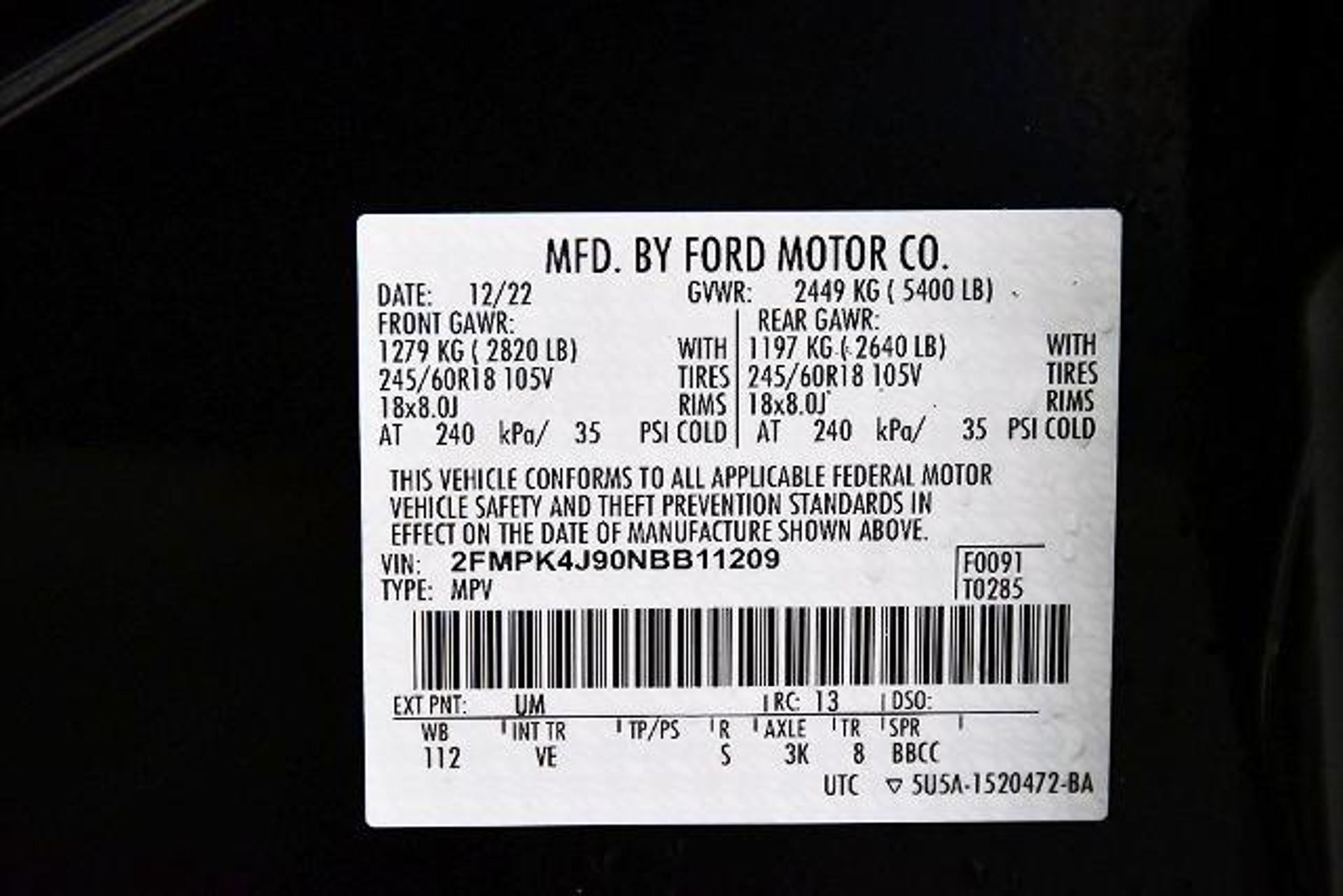 VIN 2FMPK4J90NBB11209