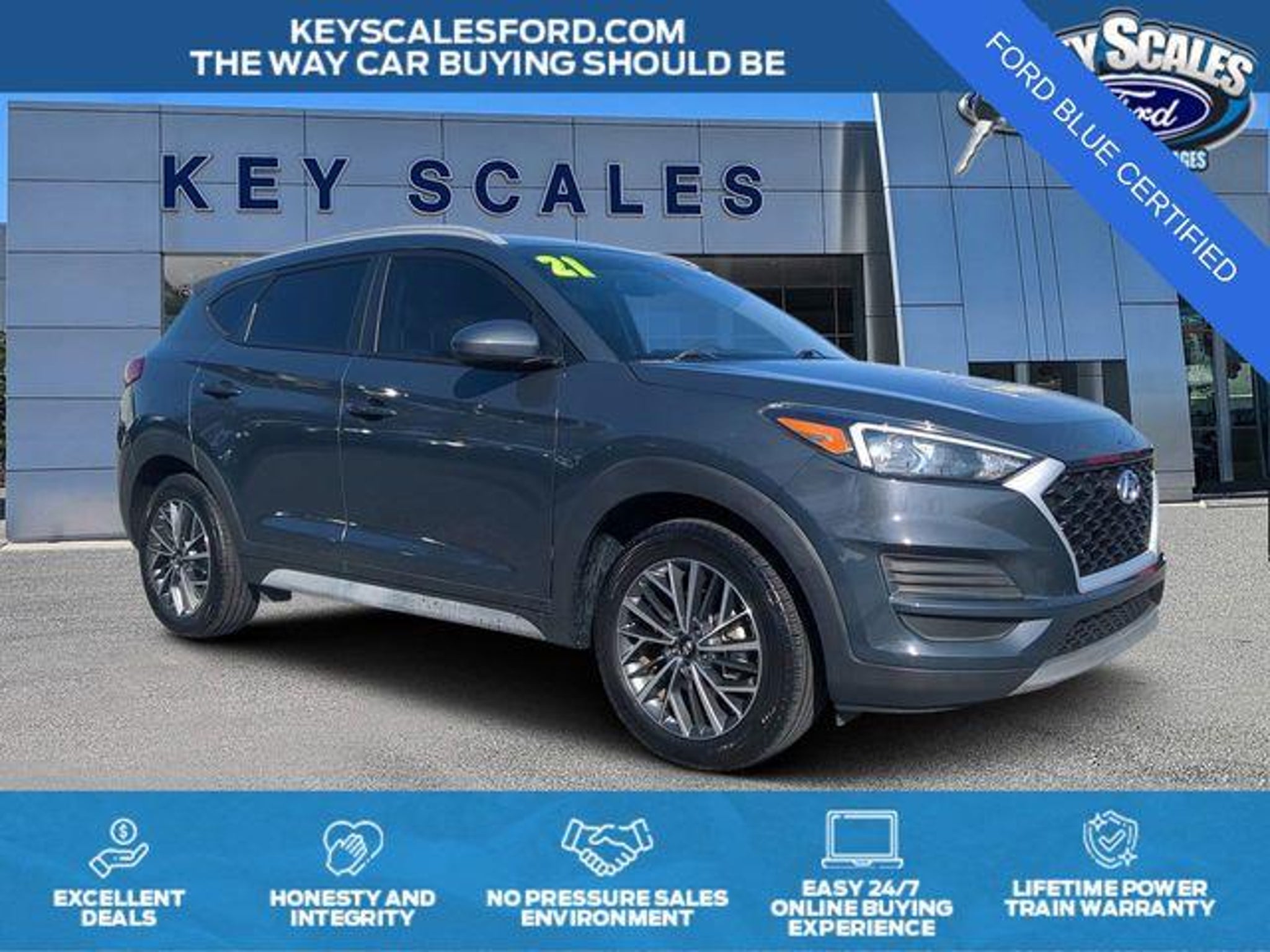 LIFETIME POWERTRAIN WARRANTY!!!!!, 18 x 7.0J Alloy Wheels, 4-Wheel Disc Brakes, 6 Speakers, ABS brakes, Air Conditioning, Alloy wheels, AM/FM radio: SiriusXM, Apple CarPlay & Android Auto, Automatic temperature control, Axle Ratio: 3.064, Brake assist, Bumpers: body-color, Cargo Net, Carpeted Floor Mats, Delay-off headlights, Driver door bin, Driver vanity mirror, Dual front impact airbags, Dual front side impact airbags, Electronic Stability Control, Emergency communication system: Blue Link Connected Car Service (3-year complimentary subscription), Exterior Parking Camera Rear, First Aid Kit, Four wheel independent suspension, Front anti-roll bar, Front Bucket Seats, Front Center Armrest, Front dual zone A/C, Front reading lights, Fully automatic headlights, Heated door mirrors, Heated Front Bucket Seats, Heated front seats, Illuminated entry, Low tire pressure warning, Occupant sensing airbag, Option Group 01, Outside temperature display, Overhead airbag, Overhead console, Panic alarm, Passenger door bin, Passenger vanity mirror, Power door mirrors, Power driver seat, Power steering, Power windows, Radio: AM/FM/SiriusXM Audio System, Rear anti-roll bar, Rear Bumper Applique, Rear seat center armrest, Rear window defroster, Rear window wiper, Remote keyless entry, Roof rack: rails only, Security system, Speed control, Speed-sensing steering, Split folding rear seat, Spoiler, Steering wheel mounted audio controls, Tachometer, Telescoping steering wheel, Tilt steering wheel, Tow Hitch, Traction control, Trip computer, Variably intermittent wipers, YES Essentials Stain-Resistant Cloth Seat Trim. Odometer is 20100 miles below market average! Priced below KBB Fair Purchase Price! 22/28 City/Highway MPG 2021 Hyundai Tucson SEL Dusk Blue FWD 6-Speed Automatic with Shiftronic 2.4L I4 DGI DOHC 16V 4D Sport Utility Key Scales Ford is your home for new and pre-owned Fords in Lake County, Florida. We are the closest Ford dealership to The Villages. We invite you to come for a test drive, schedule service or talk with us about your current vehicle. Our dealership is pet friendly so bring your 4-legged friends and stop by. It has been our pleasure to serve all of Central Florida for 51 years. Our customers travel from The Villages, Eustis, Mt. Dora, Tavares, Fruitland Park, Ocala and right in our backyard here in Leesburg. We would be happy to help you in any way we can, no matter where you are at in the shopping process. Experience the difference here at Key Scales Ford in Leesburg where customer satisfaction and