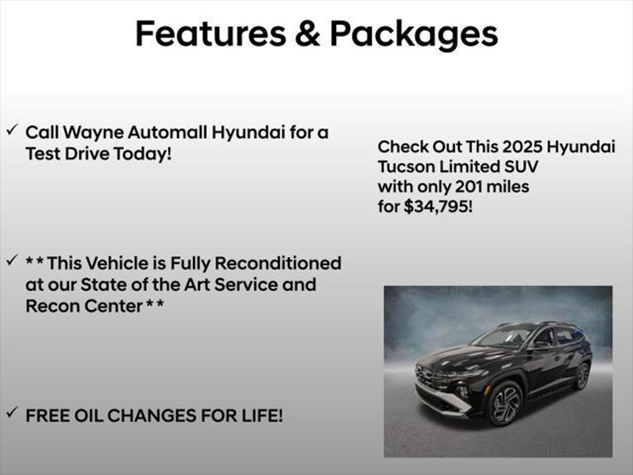 Discover the epitome of modern utility and sophistication with the 2025 Hyundai Tucson Limited. This exceptional SUV combines a sleek exterior, a meticulously crafted interior, and a wealth of advanced features to elevate your driving experience. Indulge in the premium amenities that set this Tucson apart: - Call Wayne Automall Hyundai for a Test Drive Today! - This Vehicle is Fully Reconditioned at our State of the Art Service and Recon Center - FREE OIL CHANGES FOR LIFE! - Side Steps - Illuminated Door Sill Plates - Cross Rails - Carpeted Floor Mats - Cargo Cover - Mud Guards - Cargo Organizer - Cargo Tray - First Aid Kit Powered by a robust 2.5L I4 DGI DOHC 16V LEV3-SULEV30 engine delivering 187 horsepower, this Tucson Limited delivers a dynamic and efficient performance. Paired with an 8-Speed Automatic with SHIFTRONIC and an advanced AWD system, you'll enjoy a seamless and confident ride, whether navigating city streets or exploring the open road. Experience the unparalleled convenience of the Tucson's advanced technology features, including a Navigation System, Bose Premium Audio System, Heads-Up Display, and Bluelink emergency communication system. Stay connected and entertained with Apple CarPlay and Android Auto integration, while the power moonroof and premium leather-trimmed seating add an extra touch of luxury. Hyundai's commitment to safety is evident in the Tucson's comprehensive suite of advanced driver assistance technologies, including Automatic Emergency Braking, Lane Keeping Assist, Blind Spot Monitoring, and more. You can drive with confidence, knowing your loved ones are protected. As a Hyundai Certified Used Vehicle, this Tucson Limited has undergone a rigorous 173-point inspection and comes with a comprehensive warranty and roadside assistance package. Enjoy the peace of mind that comes with owning a vehicle that has been meticulously reconditioned and backed by Hyundai's industry-leading certification program. Elevate your driving experience with the 2025 Hyundai Tucson Limited. Contact us today to schedule a test drive and discover the perfect balance of style, performance, and technology that this exceptional SUV has to offer.