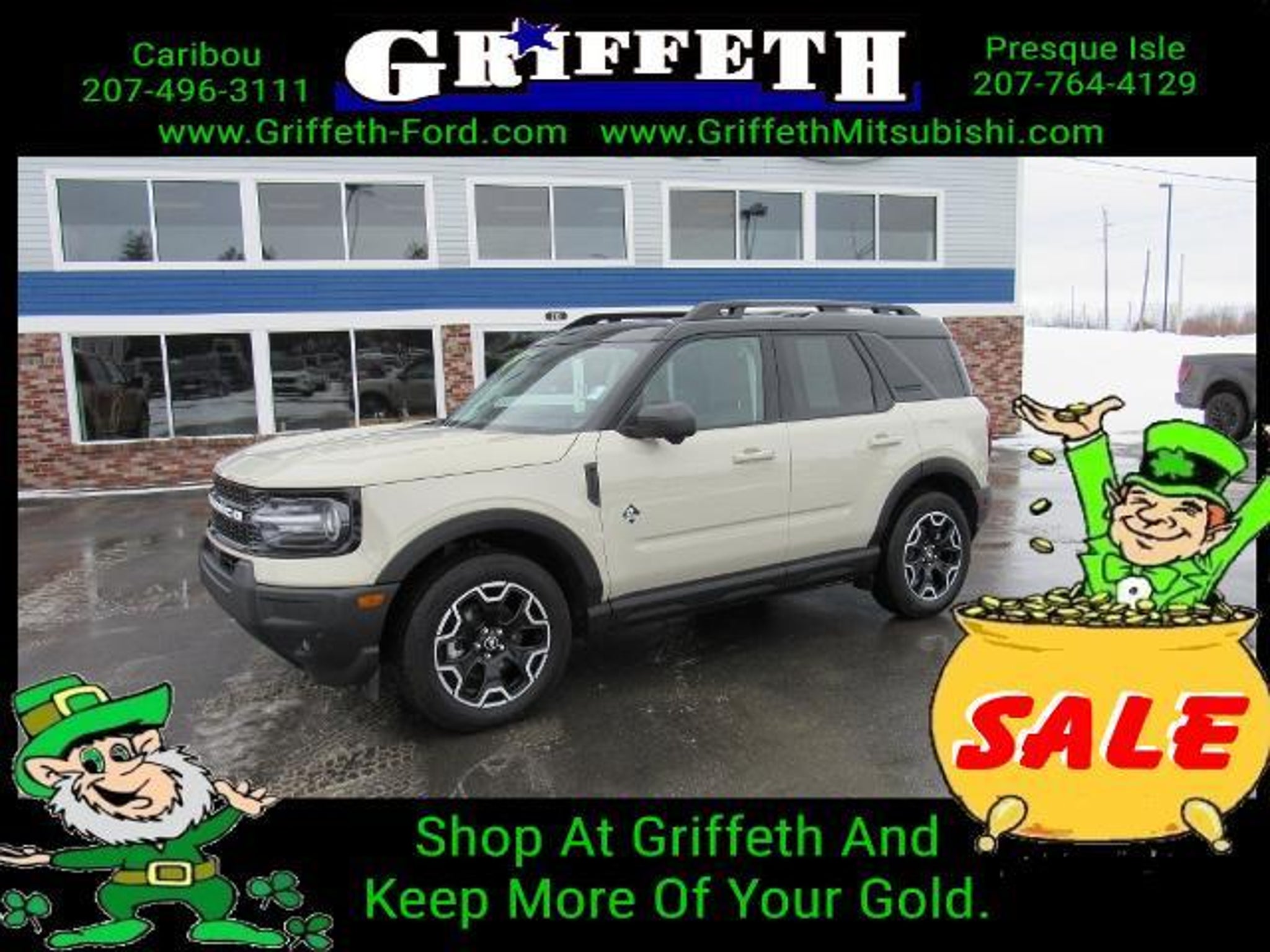 Details > 2025 Ford Bronco Sport AWD Outer Banks 4DR SUV For Sale in Caribou, ME Private Party Sellers Click here to place your ad now! You auta tell them you saw the ad in AutaBuy when you call or email. 1/21 2/21 3/21 4/21 5/21 6/21 7/21 8/21 9/21 10/21 11/21 12/21 13/21 14/21 15/21 16/21 17/21 18/21 19/21 20/21 21/21 View 21 Photos View All Add to My Garage Parked in Your Garage! Griffeth Ford Contact Seller: I would like to: Make Offer Check Availability Ask A Question Request More Photos Check Financing Options Send a copy of this message to me Add this listing to my garage Send to Mobile Mileage 16,966 Exterior Color Desert Sand Doors 4 Engine 1.5L I3 Transmission 8 Speed Auto Stock # A7610 VIN 3FMCR9CN2SRE07539 Estimated Monthly Payment $574 mo Apply Now J.J. Best Banc & Co. 2025 Ford Bronco Sport AWD Outer Banks 4DR SUV Description: · Mileage: 16,966 · Color: Desert Sand Price: $32,995. Mileage 16,966 Exterior Color Desert Sand Doors 4 Engine 1.5L I3 Transmission 8 Speed Auto Stock # A7610 VIN 3FMCR9CN2SRE07539 Estimated Monthly Payment $574 mo Apply Now J.J. Best Banc & Co. Add to My Garage Parked in Your Garage! Message Seller Griffeth Ford Contact Seller: I would like to: Make Offer Check Availability Ask A Question Request More Photos Check Financing Options Send a copy of this message to me Add this listing to my garage Offered for sale by Griffeth Ford CARIBOU, ME Price: $32,995. Offered for sale by Griffeth Ford CARIBOU, ME [entire inventory] Ask Auta Intelligence The first collector-car AI built directly into a classic car marketplace How many of these were produced? What factory options were available on this model? When was this model first introduced? Where is this located? How far is this from me? What trim levels were available for this model? What kind of mileage do these get? What engine options did these come with? What does this VIN number tell me? How many Bronco Sports were produced in Desert Sand? How many passengers can this seat comfortably? What colors did these come in? How easy are parts to find for this model? Tell me more about this model What transmission options did these offer? Can you show me more suvs for a similar price? What safety features does this model offer? Do you have a similar car to sell? List It Now! Questions about this car? Ask Auta Intelligence for production numbers, available options, etc. · Subscribe to AutaBuy! · Send a Gift Subscription Notice to a Friend