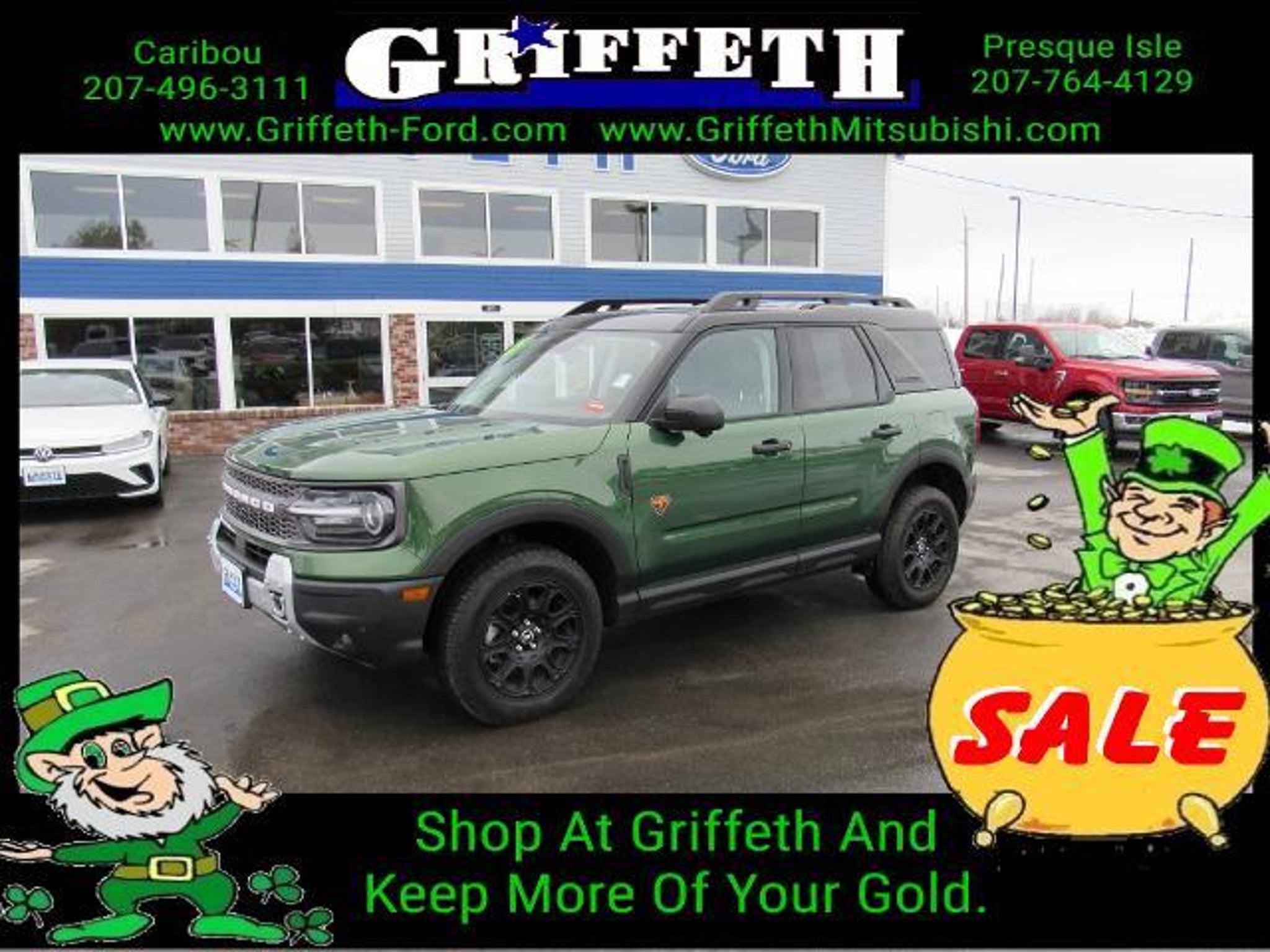 Details > 2025 Ford Bronco Sport AWD Badlands 4DR SUV For Sale in Caribou, ME Private Party Sellers Click here to place your ad now! You auta tell them you saw the ad in AutaBuy when you call or email. 1/19 2/19 3/19 4/19 5/19 6/19 7/19 8/19 9/19 10/19 11/19 12/19 13/19 14/19 15/19 16/19 17/19 18/19 19/19 View 19 Photos View All Add to My Garage Parked in Your Garage! Griffeth Ford Contact Seller: I would like to: Make Offer Check Availability Ask A Question Request More Photos Check Financing Options Send a copy of this message to me Add this listing to my garage Send to Mobile Mileage 7,479 Exterior Color Green Doors 4 Engine 2.0L I4 Transmission 8 Speed Auto Stock # A7613 VIN 3FMCR9DA4SRE46077 Estimated Monthly Payment $644 mo Apply Now J.J. Best Banc & Co. 2025 Ford Bronco Sport AWD Badlands 4DR SUV Description: · Mileage: 7,479 · Color: Green Price: $36,995. Mileage 7,479 Exterior Color Green Doors 4 Engine 2.0L I4 Transmission 8 Speed Auto Stock # A7613 VIN 3FMCR9DA4SRE46077 Estimated Monthly Payment $644 mo Apply Now J.J. Best Banc & Co. Add to My Garage Parked in Your Garage! Message Seller Griffeth Ford Contact Seller: I would like to: Make Offer Check Availability Ask A Question Request More Photos Check Financing Options Send a copy of this message to me Add this listing to my garage Offered for sale by Griffeth Ford CARIBOU, ME Price: $36,995. Offered for sale by Griffeth Ford CARIBOU, ME [entire inventory] Ask Auta Intelligence The first collector-car AI built directly into a classic car marketplace Where is this located? What factory options were available on this model? How many Bronco Sports were produced in Green? Can you show me more suvs for a similar price? What colors did these come in? What engine options did these come with? When was this model first introduced? How far is this from me? Tell me more about this model How easy are parts to find for this model? How many passengers can this seat comfortably? What safety features does this model offer? What trim levels were available for this model? What transmission options did these offer? How many of these were produced? What does this VIN number tell me? What kind of mileage do these get? Do you have a similar car to sell? List It Now! Questions about this car? Ask Auta Intelligence for production numbers, available options, etc. · Subscribe to AutaBuy! · Send a Gift Subscription Notice to a Friend
