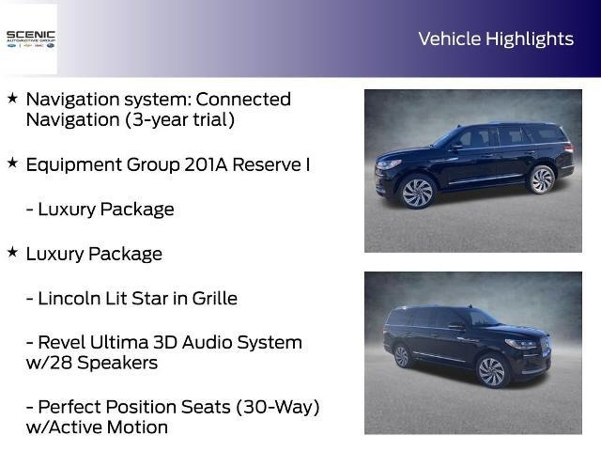 This 2022 Lincoln Navigator Reserve is a true standout in the luxury SUV segment. With its sleek black exterior and powerful V6 engine paired with a 10-speed automatic transmission and 4-wheel drive, this Navigator is built to impress. Boasting an impressive array of premium features, this Navigator Reserve is equipped with: - Luxury Package - Perfect Position Seats (30-Way) with Active Motion, power thigh extender, head restraints, and auto heated/ventilated with memory - Illuminated 1st & 2nd Row Seat Belts - Lincoln Lit Star in Grille - Revel Ultima 3D Audio System with 28 Speakers and subwoofer - Panoramic Vista Roof - Power Liftgate - Heated steering wheel, front seats, and rear seats - Ventilated front and rear seats - Rain-sensing wipers Beyond these impressive features, the Navigator Reserve also boasts a wealth of advanced technology, including a Voice-Activated Touchscreen Navigation System, SYNC 4 Communications & Entertainment System, and 911 Assist for added peace of mind. With its spacious and luxurious interior, the Navigator Reserve offers an unparalleled driving experience. The 30-way Perfect Position Seats provide exceptional comfort and support, while the Revel Ultima 3D Audio System delivers a truly immersive listening experience. The Panoramic Vista Roof fills the cabin with natural light, creating a serene and airy ambiance. Whether you're embarking on a family road trip or navigating the daily commute, this 2022 Lincoln Navigator Reserve is the perfect companion. Its powerful performance, advanced technology, and premium amenities make it a standout choice in the luxury SUV market. Thank you for choosing Scenic Automotive as your next destination to purchase a vehicle. We have been in business for over 65 years serving the local community. We are family owned and local! We also serve the Southern Virginia community, Greensboro, Winston-Salem, and all the way out to Asheville and into East Tennessee! Please visit online at www.scenicmotors.com or www.scenicgmautos.com.