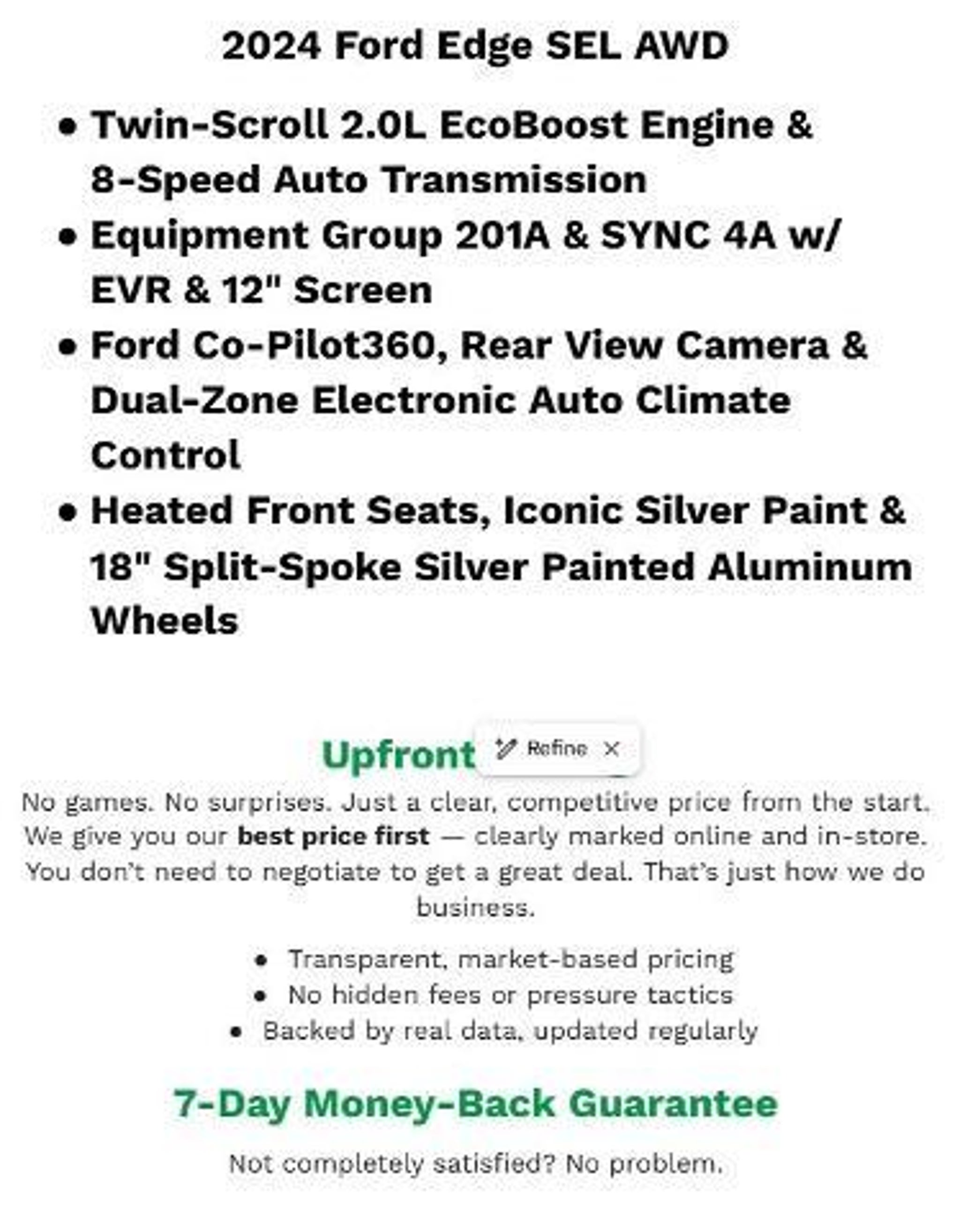 Recent Arrival! 2024 Ford Edge SEL CARFAX One-Owner. Clean CARFAX. Iconic Silver Metallic AWD EcoBoost 2.0L I4 GTDi DOHC Turbocharged VCT21/28 City/Highway MPGBergstrom Ford of Oshkosh wants to buy your vehicle - even if you don't buy ours. Get your free and quick offer to purchase. To get our top dollar offer, call our Bergstrom Buying Team Hotline at 920-429-6222 Equipment Group 201A, Sport Appearance Package (Dark Carbonized Gray Lower Front Bumper, Black Beltline Molding, Pillar Black Grille Bars, Pillar Black Mirror Caps, Door Inserts w/Navy Pier Accent Stitching, ActiveX Trimmed Htd Bucket Seats, Paragon Instrument Panel Appliques, Black Roof-Rack Side Rails, and Wheels: 18 Carbonized Gray-Painted Aluminum), Convenience Package (Power Liftgate, Fog Lamps w/Iconic Silver Bezel, Wireless Charging Pad, Universal Garage Door Opener (UGDO), 110V/150W AC Power Outlet, Remote Start System, and Perimeter Alarm), Class II Trailer Tow Package, Cargo Accessory Package (Rear Bumper Protector, Cargo Mat, and Retractable Cargo Area Cover), Ford Co-Pilot360 Assist (Leather-Wrapped Steering Wheel, Evasive Steering Assist, Connected Navigation, Adaptive Cruise Control w/Stop & Go, and Lane Centering), Engine Block Heater, Front License Plate Bracket, Active Transmission Warm-Up, Front & Rear Mudflaps Kit, Power door mirrors, Heated door mirrors, Spoiler, Bumpers: body-color, Front & Rear Floor Liners w/o Carpet Mats, Front & Rear Floor Liners w/Carpet Mats, Heated Steering Wheel, Unique Cloth Heated Bucket Seats, Cooler Bag w/Adjustable Carrying Strap, Center Console Vault w/Coded Lock, ActiveX Trimmed Heated Bucket Seats, Driver vanity mirror, Driver door bin, Front reading lights, Tilt steering wheel, Overhead console, Leather steering wheel, Rear seat center armrest, Outside temperature display, Illuminated entry, Passenger vanity mirror, Auto-dimming Rear-View mirror, Compass, Telescoping steering wheel, Trip computer, Rear reading lights, Tachometer, Front dual zone A/C, Air Conditioning, Automatic temperature control, Rear window defroster, Power windows, Power driver seat, Steering wheel mounted audio controls, Power steering, Remote keyless entry, SiriusXM w/360L, AM/FM Stereo, SYNC 4A w/Enhanced Voice Recognition, 6 Speakers, AM/FM radio: SiriusXM with 360L, FordPass Connect, Overhead airbag, Dual front side impact airbags, Low tire pressure warning, Occupant sensing airbag, Front anti-roll bar, Knee airbag, 4-Wheel Disc Brakes, Dual front impact airbags, Rear anti-roll bar, ABS brakes